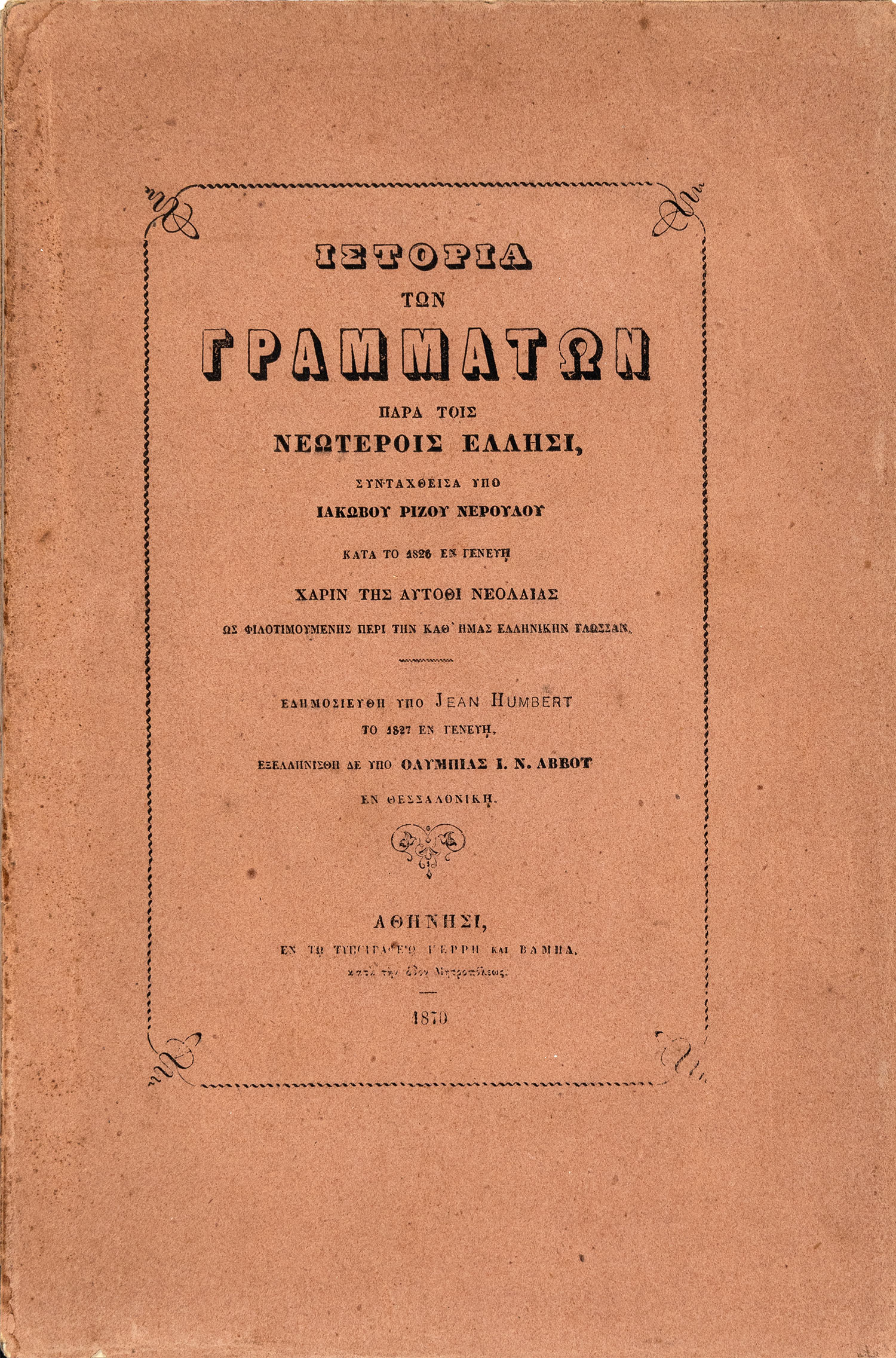 Ἱστορία τῶν γραμμάτων παρά τοῖς νεωτέροις Ἕλλησι, συνταχθεῖσα ὑπό Ἰακώβου Ρίζου Νερουλοῦ κατά τό1826 ἐν Γενεύῃ χάριν τῆς αὐτόθι νεολαίας ὡς φιλοτιμουμένης περί τήν καθ’ ἡμᾶς ἑλληνικήν γλῶσσαν, ἐδημοσιεύθη ὑπό Jean Humbert τό 1827 ἐν Γενεύῃ, ἐξελληνίσθη δέ ὑπό Ὀλυμπίας Ι. Ν. Ἄββοτ ἐν Θεσσαλονίκῃ.