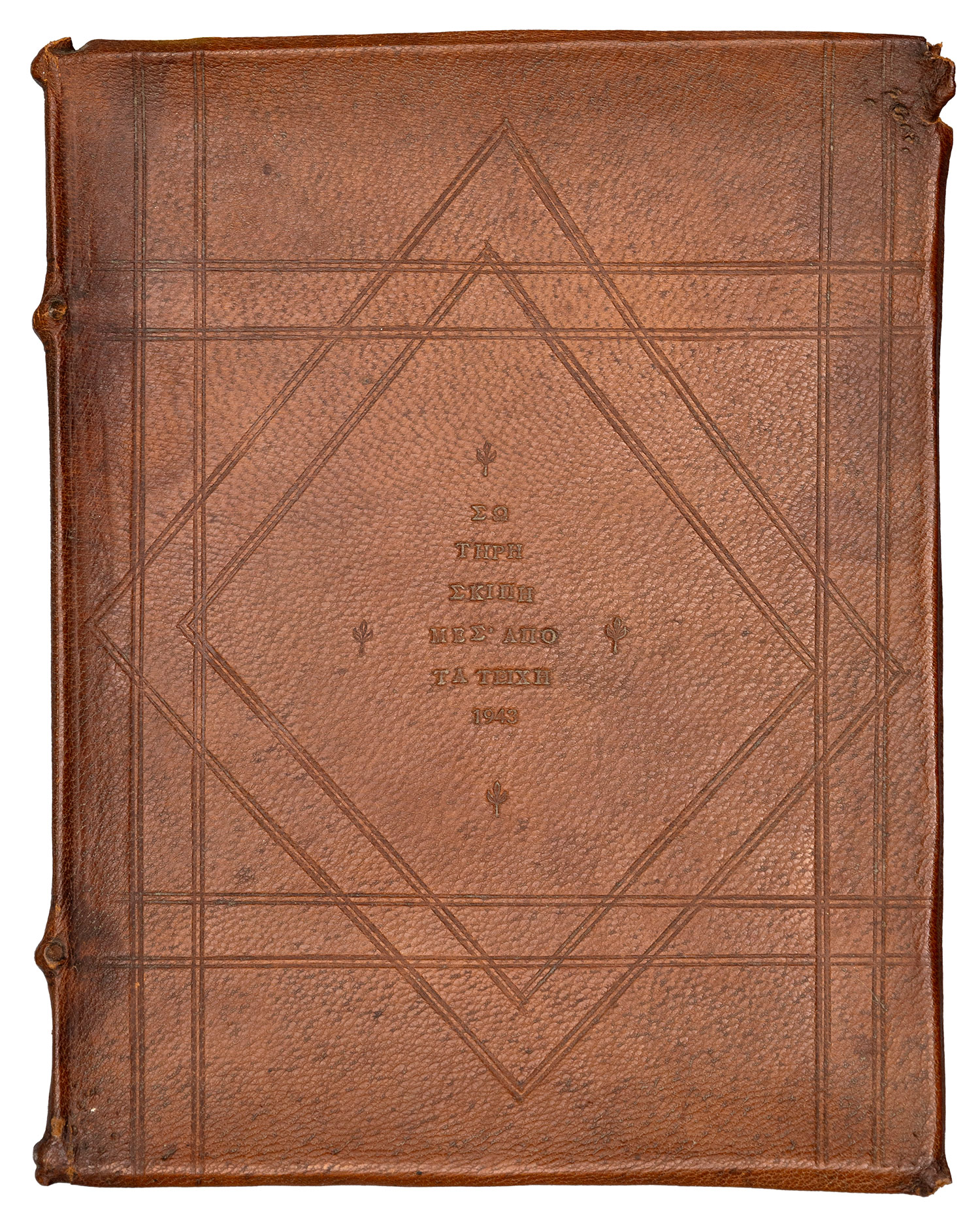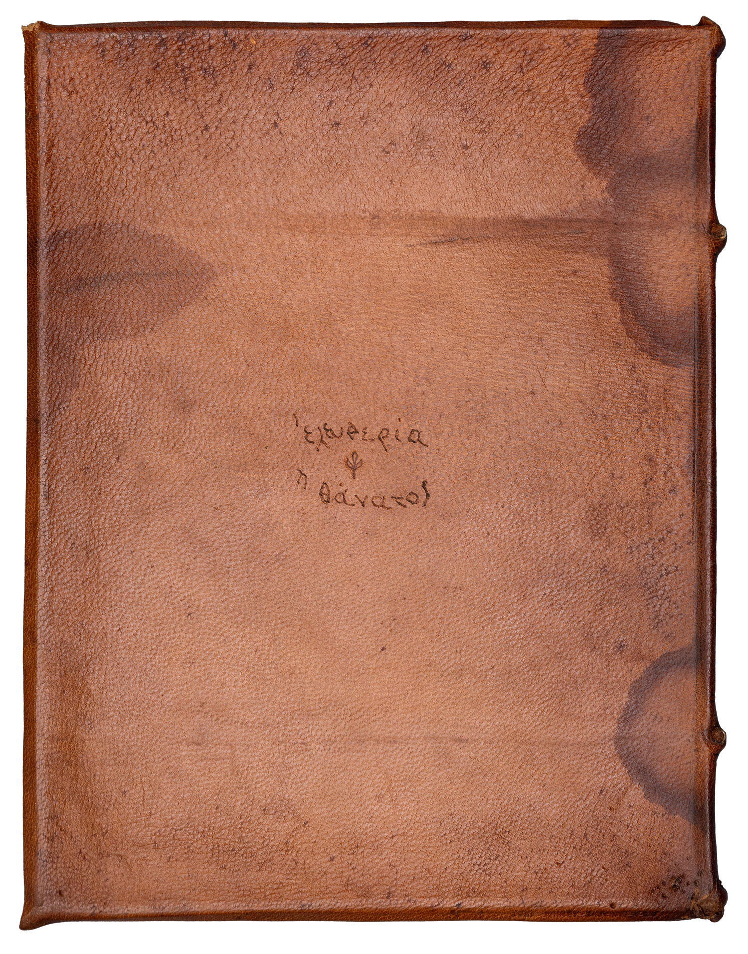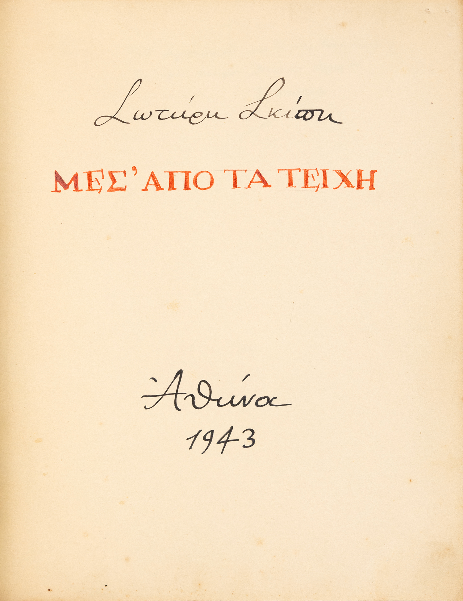 ιδιόχειρη αφιέρωση («Τοῦ ἀγαπητοῦ μου Κώστα Καμπάνη / ἐνθύμιο πικρῶν ἐθνικῶν ἡμερῶν / Σ. Σκίπης»). Δέρμα με εμπίεστη διακόσμηση (λίγο σκεβρωμένο, μικρές φθορές, λεκέδες στο κάτω κάλυμμα, τίτλος στο πάνω, έχουν διατηρηθεί τα αρχικά εξώφυλλα, λερωμένα, συμπληρωμένα δύο μικρά τμήματα στο πάνω και το κάτω αντίστοιχα).