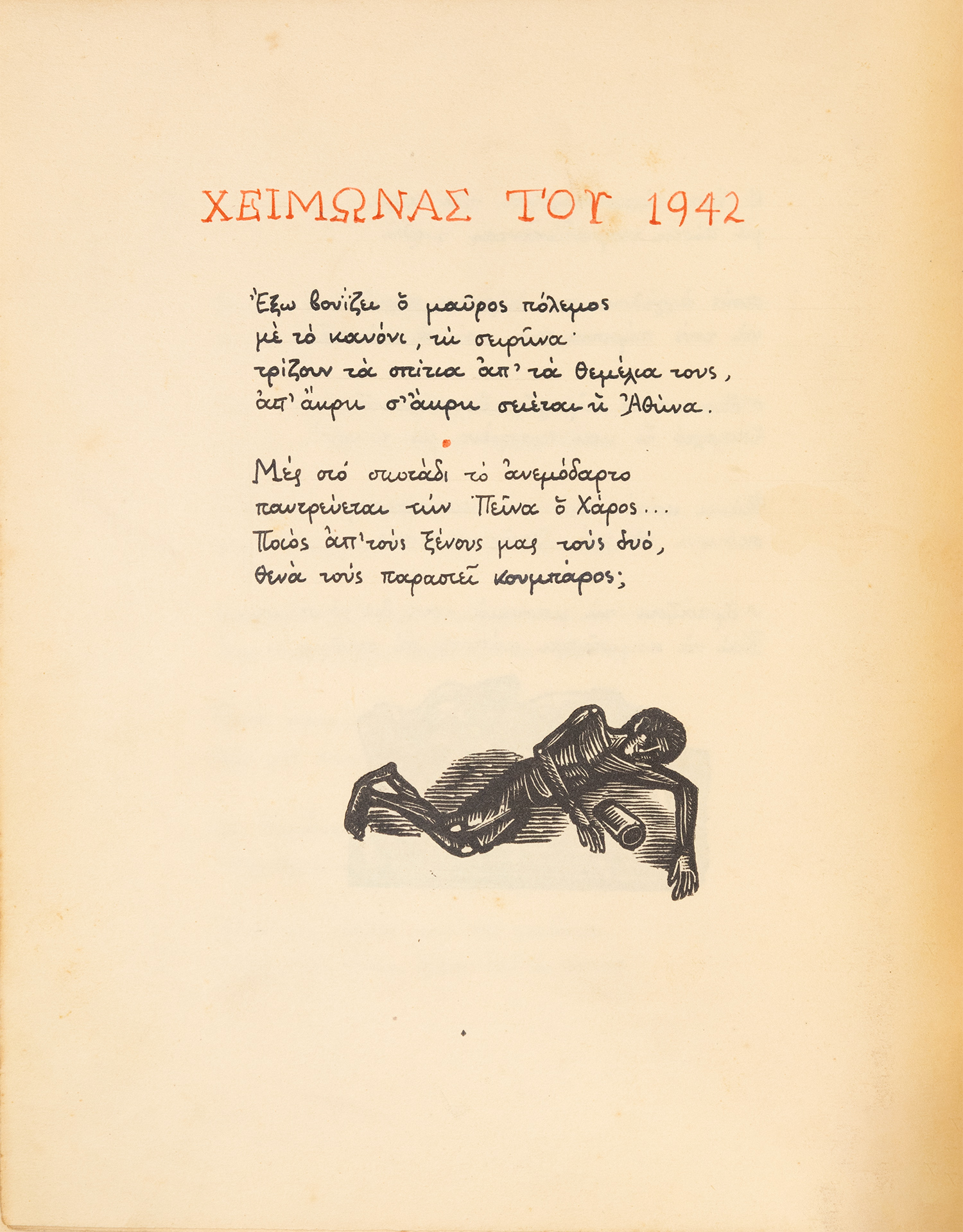 Τιμή εκτίμησης: € 1.200 - 1.600224 x 172 mm., [64] σ. (ελαφρά οξειδωμένο). Έκδοση σε 105 αριθμημένα αντίτυπα, με χειρόγραφο το μέχρι τότε αδημοσίευτο κείμενο και ξυλογραφίες του Σπύρου ΒΑΣΙΛΕΙΟΥ, όλα τα αντίτυπα υπογεγραμμένα από τον ποιητή, η πρώτη ξυλογραφία αριθμημένη, υπογεγραμμένη και χρονολογημένη από τον καλλιτέχνη, ένα από τα 25 πρώτα αντίτυπα με το πρώτο ποίημα γραμμένο από τον ποιητή, αντίτυπο με