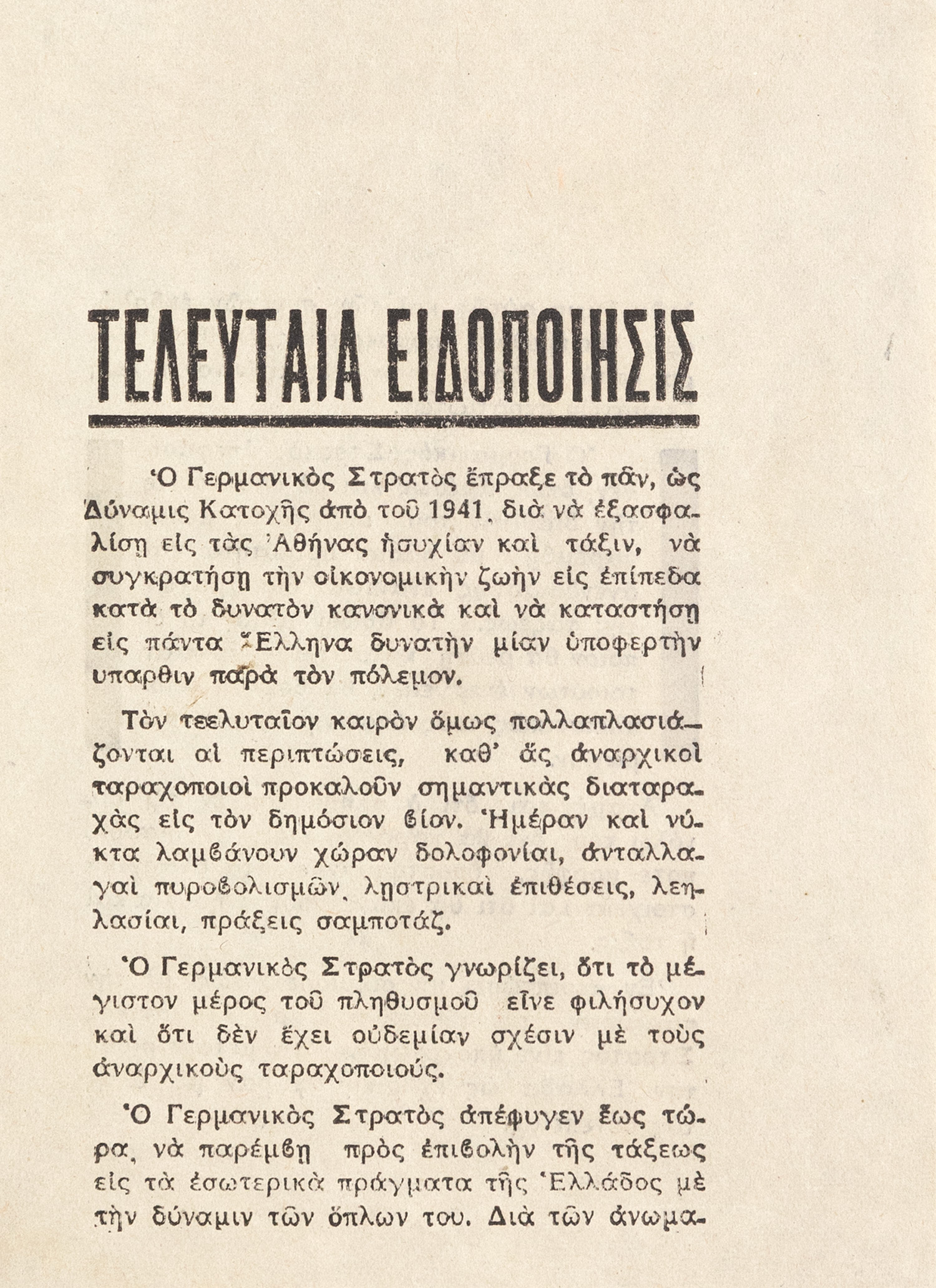 ΤΕΛΕΥΤΑΙΑ ΕΙΔΟΠΟΙΗΣΙΣ. Ὁ Γερμανικὸς Στρατὸς ἔπραξε τὸ πᾶν, ὡς Δύναμις Κατοχῆς ἀπὸ τοῦ 1941, διὰ νὰ ἐξασφαλὶσῃ εἰς τὰς Ἀθήνας ἡσυχίαν καὶ τάξιν, νὰ συγκρατὴσῃ τὴν οἰκονομικὴν ζωὴν εἰς ἐπίπεδα κατὰ τὸ δυνατὸν κανονικὰ καὶ νὰ καταστὴσῃ εἰς πάντα Ἕλληνα δυνατὴν μίαν ὑποφερτὴν υπαρθιν [sic] παρὰ τὸν πόλεμον. Τὸν τεελυταῖον [sic] καιρὸν ὅμως πολλαπλασιάζονται αἱ περιπτώσεις, καθ’ ἅς ἀναρχικοὶ ταραχοποιοὶ προκαλοῦν σημαντικὰς διαταραχὰς εἰς τὸν δημόσιον βίον. [...] Ὁ Γερμανικὸς Στρατὸς ἀπεφάσισεν, ὅπως ἀμέσως καὶ μὲ ὅλα τὰ εἰς τὴν διάθεσίν του ὑπάρχοντα μέσα, παρὲμβῃ μὲ πᾶσαν δριμύτητα καὶ ἀνενδοιάστως ἐναντίον διαταραχῶν τῆς τάξεως. Τὸ ἀθῶον αἷμα, τὸ ὁποῖον θὰ ρεύσῃ κατὰ τὴν διάρκειαν τοιούτων ἐνεργειῶν, θὰ βαρὺνῃ ἀποκλειστικῶς τοὺς ὑποκινητὰς τῶν ταραχῶν... [τελειώνει:] Ἐν περιπτώσει μὴ συμμορφώσεως μὲ τὴν παροῦσαν προειδοποίησιν, ὁ Γερμανικὸς Στρατὸς εἶνε ὑποχρεωμένος νὰ μεταχειρισθῇ τὴν Ἑλλάδα ὡς ἐχθρικὴν χώραν μὲ ὅλας τὰς συνεπείας.