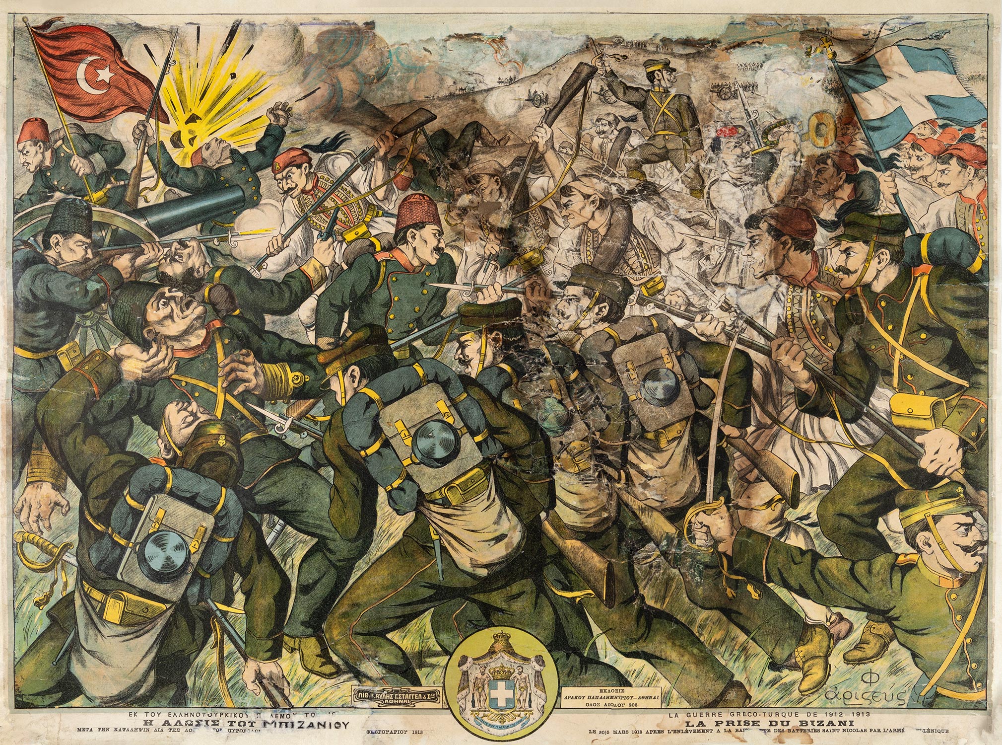 Ἐκ τοῦ ἑλληνοτουρκικοῦ πολέμου τοῦ 1912-1913: Ἡ ἅλωσις τοῦ Μπιζανίου μετά τήν κατάληψιν διά τῆς λόγχης τῶν πυροβόλων τοῦ Ἁγίου Νικολάου τῇ 20 Φεβρουαρίου 1913.