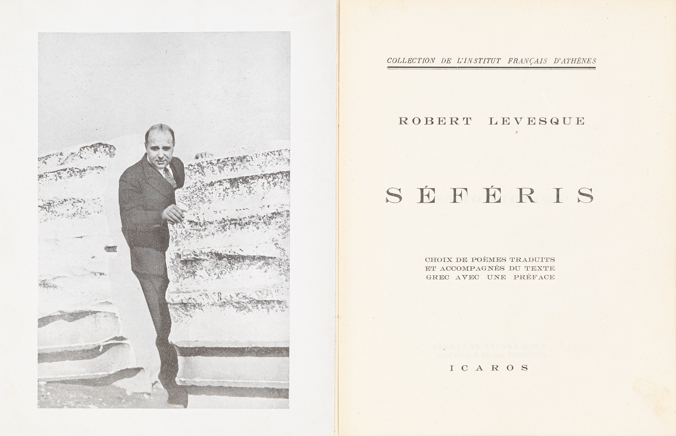 Τιμή εκτίμησης: € 150 - 200ΠΡΩΤΗ ΕΚΔΟΣΗ, σε 1850 αντίτυπα. 203 σ. Ελληνικό κείμενο και γαλλική μετάφραση σε αντικριστές σελίδες, με μία βαθυτυπική αναπαραγωγή φωτογραφικού πορτραίτου του ποιητή σε θέση προμετωπίδας, αντίτυπο με ιδιόχειρη αφιέρωση του Γ. Σεφέρη εκ μέρους του μεταφραστή στην αδελφή της Μαρώς Σεφέρη («À la très docte, à la très [chère] / et très hospitalière amie, / Madame Marouli, / [pour] Robert Levesque / Georges Seferis / Athènes 4.12.45»). Αρχικά εξώφυλλα (μικρές φθορές, ελαφρά λερωμένο το κάτω, χαλαρωμένη η πάνω σύνδεση, ex-libris της Αμαρυλλίδας (Μαρούλης) Ζάννου-Δραγούμη). Δασκαλόπουλος Γ1.