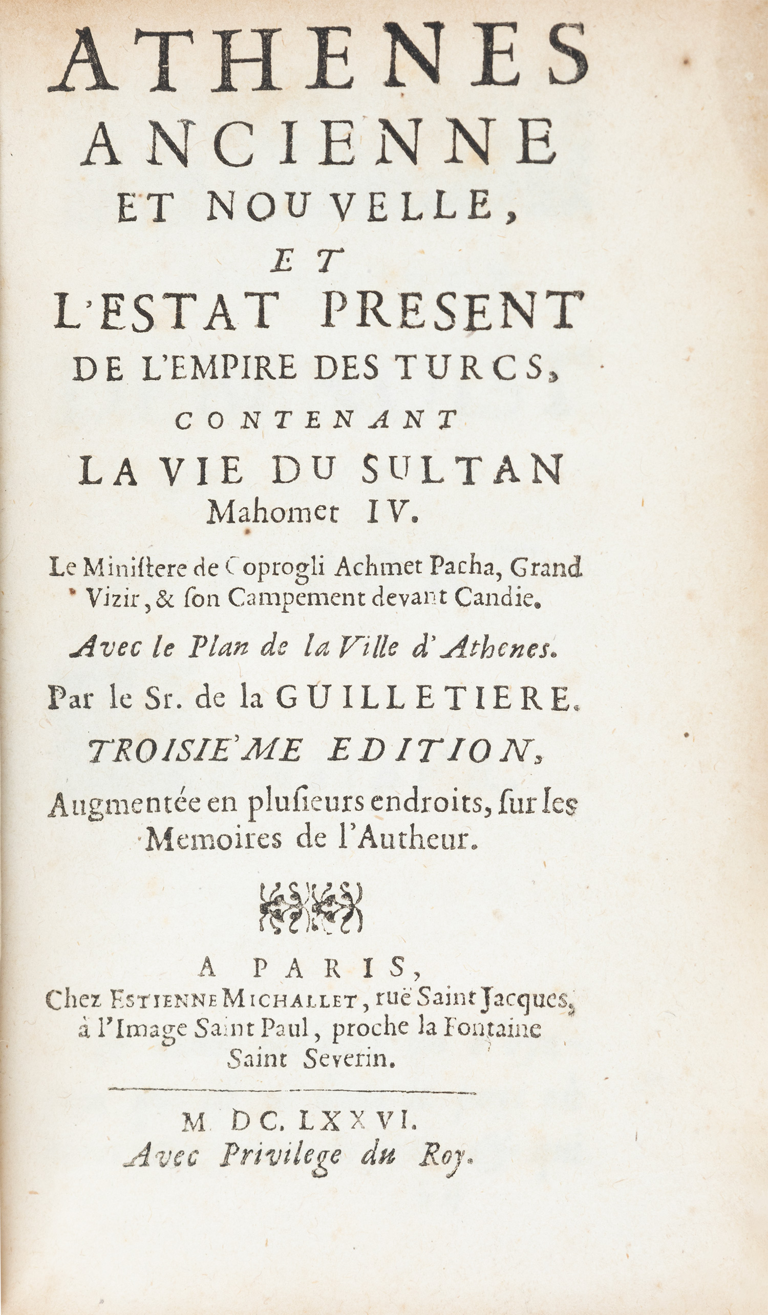 Athenes ancienne et nouvelle, et l’estat present de l’empire des Turcs, contenant la vie du Sultan Mahomet IV. Troisième édition.