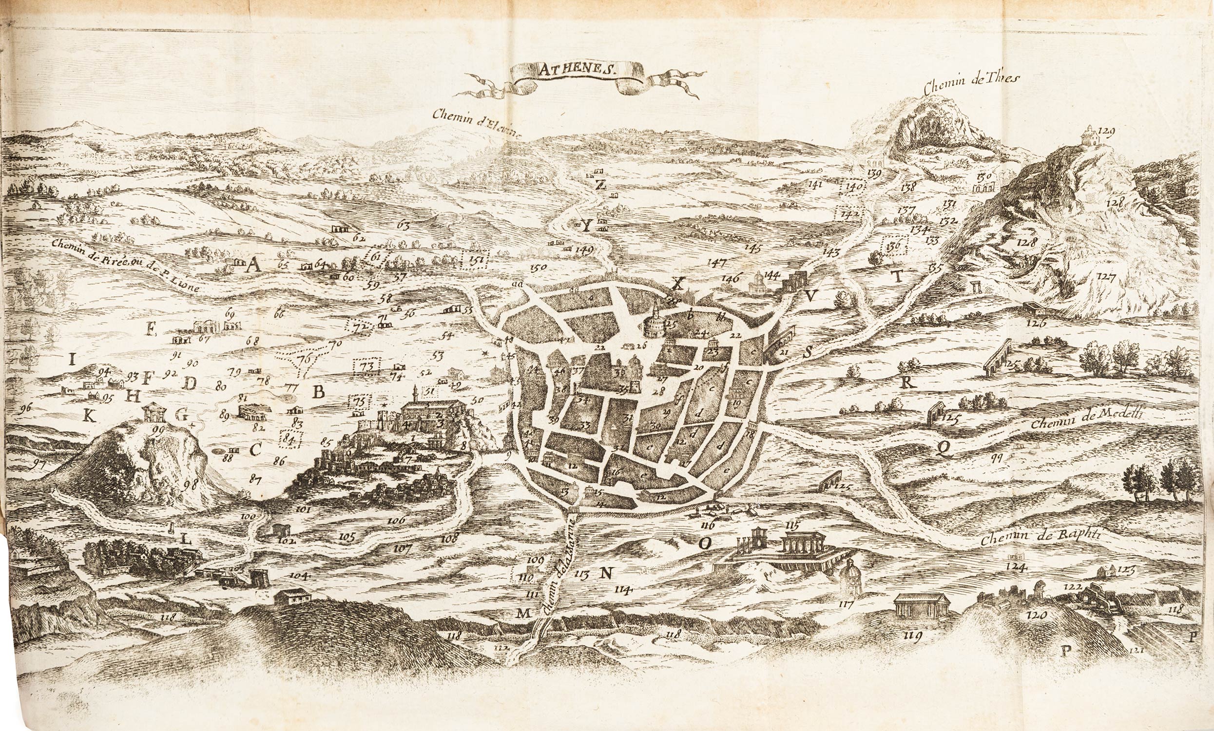 Τιμή εκτίμησης: € 300 - 40012o (151 x 91 mm.), 456 σ. (λείπει ο πίνακας με το αρχαίο θέατρο, πολύ ελαφρά οξειδωμένο αντίτυπο). Με μία αναδιπλούμενη χαλκόγραφη άποψη της Αθήνας. Περγαμηνή της εποχής της έκδοσης (λείπουν μικρά τμήματα από τη ράχη). Weber, II, 365, πρβ. Blackmer 766 («[the] most ingenious and successful literary hoax»), Atabey 540. • Η πρωτοτυπία αυτού του έργου, που υποτίθεται ότι βασίστηκε σε πληροφορίες που συγκέντρωσε στην Αθήνα ο αδελφός του συγγραφέα, αμφισβητήθηκε έντονα από τον Jacob Spon. Ενδιαφέρον παρουσιάζει η άποψη της Αθήνας, που όπως φαίνεται χαράχτηκε με βάση το σχέδιο των Καπουτσίνων (1670).