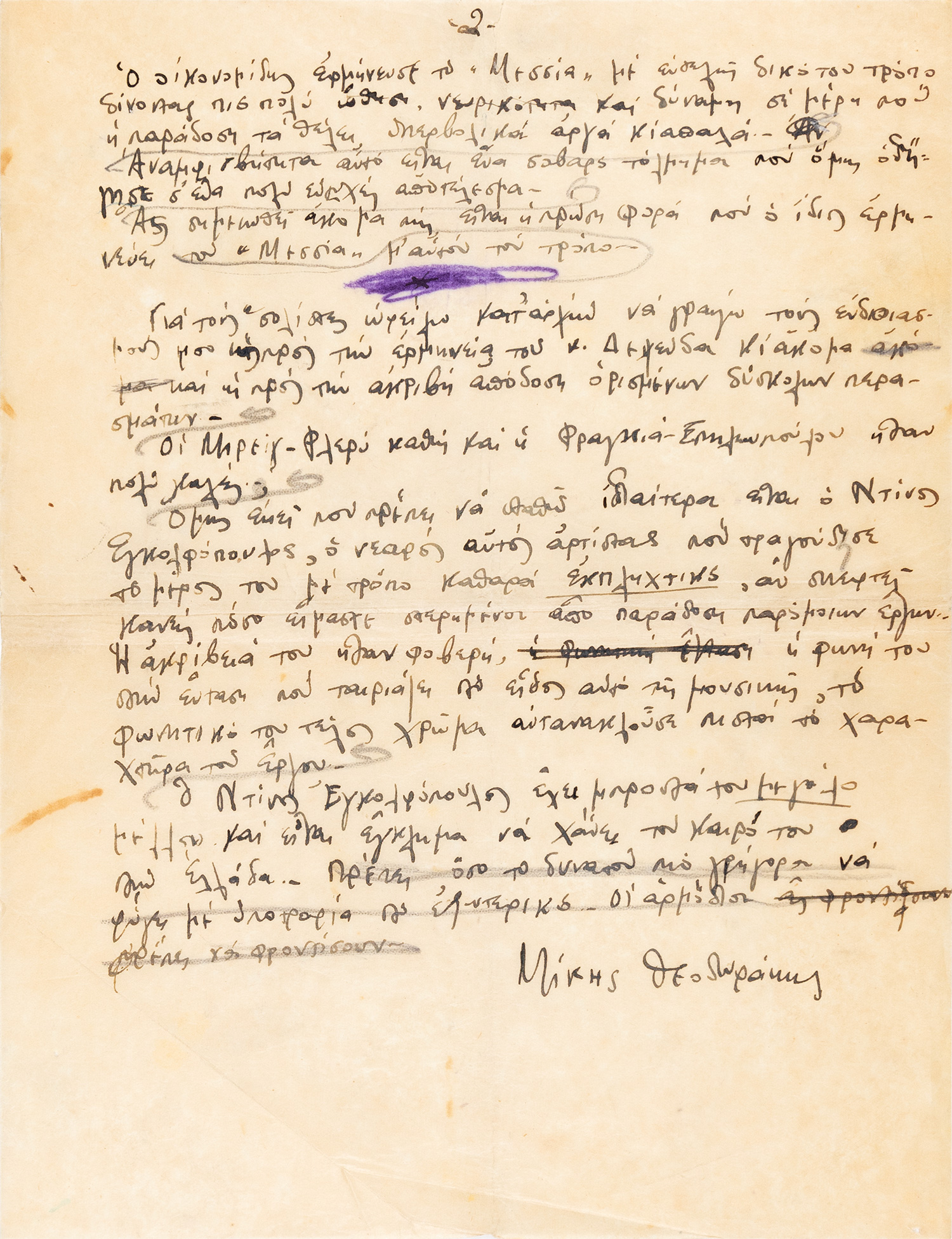 Αὐτόγραφη κριτικὴ μὲ τὴν ὑπογραφὴ τοῦ («Μίκης Θεοδωράκης») γιὰ τὴν παρουσίαση τοῦ ὀρατορίου τοῦ Handel «Μεσσίας» ἀπὸ τὴν Χορωδία Ἀθηνῶν ὑπὸ τὴν διεύθυνση τοῦ Φιλοκτήτη Οἰκονομίδη.