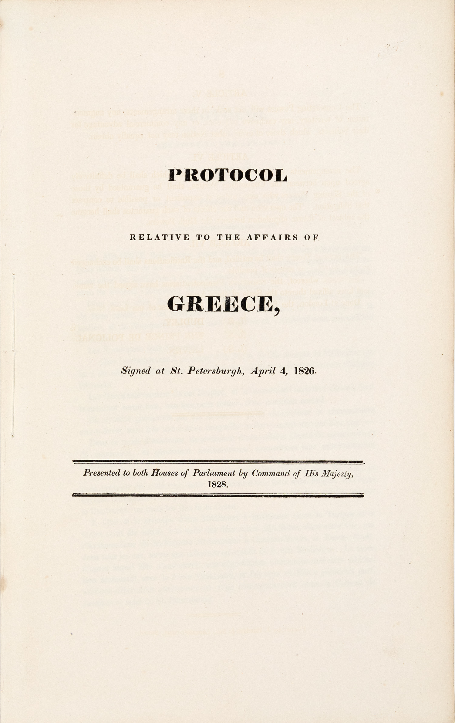 Protocol relative to the affairs of Greece, signed at St. Petersburgh, April 4, 1826, presented to both Houses of Parliament by command of His Majesty, 1828.