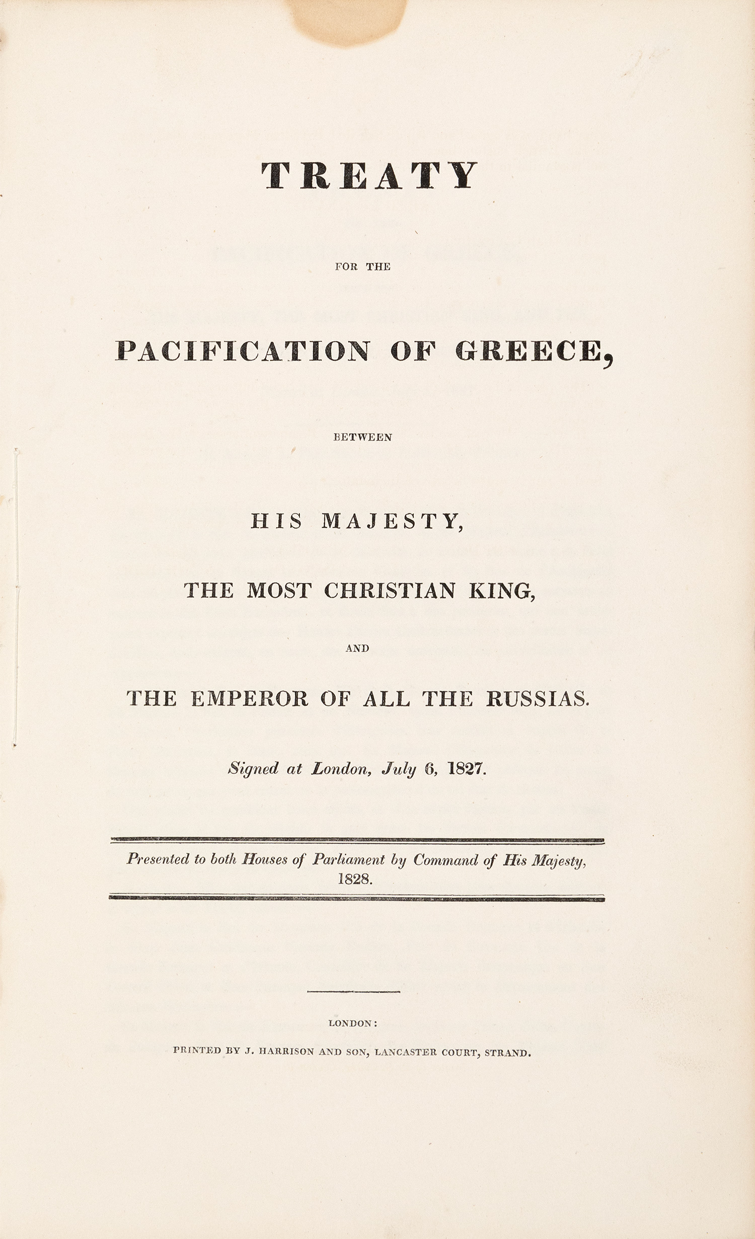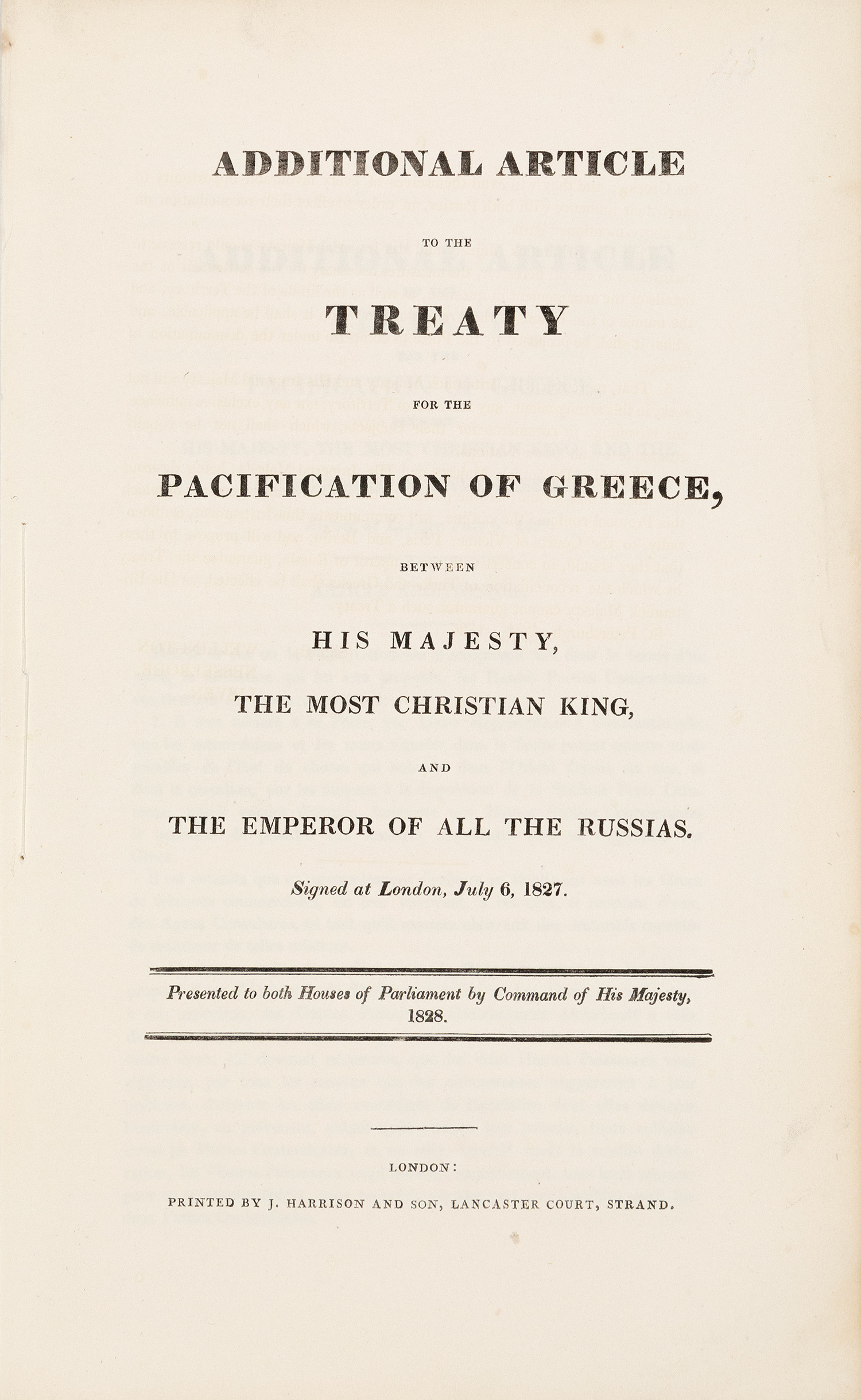 Τιμή εκτίμησης: € 200 - 3004ο, 6 σ. [μαζί:] Treaty for the pacification of Greece, between His Majesty, the most christian King, and the Emperor of all the Russias, signed at London, July 6, 1827, presented to both Houses of Parliament by command of His Majesty, 1828. Λονδίνο, J. Harrison and son, [1828]. • 4ο, 8 σ. [μαζί:] Additional article to the Treaty for the pacification of Greece, between His Majesty, the most christian King, and the Emperor of all the Russias, signed at London, July 6, 1827, presented to both Houses of Parliament by command of His Majesty, 1828. Λονδίνο, J. Harrison and son, [1828]. • 4ο, 5 σ. • Και οι 3 εκδόσεις χωρίς ιδιαίτερα εξώφυλλα και με χρυσωμένη την πάνω ακμή. (3)