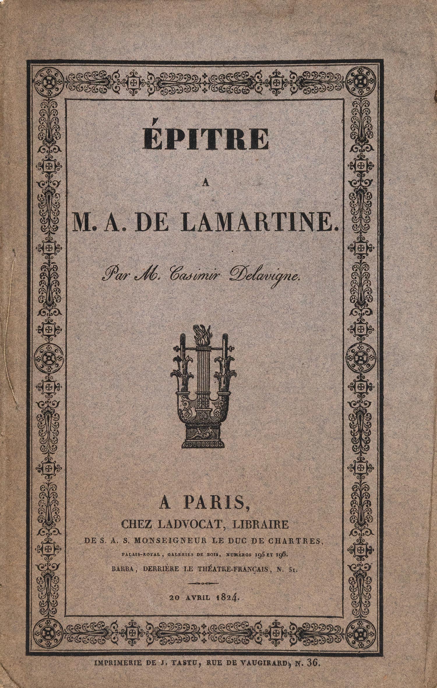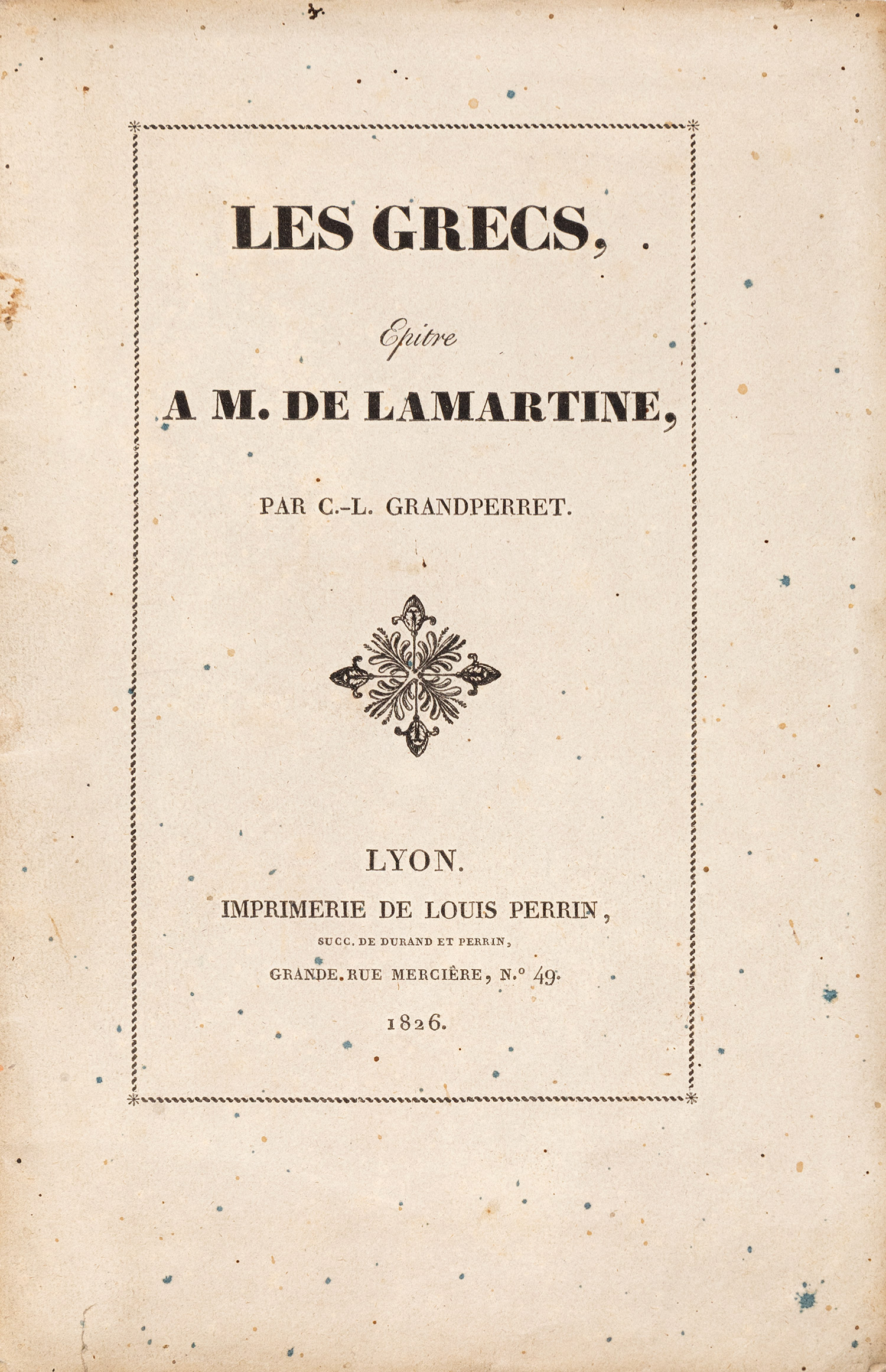Τιμή εκτίμησης: € 150 - 2008ο, 23 σ. (μικρός λεκές από νερό σε δύο φύλλα). Αρχικά τυπωμένα εξώφυλλα (αξάκριστο). Droulia 1487. • Ο συγγραφέας μέμφεται τον Lamartine για τη σιωπή του σχετικά με τον αγώνα των Ελλήνων, την ώρα που όλοι οι Γάλλοι ποιητές «πενθούν», και τον παροτρύνει να κάνει την «ποιητική» του προσφορά. [μαζί:] DELAVIGNE, Casimir. Épitre à M. A. de Lamartine. Παρίσι, Ladvocat και Barba, 1824. • 8ο, [8] + 13 σ. (οξείδωση). Αρχικά τυπωμένα εξώφυλλα. Droulia 755. (2)