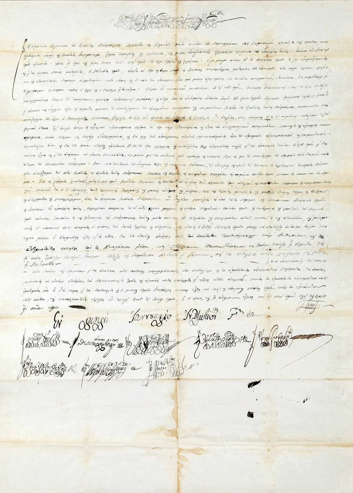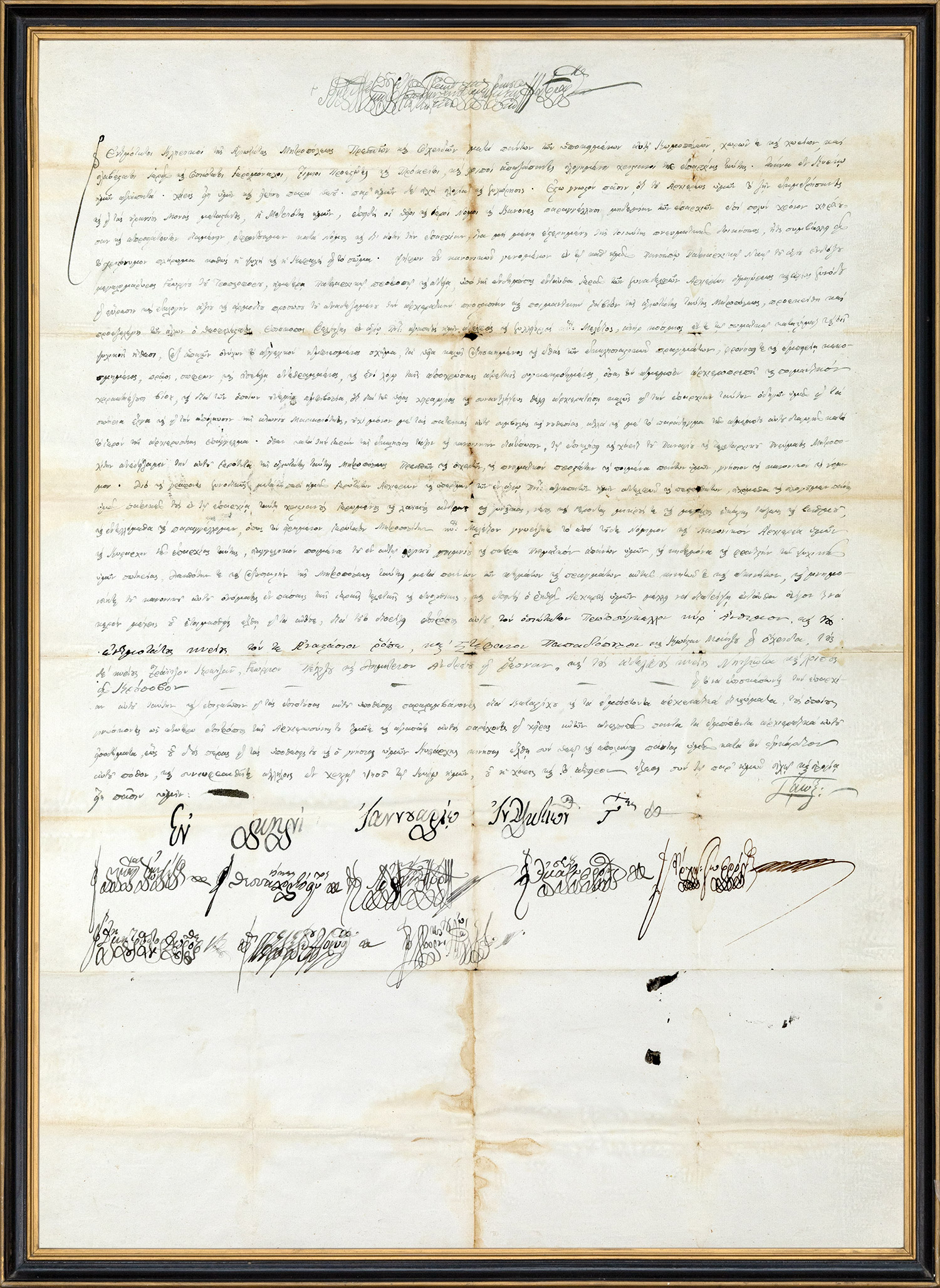 Τιμή εκτίμησης: € 1.200 - 1.600Χειρόγραφο σε χαρτί, 770 x 550 mm. • Ανακοινώνεται ἡ ἐκλογὴ τοῦ ἐπισκόπου Βελίτζης Μελετίου στὴ θέση τοῦ ἀποθανόντος μητροπολίτου Πρεσπῶν καὶ Ἀχριδῶν. Ἅπαντες οἱ χριστιανοὶ ὀφείλουν νὰ ἐπιδείξουν τὴ δέουσα ὑπακοὴ καὶ σεβασμὸ στὸν νέο τους μητροπολίτη, ὁ ὁποῖος θὰ παραμείνει στὴν Κωνσταντινούπολή γιὰ βραχὺ χρονικὸ διάστημα, καὶ μέχρι τὴ μετάβασή του στὴν ἕδρα του διορίζει ὡς ἐπιτρόπους του τὸν πρωτοσύγκελλο Ἄνθιμο καὶ τοὺς κυρίους Ἀναστάσιο Ρόπα καὶ Στέφανο Παπαδόπουλο καὶ Κώστα Μάντζου στὴν Ὀχρίδα, τοὺς δὲ κυρίους Τράϊτζο Καρατζᾶ, Γεώργιο Πέλτζου καὶ Δημήτριο Ἀνδρέου στὴ Ρέσνα, καὶ τοὺς ἀδελφοὺς κυρίους Νητζιῶτας στὸ Κρούσοβο. Ταυτόχρονα ὁρίζονται καὶ τὰ καθήκοντά τους. • Τὸ γράμμα χρονολογεῖται τὸν Ἰανουάριο τοῦ ἔτους 1860 τὴν τρίτη ἰνδικτιώνος καὶ ὑπογράφεται μόνο μὲ μηνολογία ἀπὸ τὸν πατριάρχη καὶ ἀπὸ ὀκτὼ συνοδικοὺς ἀρχιερεῖς: Νικαίας Ἰωαννίκιος, Θεσσαλονίκης Νεόφυτος, Ἀδριανουπόλεως Κύριλλος, Ἀμασείας Σωφρόνιος, Ἄρτης Σωφρόνιος, Δημητριάδος Δωρόθεος, Βελεγράδου(;) Διονύσιος, Σβορνικίου Ἀγαθάγγελος. Στὴν κεφαλὴ τοῦ γράμματος τὸ ὄνομα τοῦ Οἰκουμενικοῦ Πατριάρχη καὶ ὁ τίτλος του μὲ μονοκονδυλιά. Σε κορνίζα.