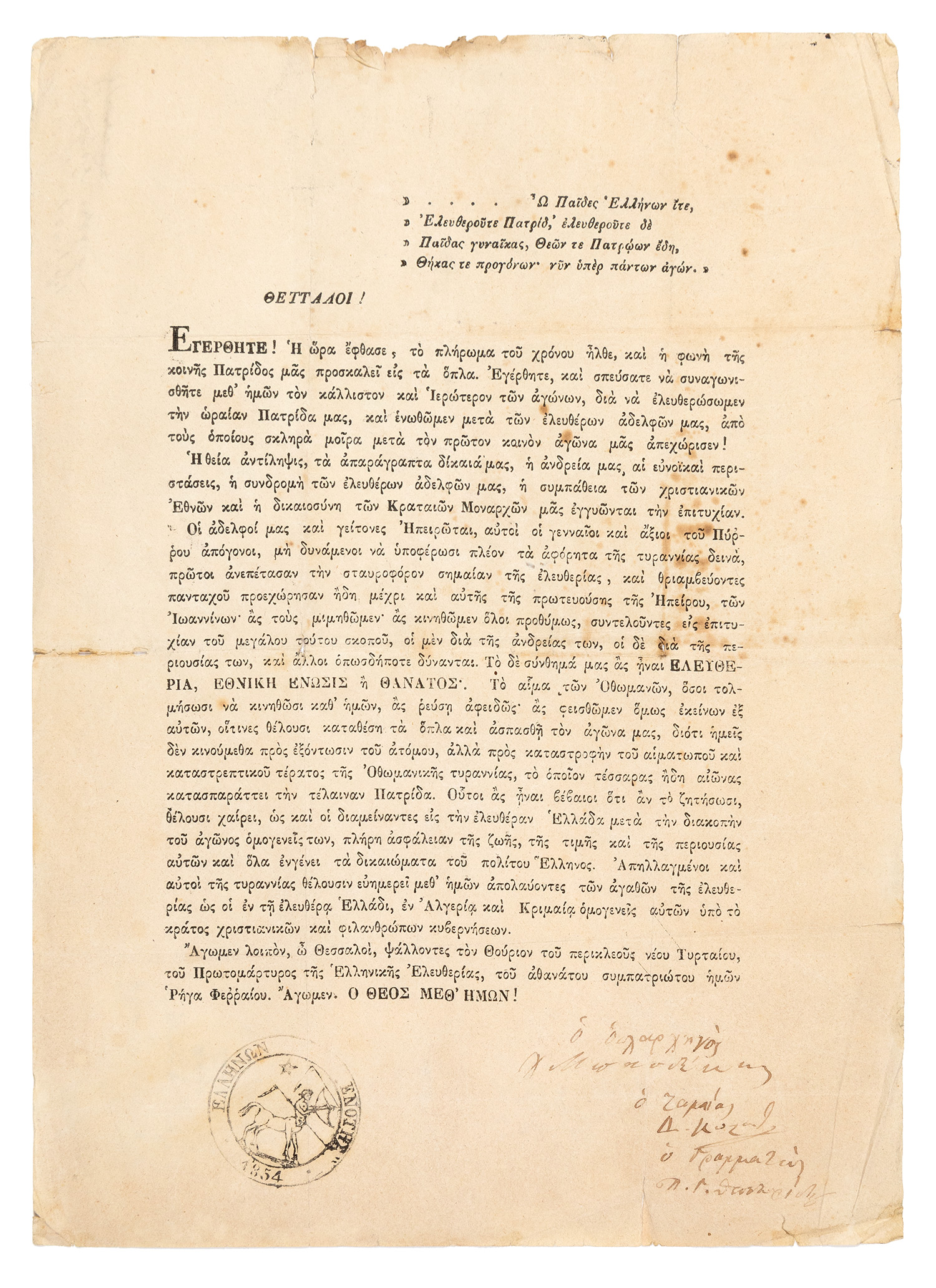 ΕΠΑΝΑΣΤΑΣΗ 1854 — ΘΕΤΤΑΛΟΙ! ΕΓΕΡΘΗΤΕ! Ἡ ὥρα ἔφτασε, το πλήρωμα τοῦ χρόνου ἦλθε, καί ἡ φωνή τῆς κοινῆς Πατρίδος μᾶς προσκαλεῖ εἰς τά ὅπλα. Ἐγέρθητε […] διά νά ἐλευθερώσωμεν τήν ὡραίαν Πατρίδα μας, καί ἐνωθῶμεν μετά τῶν ἐλευθέρων ἀδελφῶν μας, ἀπό τούς ὁποίους σκληρά μοῖρα μετά τόν πρῶτον κοινόν ἀγῶνα μᾶς ἀπεχώρισεν... [τελειώνει:] Ἄγωμεν λοιπόν, ὦ Θεσσαλοί, ψάλλοντες τόν Θούριον […] τοῦ ἀθανάτου συμπατριώτου ἡμῶν Ρήγα Φεῤῥαίου. Ἄγωμεν. Ο ΘΕΟΣ ΜΕΘ’ ΗΜΩΝ.