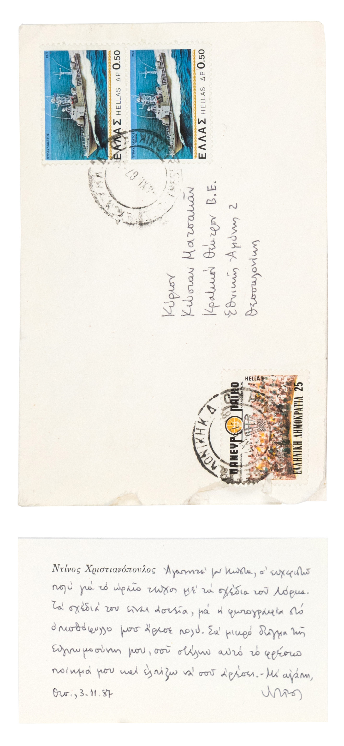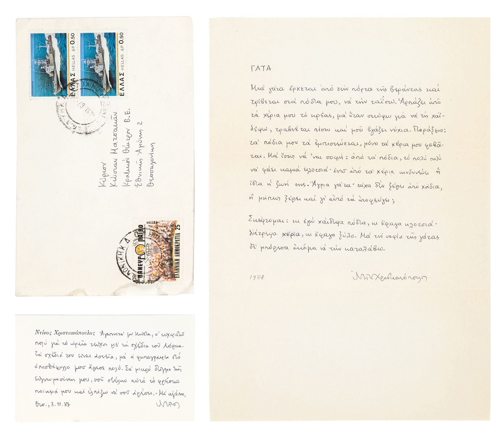 Τιμή εκτίμησης: € 200 - 300Γραμμένο σε φύλλο διαστάσεων 211 x 145 mm. (η πίσω όψη λευκή). Υπογεγραμμένο στο τέλος: «Ντίνος Χριστιανόπουλος» και χρονολογημένο (με μολύβι και πιθανώς από άλλο χέρι): «1987». [μαζί, του ιδίου:] Αὐτόγραφη ἐπιστολὴ μὲ τὴν ὑπογραφή του («Ντῖνος») πρὸς τὸν ἡθοποιὸ Κώστα Ματσακᾶ. Θεσσαλονίκη, 3 Νοεμβρίου 1987. • 1 σ., σε κάρτα διαστάσεων 55 x 95 mm. Έντυπη επικεφαλίδα («Ντίνος Χριστιανόπουλος»). • «... Σά μικρό δεῖγμα τῆς εὐγνωμοσύνης μου, σοῦ στέλνω αὐτό τό φρέσκο ποίημά μου καί ἐλπίζω νά σοῦ ἀρέσει.- Μέ ἀγάπη...». Μαζί ο φάκελος. (3) • Το ποίημα εμφανίζει διαφορές από το τελικώς δημοσιευμένο.