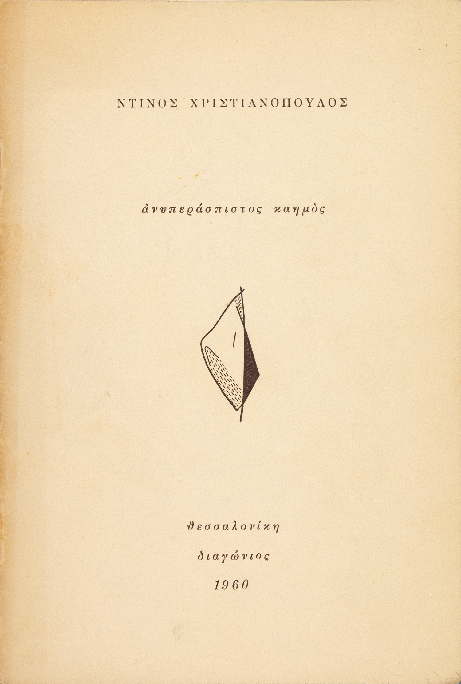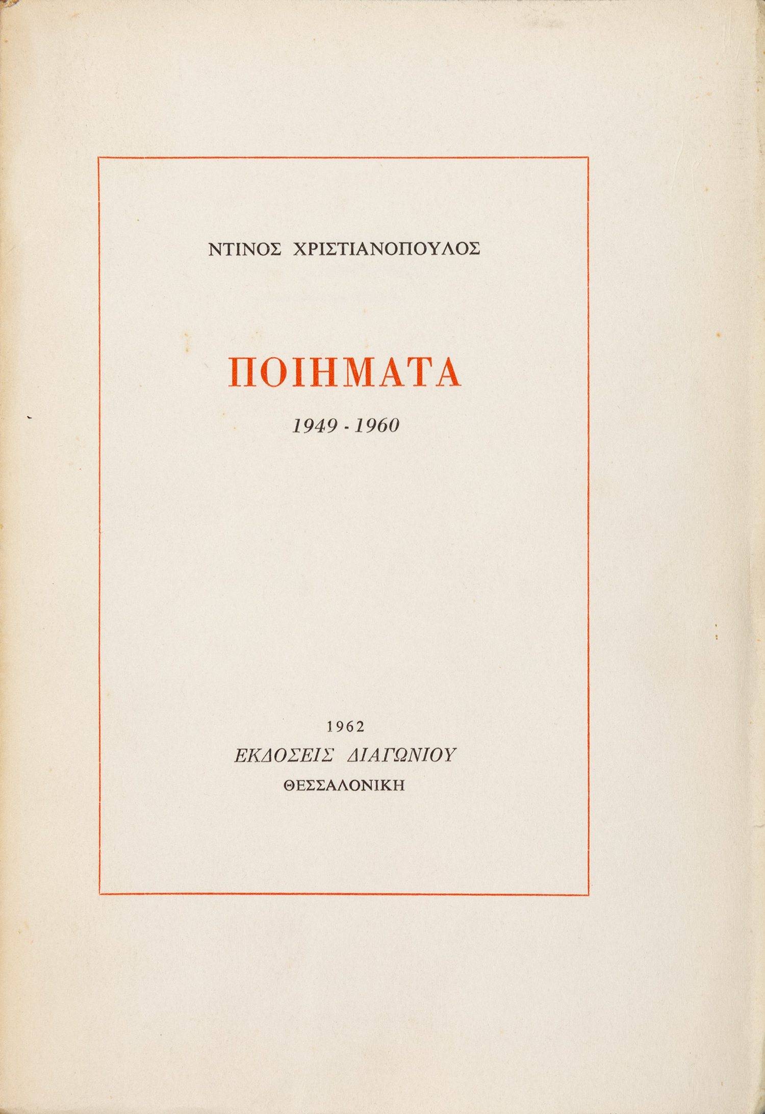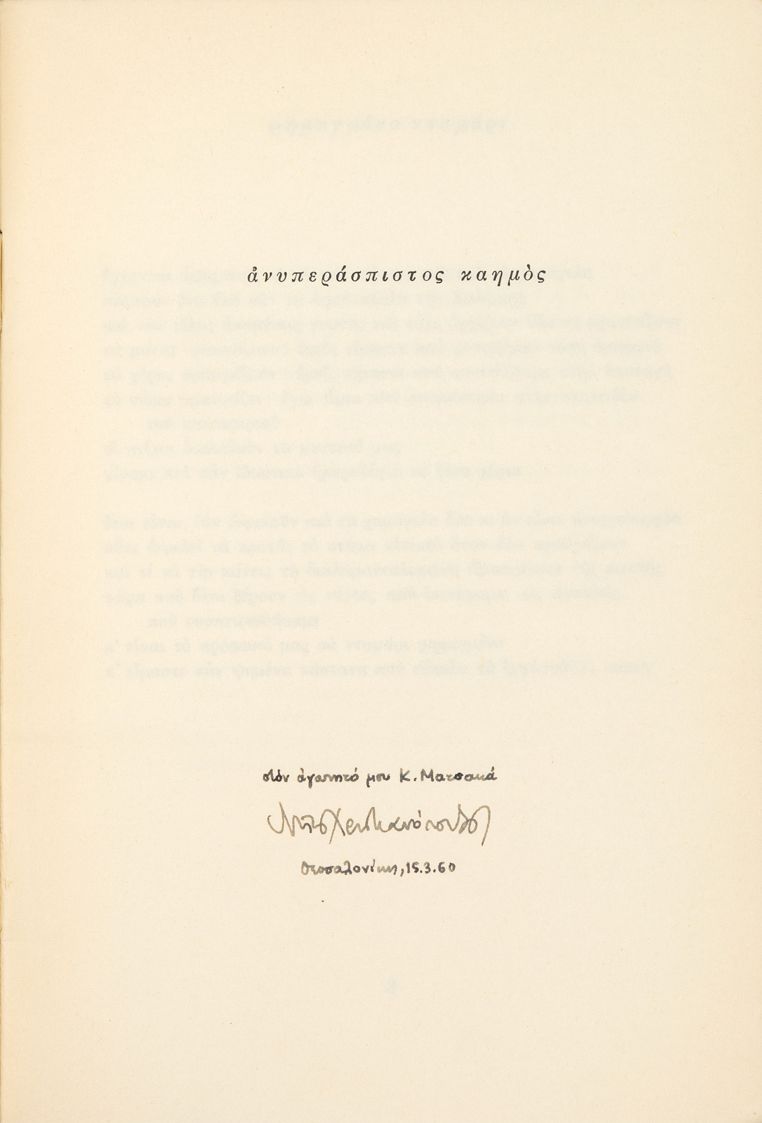 Τιμή εκτίμησης: € 150 - 20029 σ. Έκδοση σε 700 αντίτυπα, με ιδιόχειρη σημείωση. Αρχικά εξώφυλλα (σπασμένες οι συνδέσεις). [μαζί, του ιδίου:] Ποιήματα, 1950-1955. Θεσσαλονίκη 1957. • Πρώτη συγκεντρωτική έκδοση, σε 750 αντίτυπα εκτός εμπορίου, 52 σ. Αντίτυπο με ιδιόχειρη αφιέρωση («στόν ἀγαπητό μου / Κώστα Ματσακᾶ / μέ φιλικά αἰσθήματα / Θεσσαλονίκη, 10.03.57 / Ντῖνος Χριστιανόπουλος»). Αρχικά εξώφυλλα (του Κ. Τσίζεκ, φθορές, κυρίως στη ράχη). [μαζί, του ιδίου:] Ἀνυπεράσπιστος καημός. Θεσσαλονίκη, Διαγώνιος, 1960. • ΠΡΩΤΗ ΕΚΔΟΣΗ, περιορισμένη σε 400 αντίτυπα. 15 σ. Αντίτυπο με ιδιόχειρη αφιέρωση στον Κ. Ματσακά. Αρχικά εξώφυλλα. [μαζί, του ιδίου:] Ποιήματα, 1949-1960. Θεσσαλονίκη, Διαγώνιος, 1962. • ΠΡΩΤΗ ΕΚΔΟΣΗ, περιορισμένη σε 500 αντίτυπα εκτός εμπορίου. 98 σ. Αντίτυπο με ιδιόχειρη αφιέρωση στον Κ. Ματσακά. Αρχικά εξώφυλλα. (4)