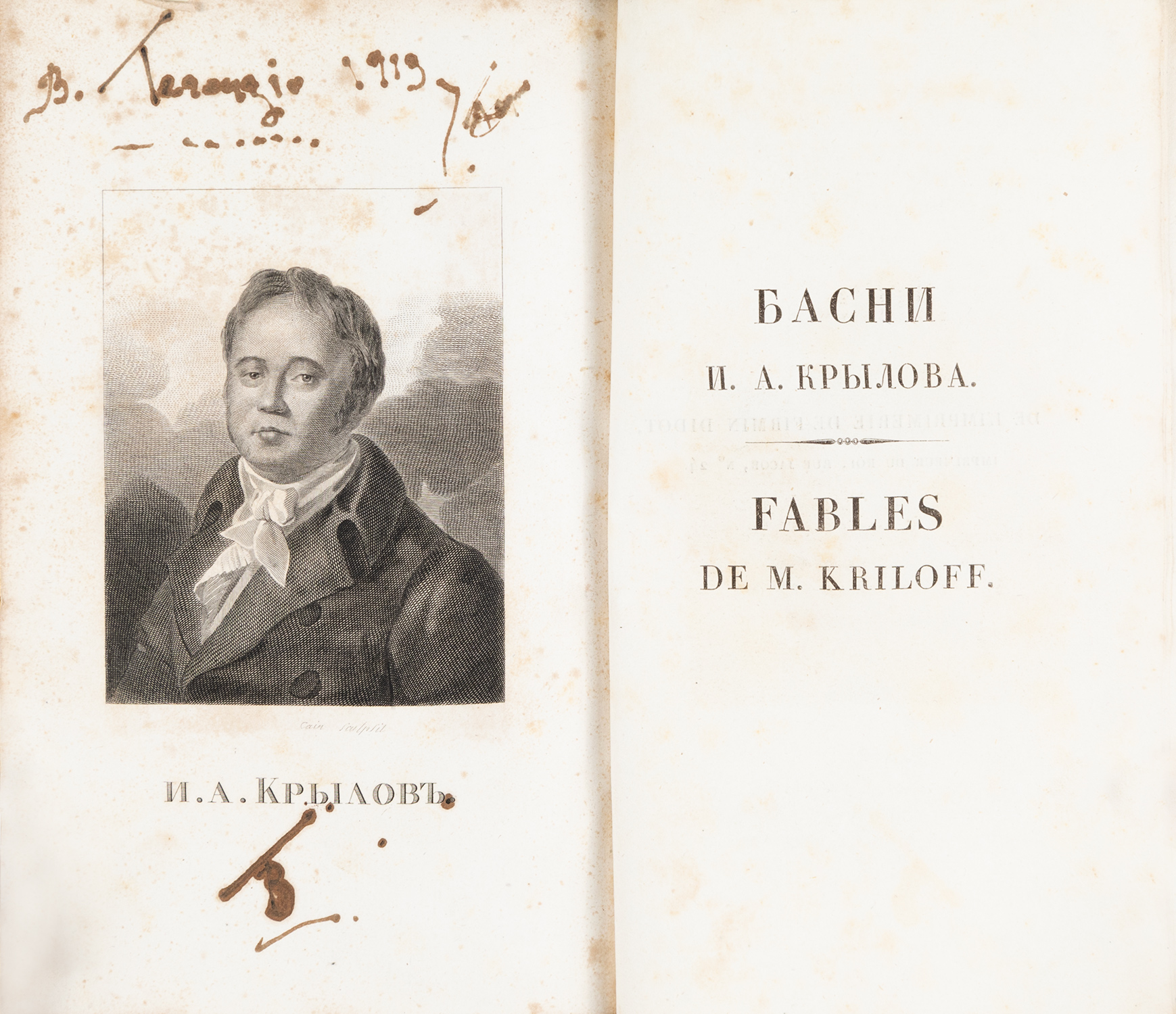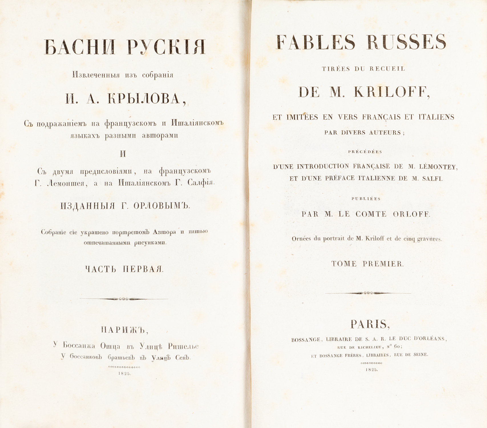 Fables russes tirées du recueil de M. Kriloff et imitées en vers français et italiens par divers auteurs; précédées d’une introduction française de M. Lémontey, et d’une préface italienne de M. Salfi, publiées parM. le comte Orloff.
