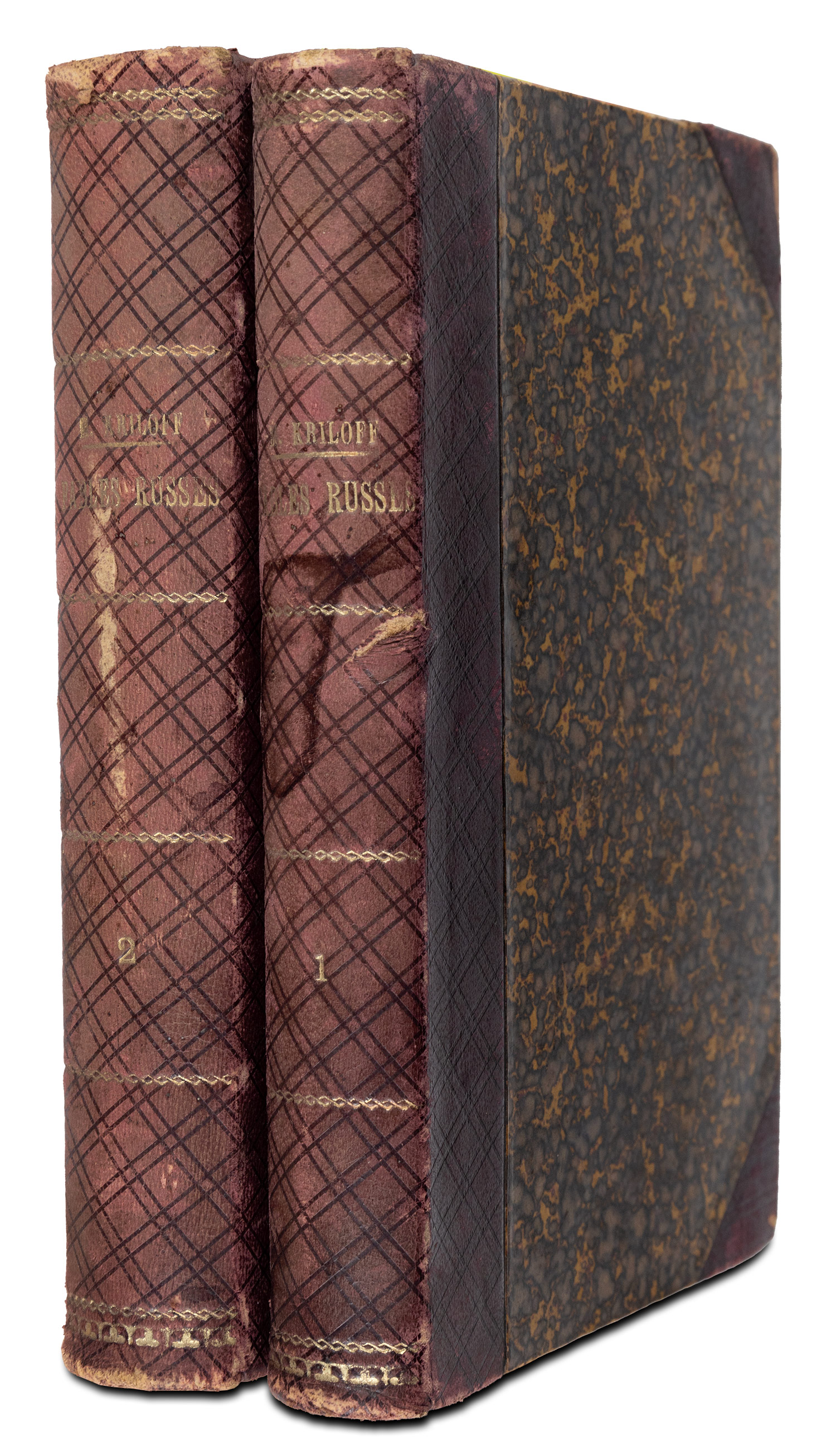 Τιμή εκτίμησης: € 500 - 7002 τόμοι, 8ο, LXI + 242 και 378 σ. (ελαφρά οξειδωμένο αντίτυπο, λερωμένο ένα φύλλο του Β´ τόμου: σ. 351-2, κτητορική σημείωση με μελάνι στο πορτραίτο). Τίτλοι στα ρωσικά και γαλλικά σε αντικριστές σελίδες, ρωσικό κείμενο και μετάφραση στα γαλλικά και ιταλικά. Με ένα χαλκόγραφο πορτραίτο του συγγραφέα σε θέση προμετωπίδας στον Α´ τόμο και 5 χαλκογραφίες εκτός κειμένου. Νεότερη δερμάτινη ράχη με πλέγμα από διπλή μαύρη γραμμή (μικρές φθορές, μαρμαρογραφημένες οι ακμές). • Το παρόν έργο αποτελεί μία έκδοση-ορόσημο τόσο από πλευράς περιεχομένου, όσο και από πλευράς τυπογραφίας. Ο κόμης Grigorii Vladimirovich Orlov (1776-1826) κατάφερε να συγκεντρώσει περισσότερες από 80 εξέχουσες προσωπικότητες των γραμμάτων από τη Γαλλία και την Ιταλία, μεταξύ των οποίων ο Casimir Delavigne και η Delphine Gay, προκειμένου να μεταφράσουν και να διασκευάσουν πάνω από 85 πρωτότυπους μύθους του διάσημου Ρώσου συγγραφέα IvanKrylov, εισάγοντας έτσι τη σύγχρονη ρωσική λογοτεχνία στη Δυτική Ευρώπη. Για την έκδοση χρησιμοποιήθηκε μία κυριλλική γραμματοσειρά ειδικά παραγγελθείσα και σχεδιασμένη από τον Firmin Didot, ενώ την εικονογράφηση ανέλαβαν επιφανείς καλλιτέχνες της εποχής (Cain, Ch. Beyer και Jean-Baptiste Isabey). Σπάνια και περιζήτητη έκδοση. (2)