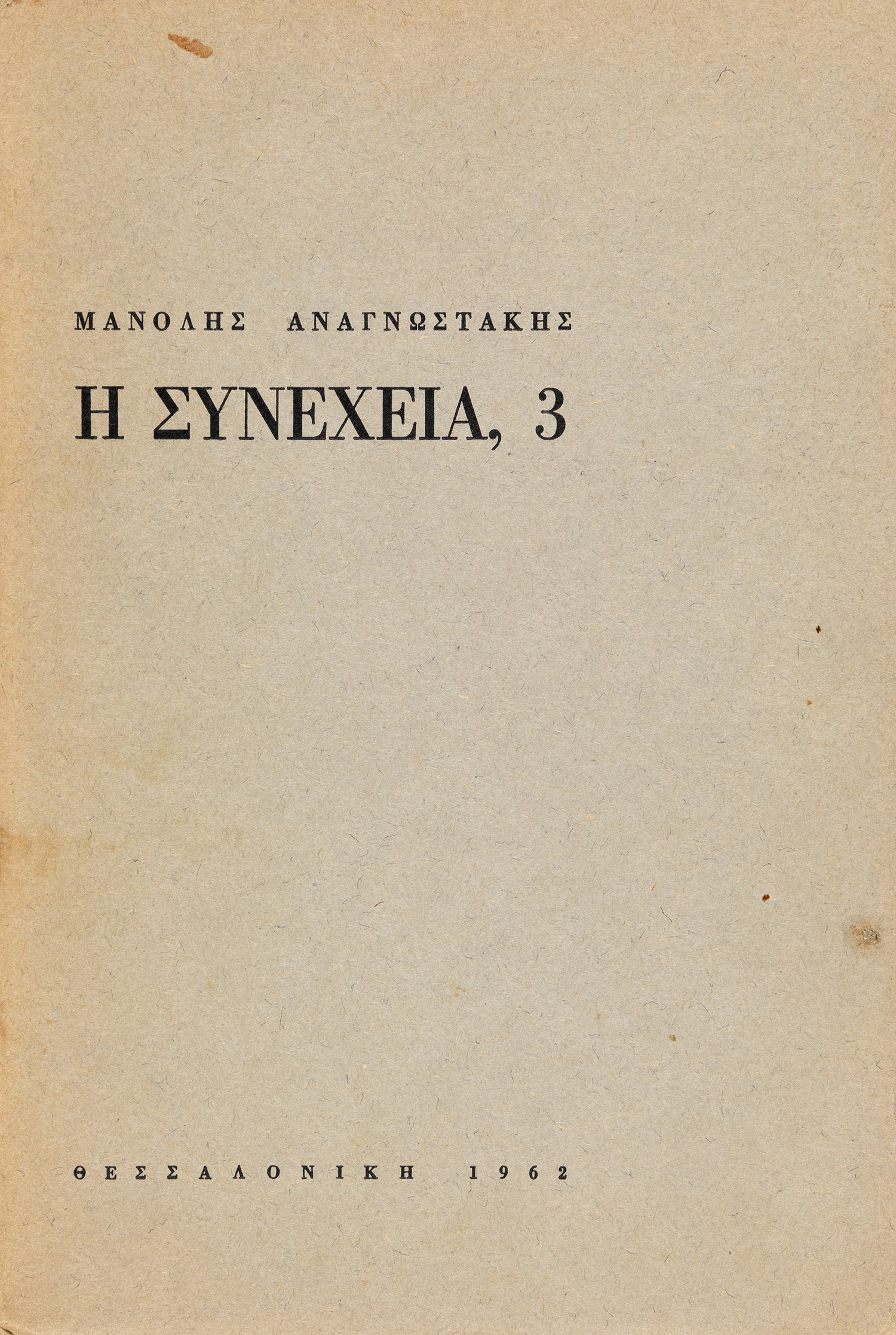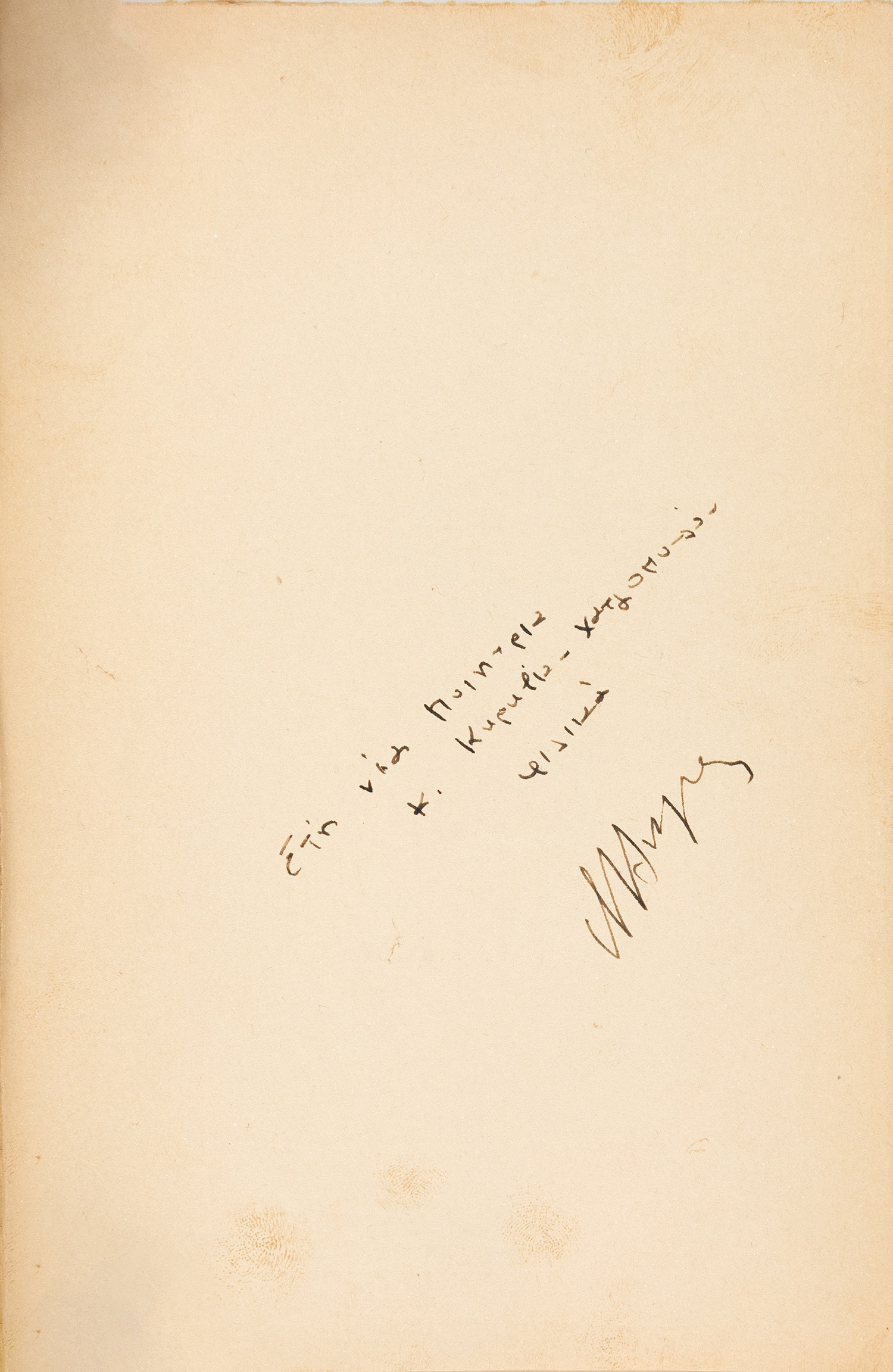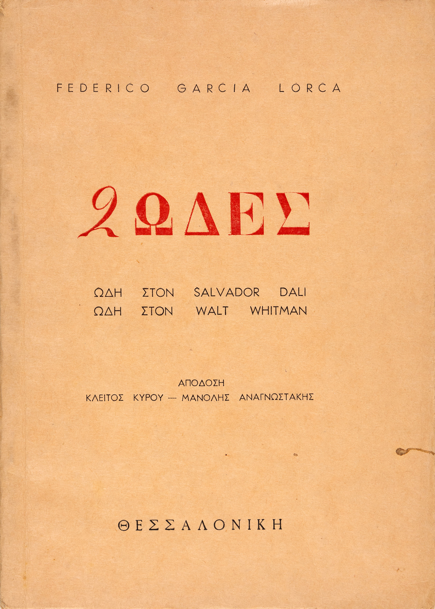 Τιμή εκτίμησης: € 150 - 200ΠΡΩΤΗ ΕΚΔΟΣΗ, σε 650 αντίτυπα. 102 σ. Με ιδιόχειρη αφιέρωση («Στή νέα ποιήτρια / κ. Καραβία-Χατζοπούλου / φιλικά / Μ. Αναγνωστάκης»). Αρχικά εξώφυλλα (ξεθωριασμένη η ράχη). [μαζί, του ιδίου:] Ἡ συνέχεια, 3. Θεσσαλονίκη 1962. • ΠΡΩΤΗ ΕΚΔΟΣΗ, σε 600 αντίτυπα. 27 σ. Αντίτυπο με ιδιόχειρη αφιέρωση στη Λεία Χατζοπούλου-Καραβία. Αρχικά εξώφυλλα. [μαζί:] LORCA, Federico Garcia. Δύο ὠδές: Ὠδή στὸν Salvador Dali – Ὠδή στὸν Walt Whitman, ἀπόδοση Κλεῖτος Κύρου – Μανόλης Ἀναγνωστάκης. Θεσσαλονίκη 1948. • ΠΡΩΤΗ ΕΚΔΟΣΗ, περιορισμένη σε 300 αντίτυπα. [24] σ. Μ’ ένα ολοσέλιδο πορτραίτο του Lorca. Αρχικά εξώφυλλα. (3)