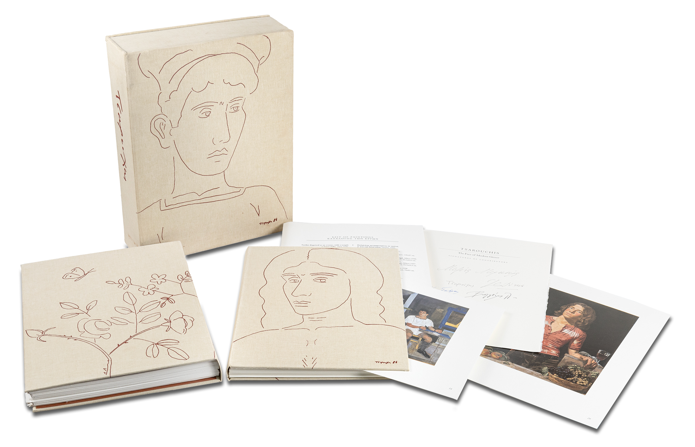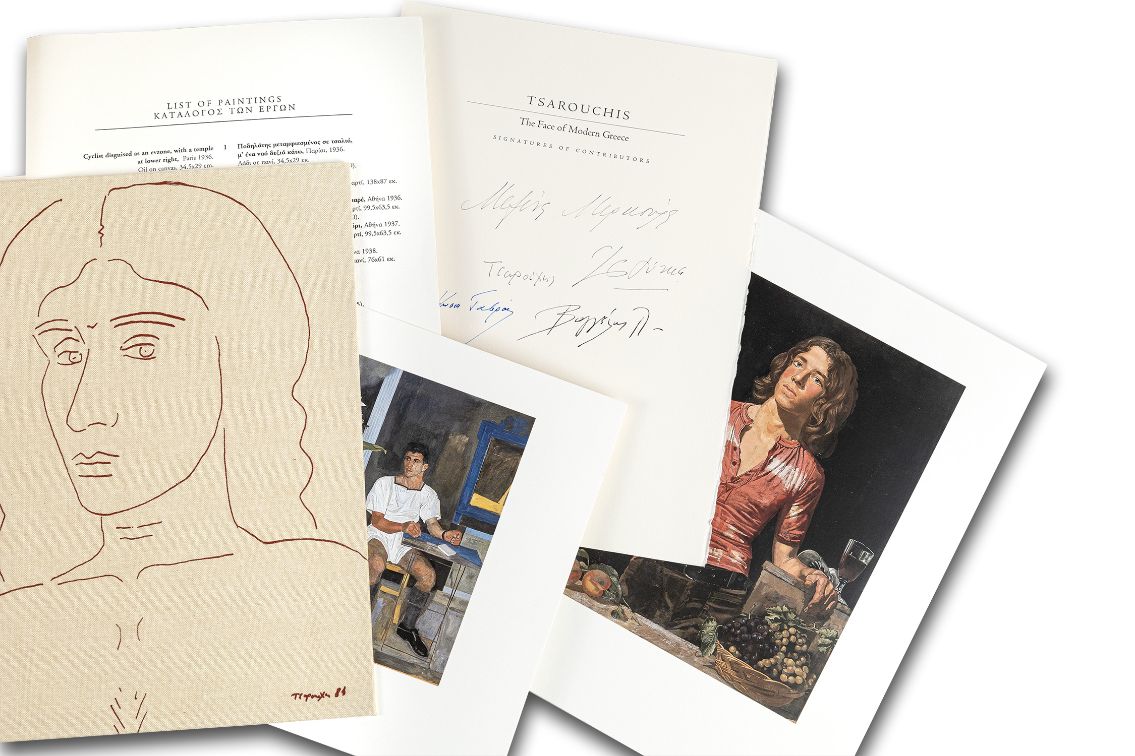 Τιμή εκτίμησης: € 1.500 - 2.000folio (380 x 285 mm.), [14] σ. + 26 δίφυλλα (αριθμημένα 1-11 + 11 [bis] + 12-25) + [17] σ. Έκδοση περιορισμένη σε 393 αριθμημένα αντίτυπα (συν 31 αντίτυπα προοριζόμενα για τους συντελεστές), σε «βαρύ χαρτί Somerset», με 36 έγχρωμες ανα παραγωγές έργων του καλλιτέχνη εν μέρει επικολλημένες σε 35 λευκά φύλλα, με κείμενα στα ελληνικά και αγγλικά, μεταξύ άλλων των Μ. Μερκούρη, Μ. Κακογιάννη, H. Cartier-Bresson, Ο. Ελύτη, Α. Φασιανού, Κ. Γαβρά, Μ. Χατζιδάκι, D. Hockney, Β. Παπαθανασίου, Γ. Ρίτσου, Μ. Θεοδωράκη, Στ. Ξαρχάκου, Δ. Τσίτουρα, κ. ά., όλα τα αντίτυπα υπογεγραμμένα από τον Γ. Τσαρούχη και από κάθε έναν από τους συντελεστές («πολλοί από τους οποίους συνεργάστηκαν με τον Γιάννη Τσαρούχη σε ταινίες, θεατρικά έργα και καλλιτεχνικές εκτυπώσεις βιβλίων, ενώ άλλοι κατέχουν ή είναι θαυμαστές του έργου του»), αντίτυπο σε άρραφα τεύχη (όπως κυκλοφόρησε). Τα κείμενα και οι αναπαραγωγές των έργων τοποθετημένα σε δύο υφασμάτινα περικαλύμματα εικονογραφημένα από τον καλλιτέχνη (με τη μέθοδο της μεταξοτυπίας). Αρχικό εικονογραφημένο υφασμάτινο κουτί σχεδιασμένο από τον καλλιτέχνη. • Μνημειώδης πολυτελής έκδοση για το έργο του Γ. Τσαρούχη.