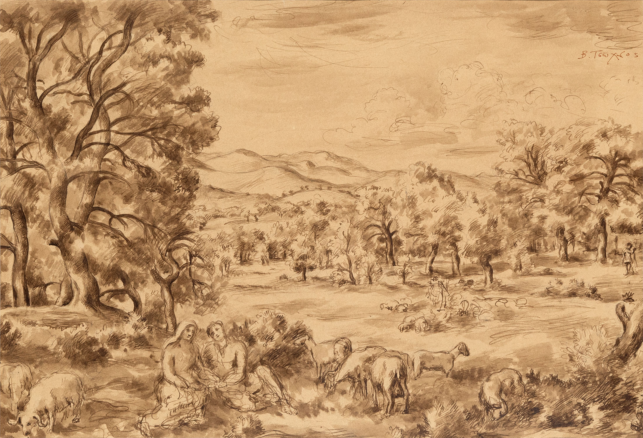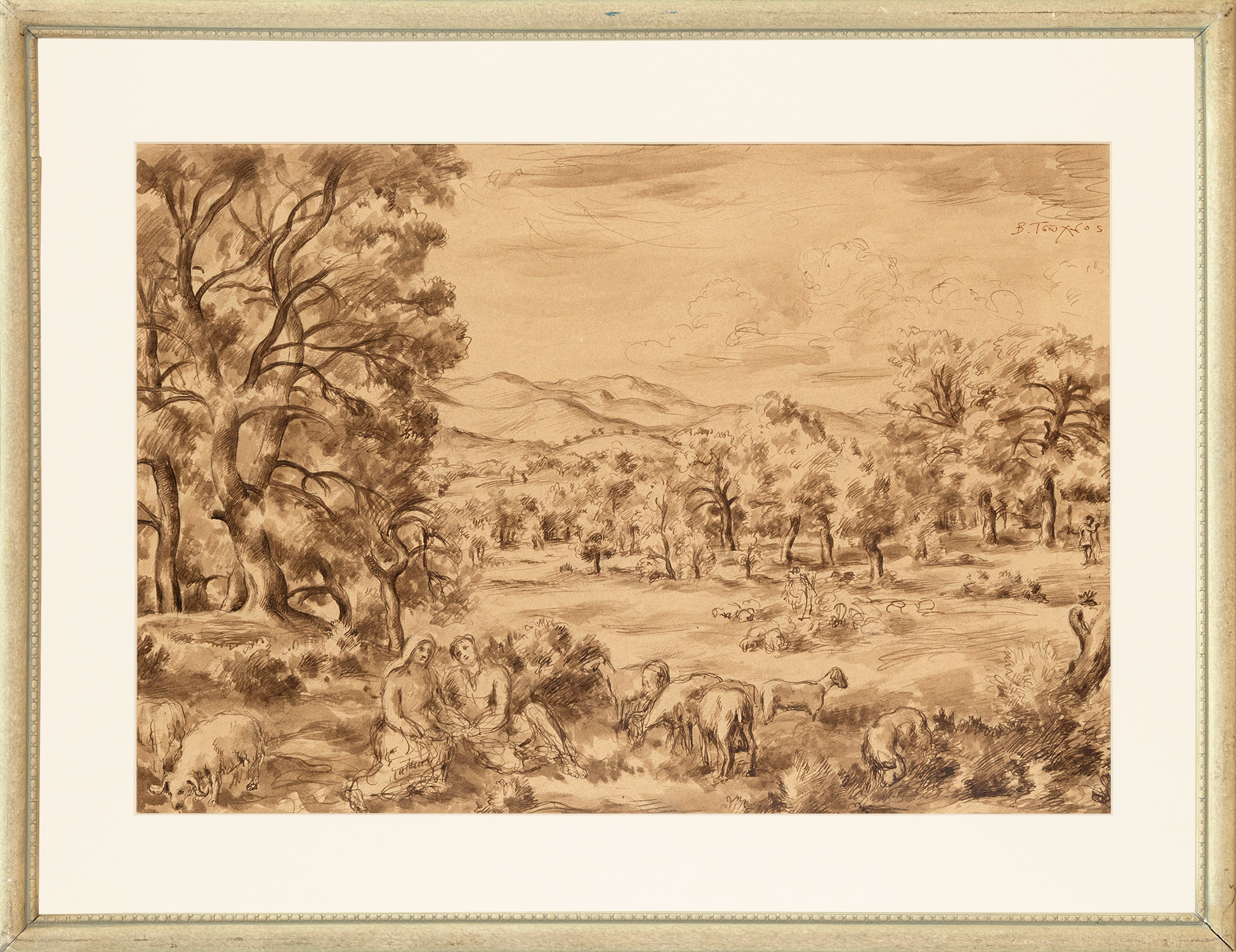 Τιμή εκτίμησης: € 500 - 700Μελάνι σε χαρτί (σινική μελάνη και σέπια), 362 x 524 mm. Υπογεγραμμένο πάνω δεξιά: «Β. Τσοῦχλος». Σε κορνίζα. • Προσχέδιο ελαιογραφίας, βλ. Χρύσανθος Χρήστου, Βρασίδας Τσούχλος, 1904-1981, Αθήνα, Άποψη, 1988, σ. 38 (Τοπίο, Ἀττική. 1934. Λάδι σε μουσαμά, 90 x 130 cm.).
