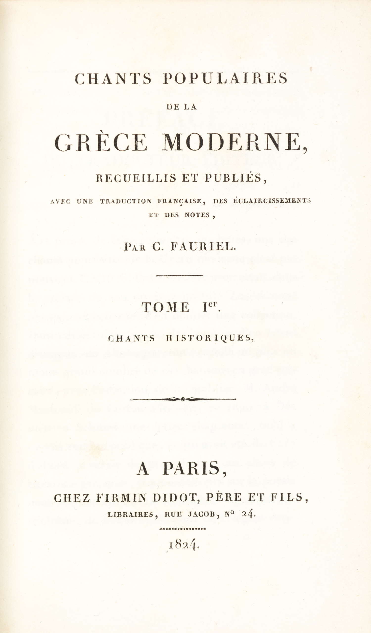 Τιμή εκτίμησης: € 800 - 1.200ΠΡΩΤΗ ΕΚΔΟΣΗ. 2 τόμοι, 8ο, cxliv + 306 και 391 [=491] σ. Ελληνικό κείμενο και γαλλική μετάφραση σε αντικριστές σελίδες. Μεταγενέστερη δερμάτινη ράχη (πολύ μικρή φθορά στη βάση της ράχης του Α´ τόμου). Ηλιού 1824.8 & 1825.14, Λαγανάς 733, Droulia 725 & 1016, πρβ. 1047. (2) • Στις σ. 435-88 του Β´ τόμου δημοσιεύεται για πρώτη φορά ο «Ὕμνος εἰς τήν Ἐλευθερίαν» του Διονυσίου Σολωμού μαζί με γαλλική μετάφραση του Stanislas Julien (κυκλοφόρησε και αυτοτελώς). ΠΟΛΥ ΚΑΛΟ ΑΝΤΙΤΥΠΟ.