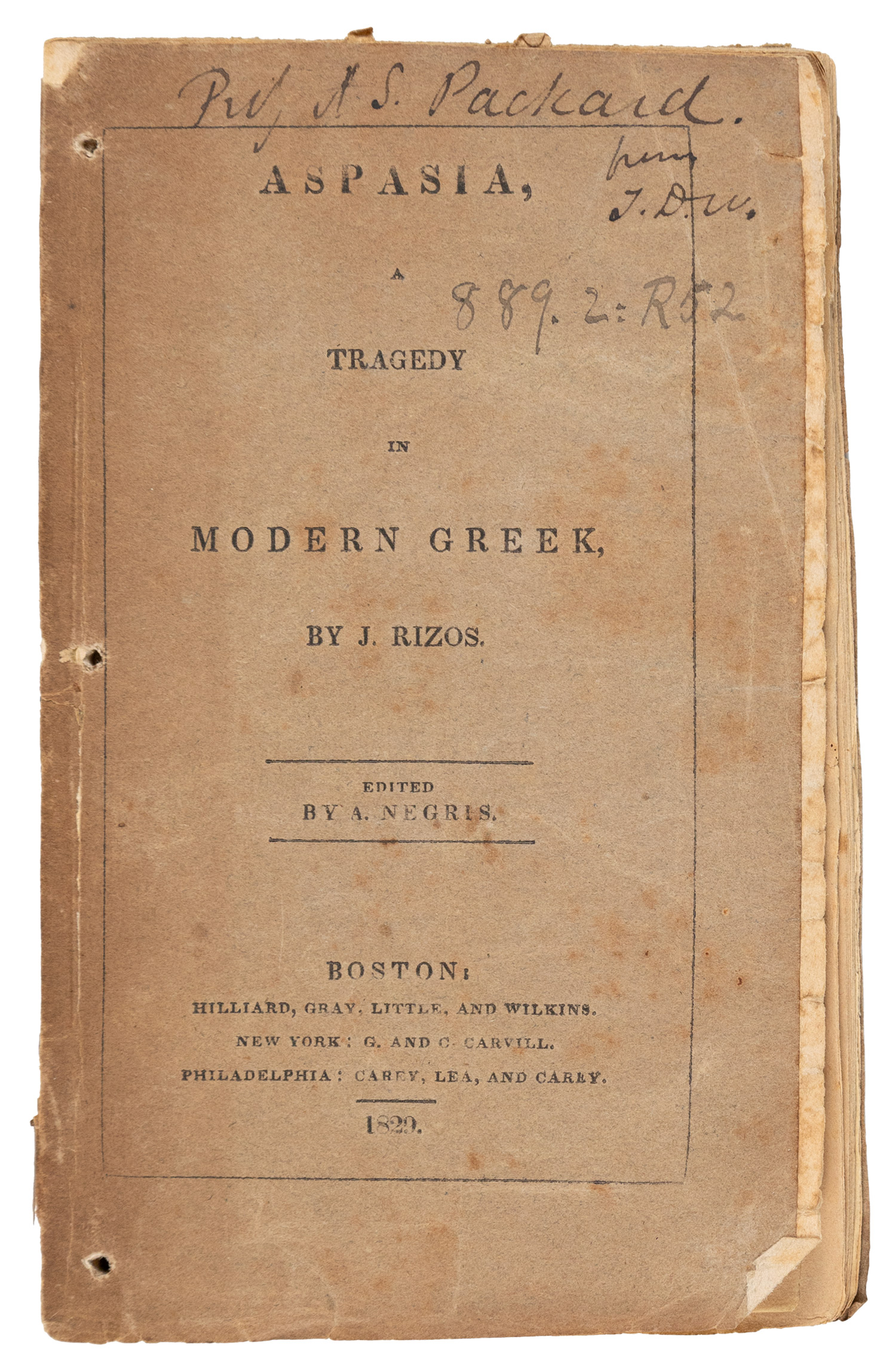 Ἀσπασία, τραγῳδία διῃρημένη εἰς τρεῖς πράξεις, ἐκδίδεται ὑπὸ τοῦ ἀνεψιοῦ του Ἀ. Ν. [στο εξώφυλλο:] Aspasia, a tragedy in modern greek, by J. Rizos, edited by A. Negris.