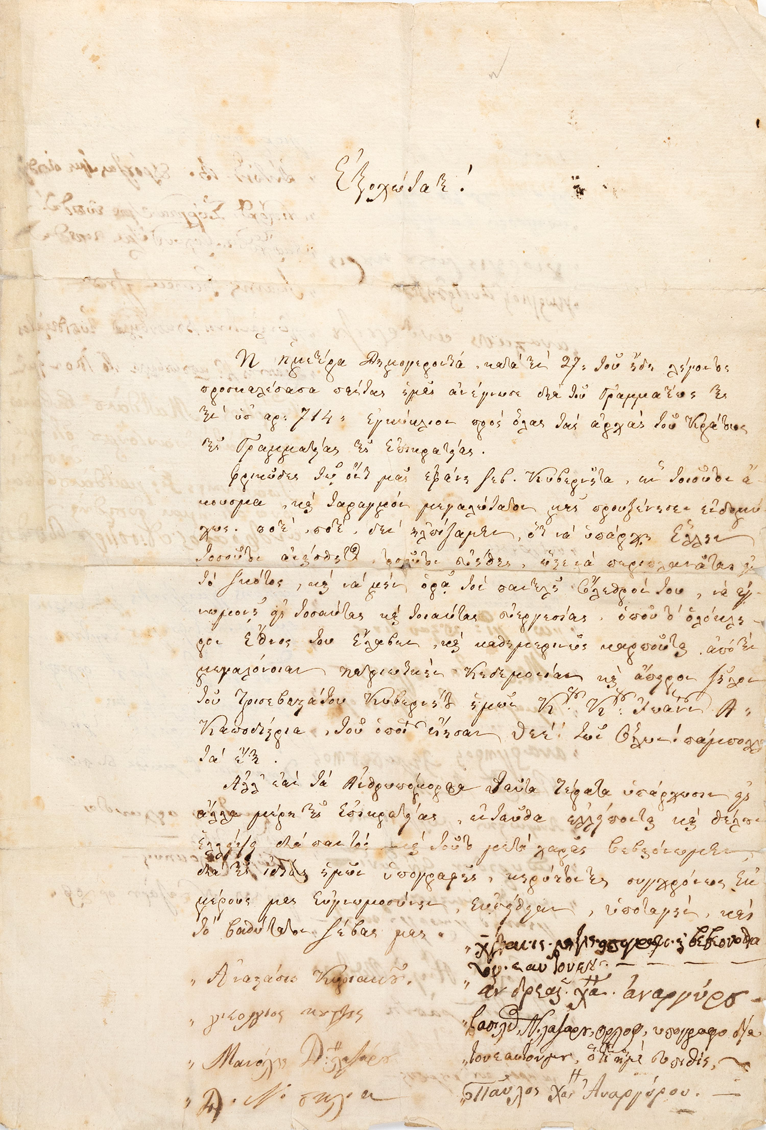 Τιμή εκτίμησης: € 1.500 - 2.000Yπογράφουν αυτογράφως 59 δημογέροντες. Δίφυλλο, 325 x 215 mm.