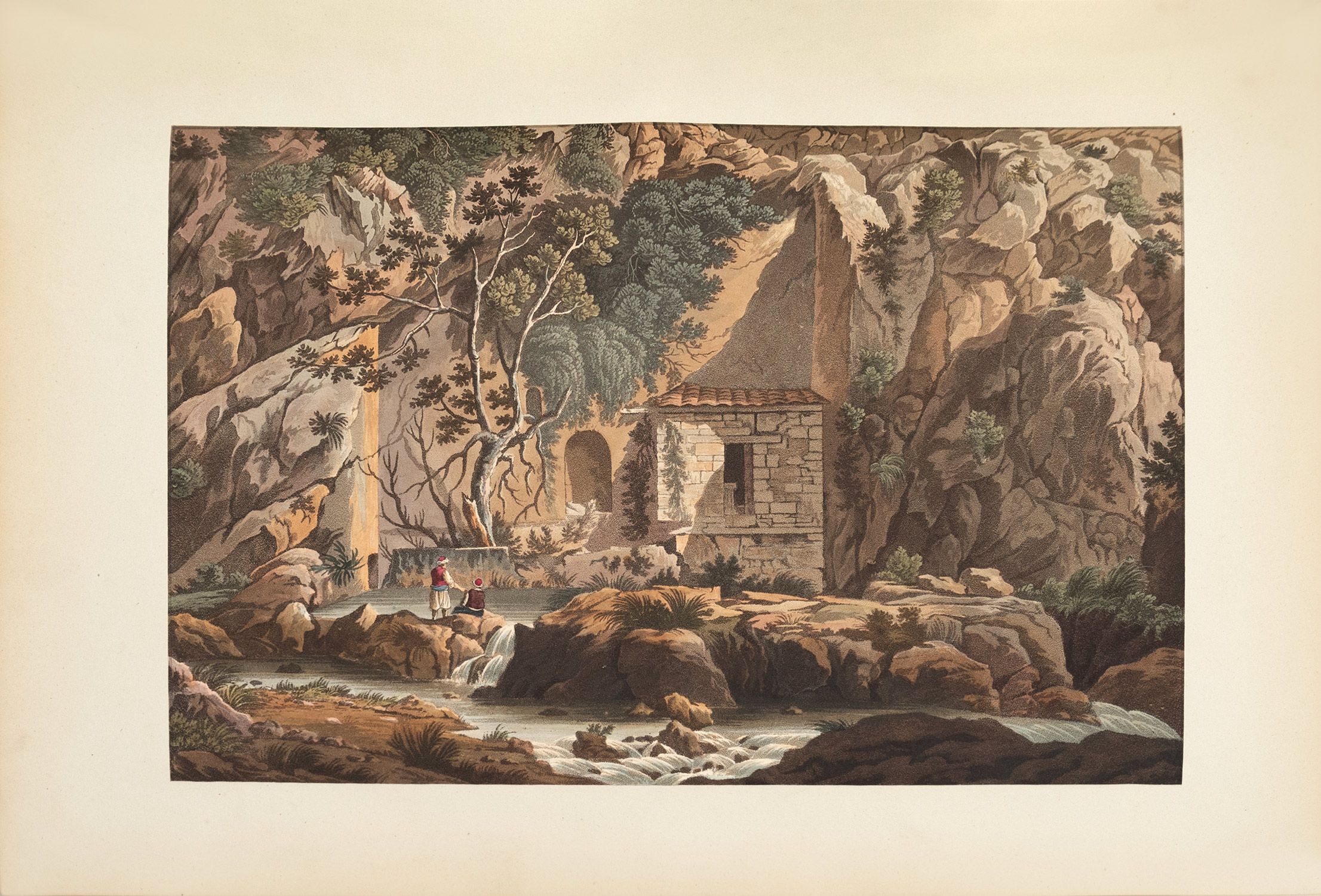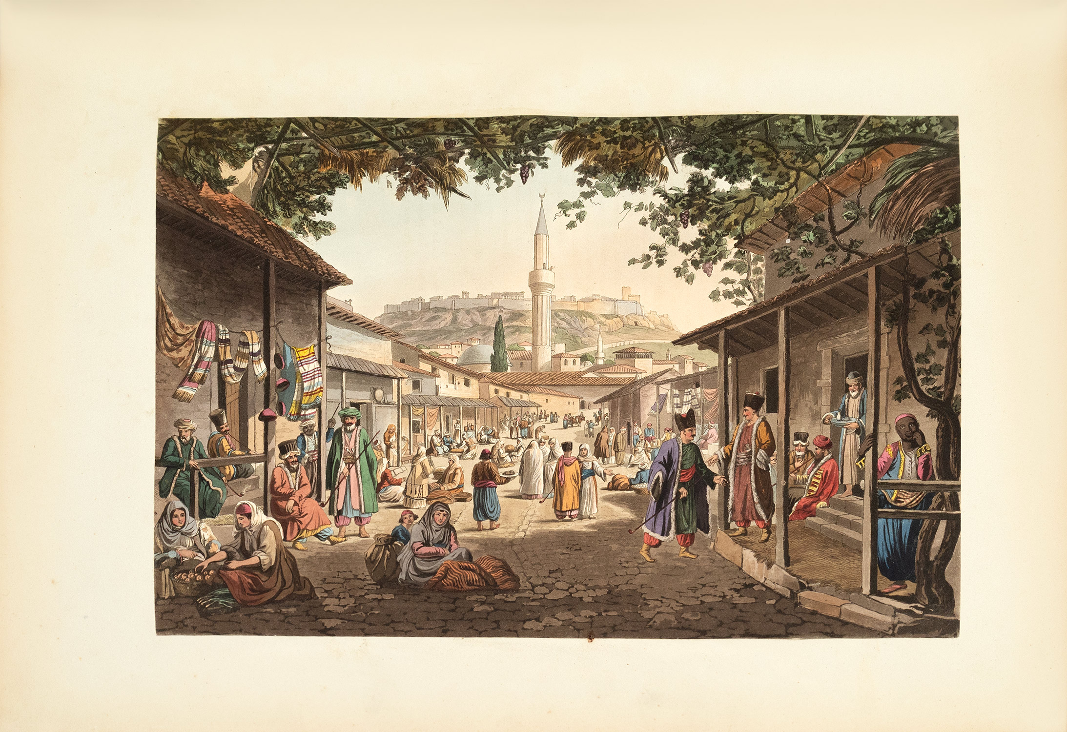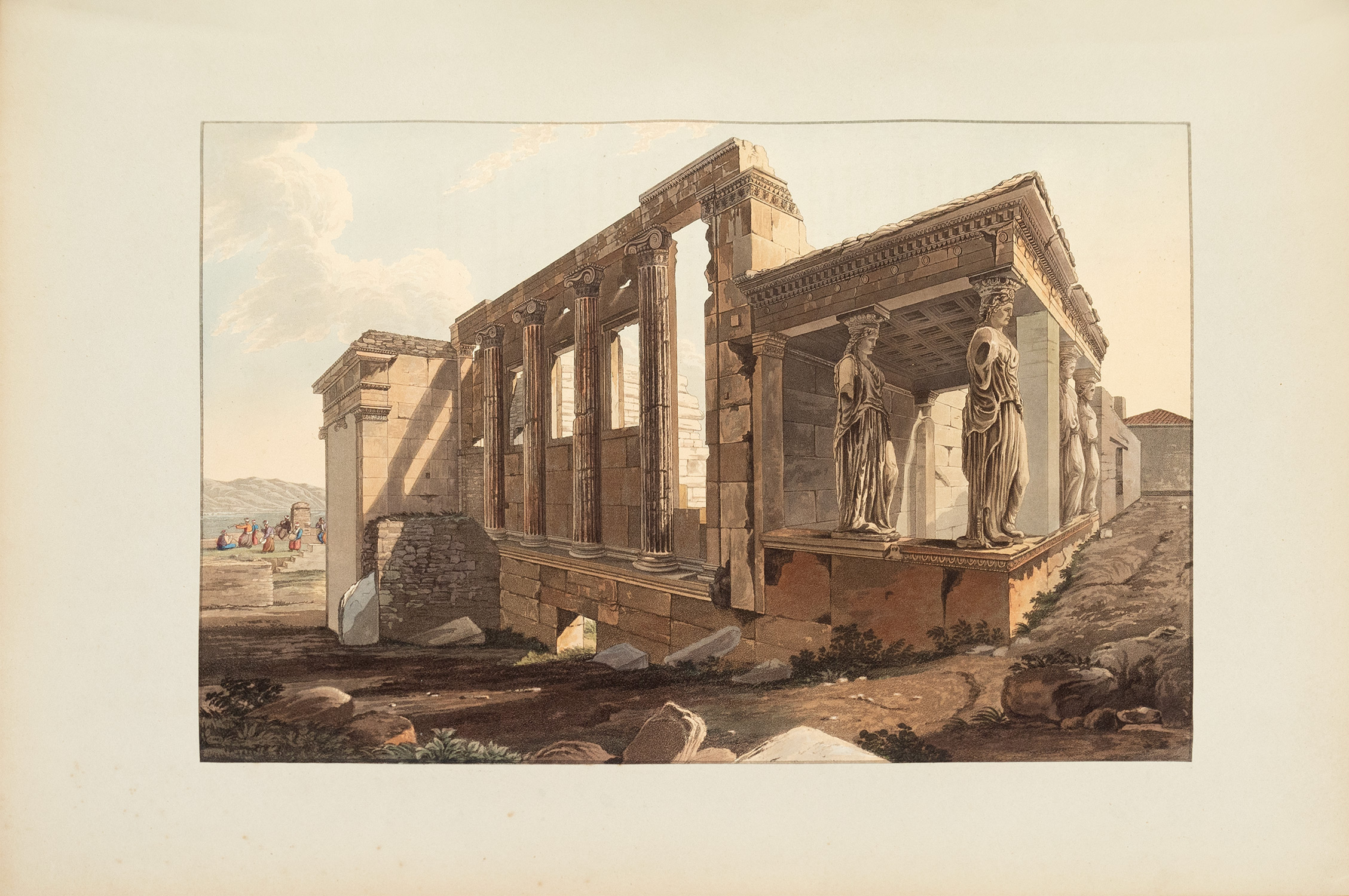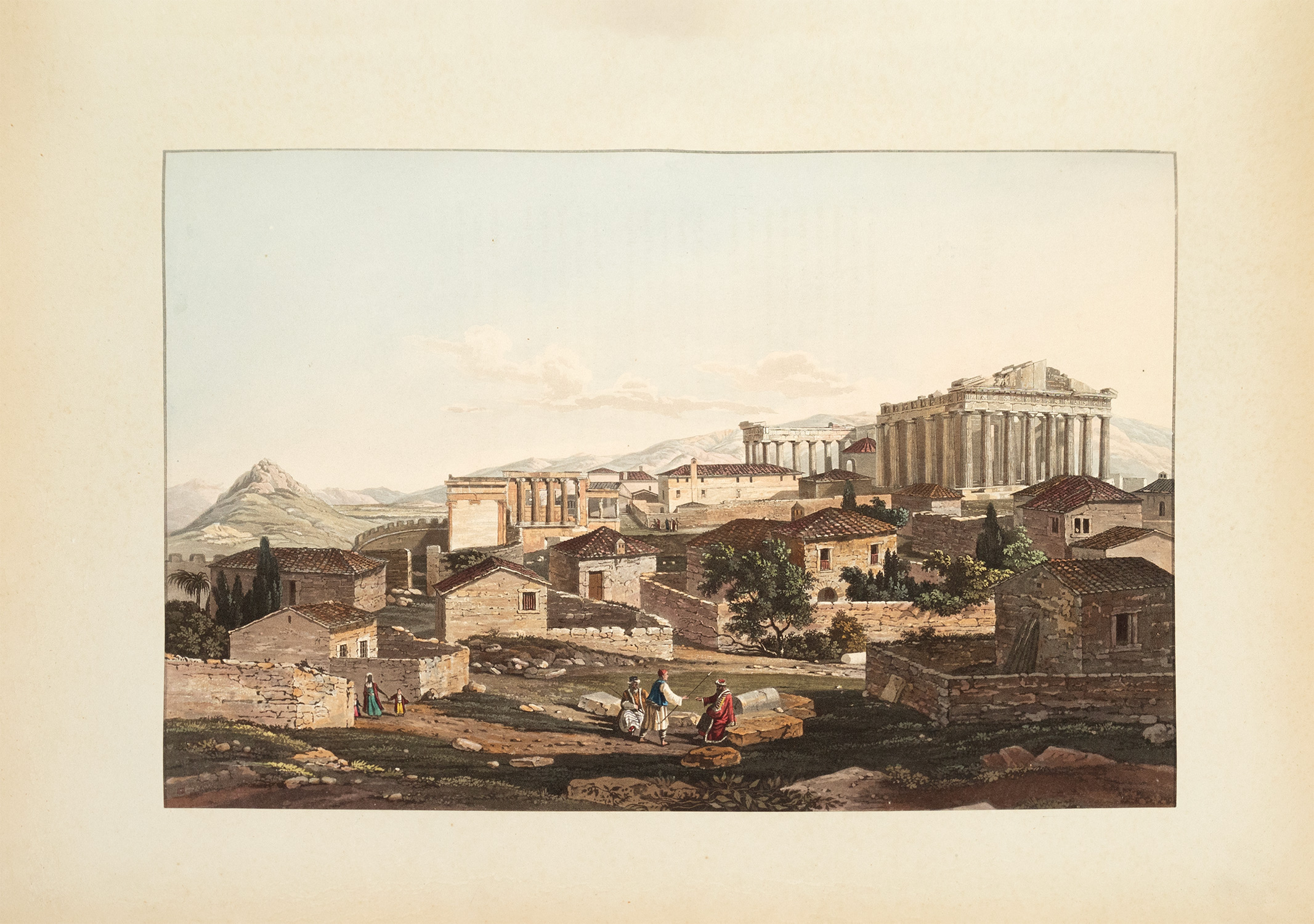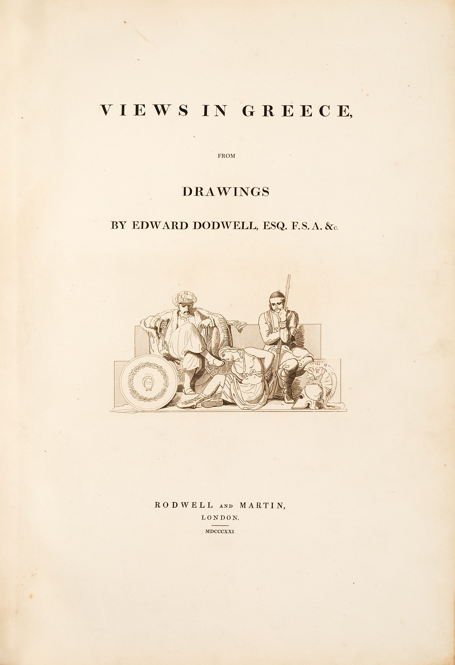 Τιμή εκτίμησης: € 15.000 - 20.000ΠΡΩΤΗ ΕΚΔΟΣΗ. μεγάλο folio (521 x 370 mm.). 30 ακουατίντες χαραγμένες από τους F. C. Lewis, T. Fielding, R. Havel, T. Medland, J. Baily και Bennett σε σχέδια των Dodwell (24) και S. Pomardi (6), επιχρωματισμένες με το χέρι, ισάριθμα φύλλα με επεξηγηματικά κείμενα στα αγγλικά και γαλλικά, 3 φύλλα κειμένου στην αρχή (τίτλος με βινιέτα, εισαγωγικό σημείωμα και πίνακας περιεχομένων), ΕΝΑ ΑΠΟ ΤΑ ΛΙΓΟΣΤΑ ΑΝΤΙΤΥΠΑ ΠΟΛΥΤΕΛΕΙΑΣ, με τις ακουατίντες επικολλημένες σε χαρτόνια (χωρίς τις έντυπες λεζάντες σε ταινίες χαρτιού στην πίσω όψη τους, αποτύπωμα των χαρακτικών στα αντικρινά φύλλα κειμένου, πολύ αχνό αποτύπωμα του κειμένου στα περισσότερα χαρακτικά). Δέρμα της εποχής της έκδοσης στη ράχη και τις γωνίες (μικρές φθορές, χρυσωμένες οι ακμές, μαρμαρογραφημένα τα ακρόφυλλα). Blackmer 494 (η κανονική έκδοση), Atabey 357, Weber, I, 1110, Brunet, II, στ. 788, Colas 876, Droulia 173. • Ο Edward Dodwell (1767-1832) ταξίδεψε στην Ελλάδα το 1801 και το 1805-6, συνοδευόμενος την πρώτη φορά από τον William Gell και τη δεύτερη από τον Ιταλό ζωγράφο Simone Pomardi. Καρπός των ταξιδιών του ήταν περίπου χίλια σχέδια και υδατογραφίες που έγιναν επί τόπου από τον ίδιο και τον Pomardi. Μία επιλογή από αυτά χρησιμοποιήθηκε για την εικονογράφηση του βιβλίου του A Classical and Topographical Tour through Greece (Λονδίνο 1819), ενώ στην παρούσα έκδοση δημοσιεύονται υδατογραφίες με τη μέθοδο της επιχρωματισμένης ακουατίντας, η οποία εξασφάλιζε τη μεγαλύτερη δυνατή πιστότητα σε σχέση με τα πρωτότυπα. Ο αρχικός σχεδιασμός ήταν για 60 ακουατίντες, στην πορεία όμως η δαπάνη κρίθηκε υπέρογκη με αποτέλεσμα ο αριθμός τους να μειωθεί τελικά στο μισό.