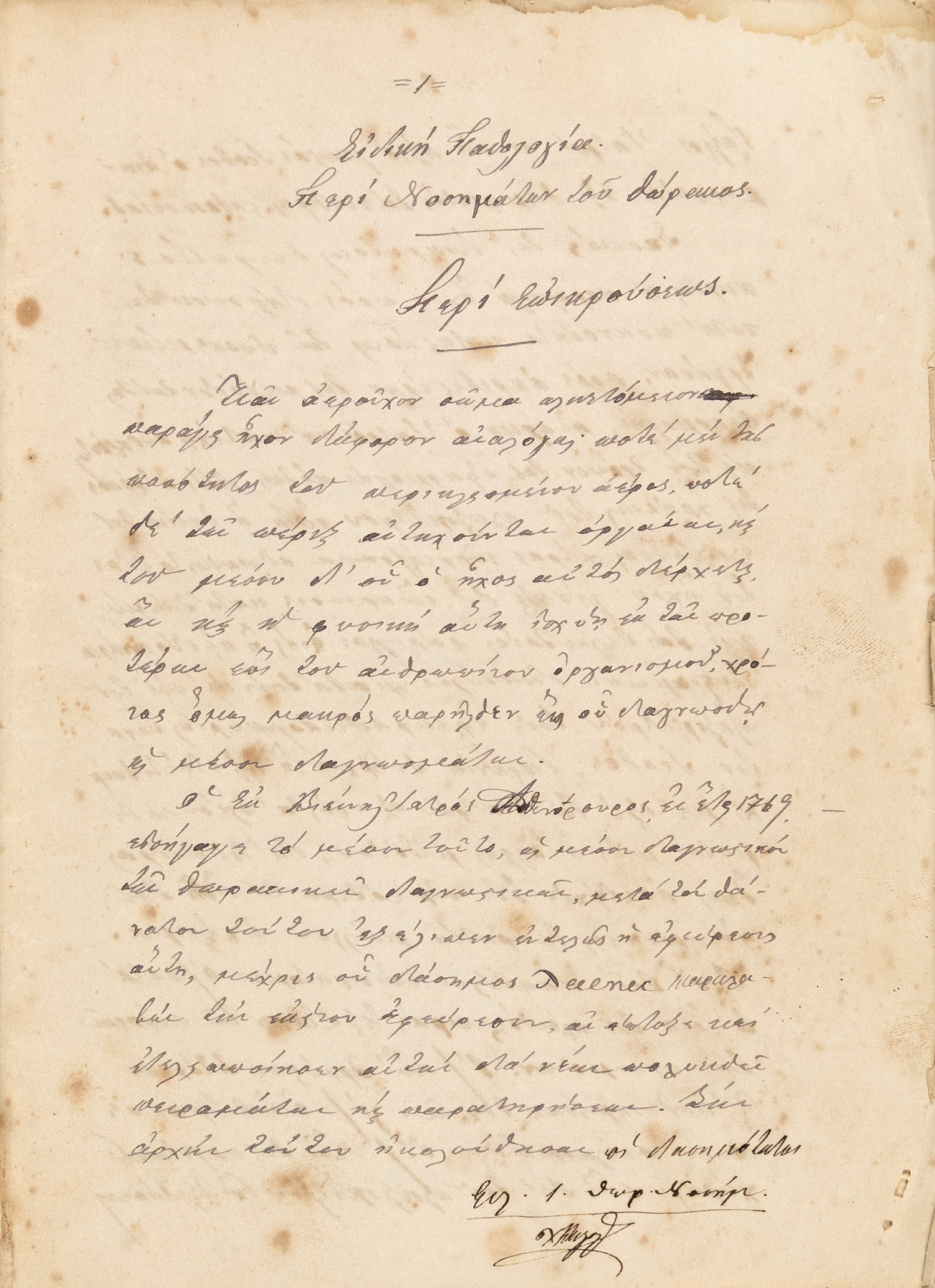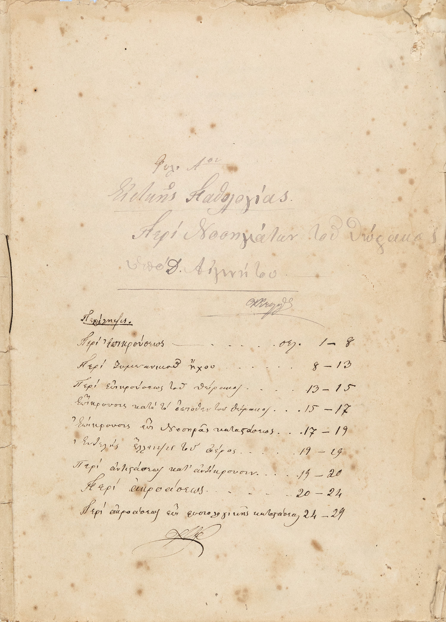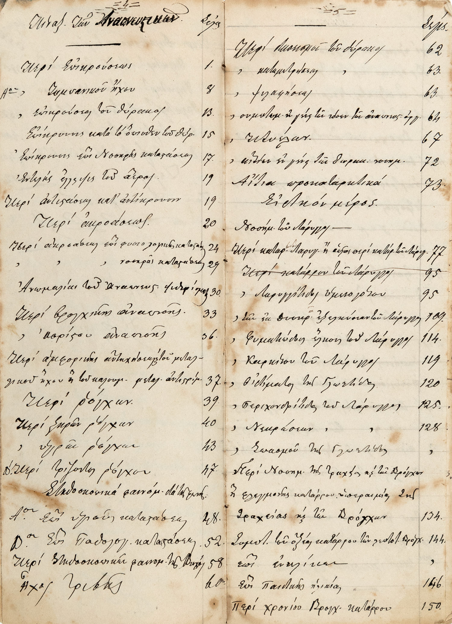 Τιμή εκτίμησης: € 300 - 400Γραμμένο με μελάνι σε 7 τεύχη, 109 συνολικά φύλλα, 205 x 155 mm., 56 + (113)-220 + (249)-276 σ. (λείπουν τα φυλλάδια Γ´ - Δ΄ , Θ’ και ένα ή περισσότερα φυλλάδια μετά το φυλ. Ι’). [μαζί:] Φυλλάδιον Β´. Τῶν κοιλιακῶν Αἰγινήτου. [γ´τέταρτο 19ου αιώνα]. • Γραμμένο με μελάνι σε τεύχος 26 φύλλων, 205 x 155 mm., (37)-84 σ. (λείπει το πρώτο και ένα ή περισσότερα φυλλάδια μετά το παρόν). [μαζί:] Φυσιολογία ὑπό Ρουσάκη, φυλ. Α´[—ΣΤ´]. 1865. • Γραμμένο με μελάνι σε 5 τεύχη, 80 συνολικά φύλλα, 205 x 155 mm., 38 + (79)-201 σ. (λείπει το φυλ. Β´). Τίτλος, τόπος, ημερομηνία και δυσανάγνωστη υπογραφή στο πρώτο φύλλο (χ.α): «Ἐν Ἀθήναις την κ’ 8βρίου 1865». [μαζί:] Πίναξ τῆς φυσιολογίας. Γενικῆς τε κ´ Εἰδικῆς Παθολογίας κ´ Μαιευτικῆς. 1867. • Ευρετήριο γραμμένο με μελάνι σε τεύχος 24 φύλλων, 205 x 80 mm., 40 σ. Τόπος και ημερομηνία στη σ. 3: «25/10/67 Ἀθήναι». [μαζί:] Τρία χειρόγραφα τεύχη ἀπό παραδόσεις μαθημάτων ἰατρικῆς. • Γραμμένα με μελάνι, 14, 19 και 16 φ., 205 x 155 mm. Τίτλοι στη σ. [1]: «Δυσκρασία», «Φαρμακολογία» και «Φυλ. Β´. Συφιλιδικῶν […]», τόπος, ημερομηνία και δυσανάγνωστη υπογραφή στο πρώτο φυλλάδιο: «Πάτραις [;], 11 Μαΐου 1863». • Ο Διονύσιος Αιγινήτης (1818-1884) διετέλεσε καθηγητής στο Πανεπιστήμιο Αθηνών από 1849 έως το 1884. Τα δύο πρώτα τμήματα του παρόντος λαχνού αποτελούν σημειώσεις από τα μαθήματα που παρέδιδε, και μάλιστα αναφέρονται μεταξύ άλλων στη διαγνωστική μέθοδο της επίκρουσης και της ακρόασης του θώρακα, την οποία είχε διδαχθεί στο εξωτερικό και πρώτος εφάρμοσε στην Ελλάδα.