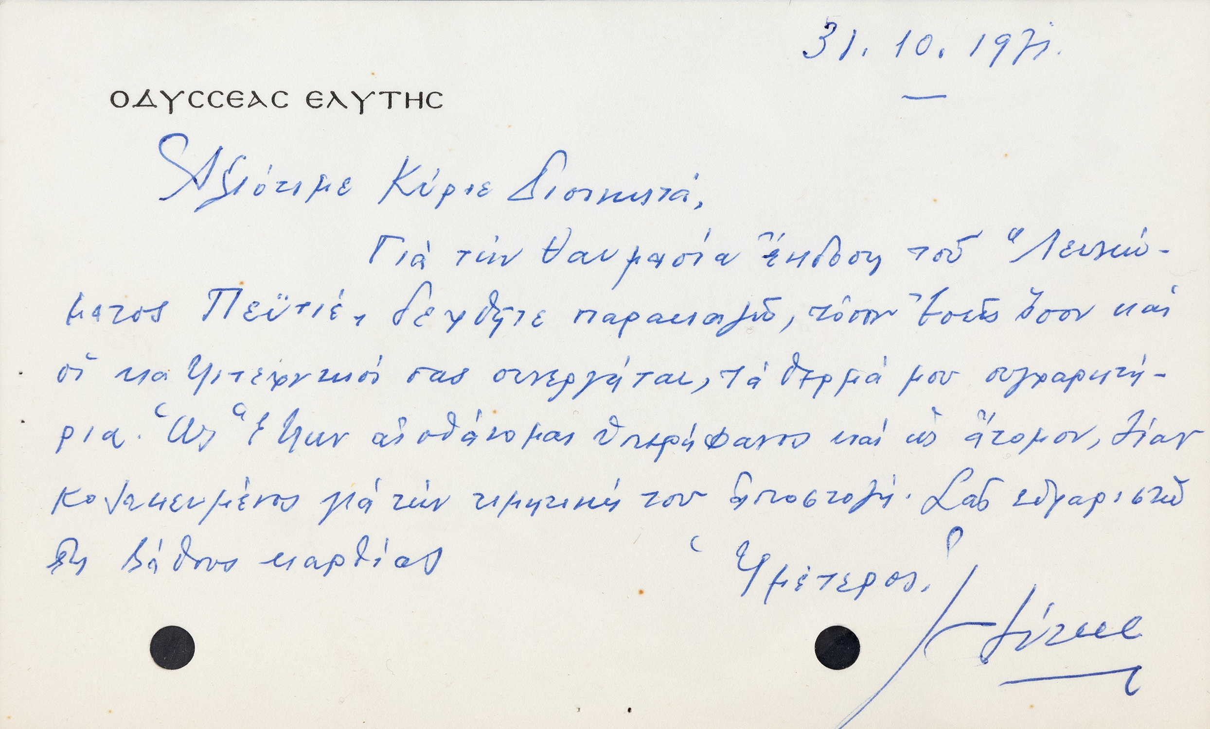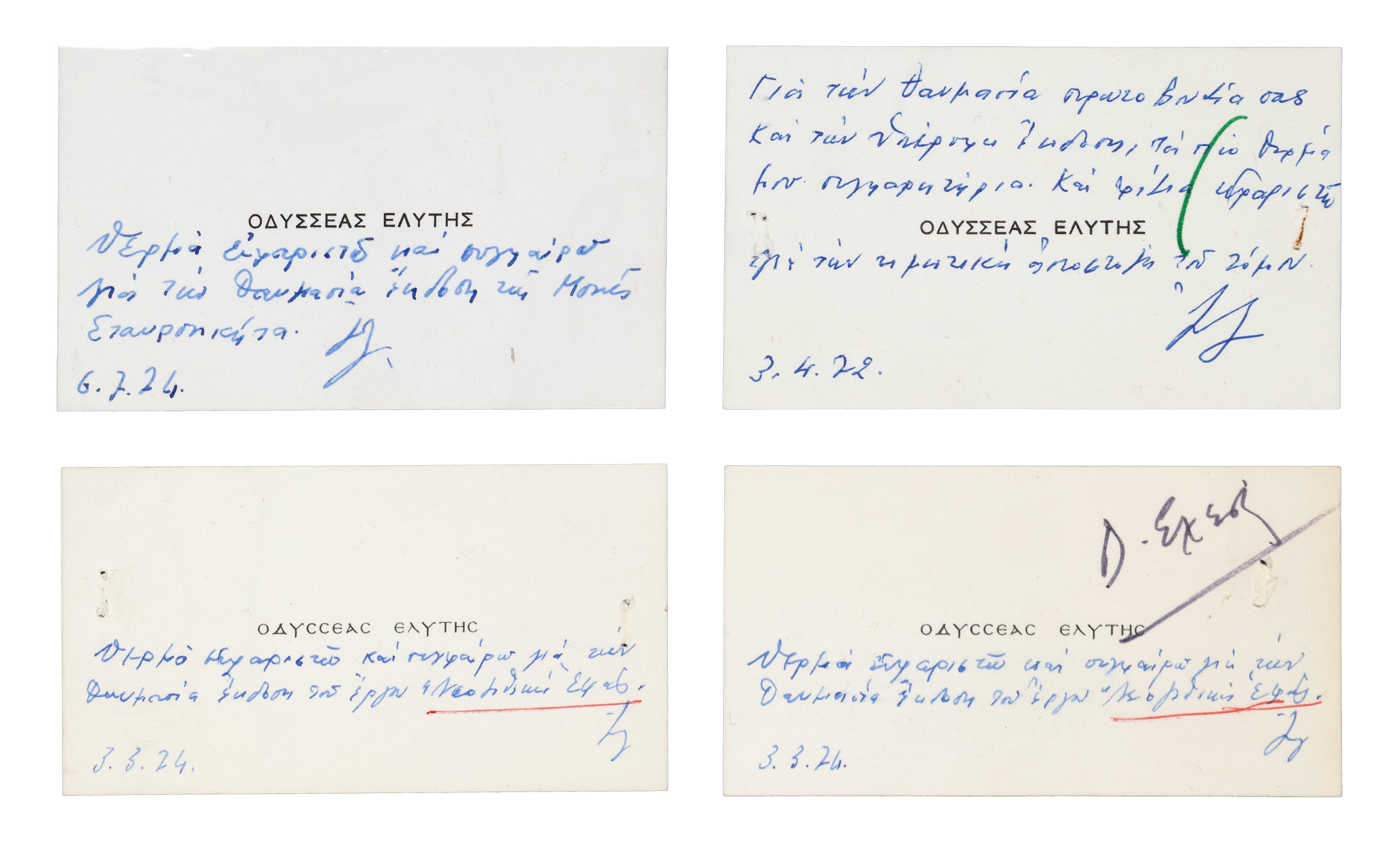 Τιμή εκτίμησης: € 150 - 200Γραμμένα σε κάρτες, η πρώτη 92 x 146 mm., οι υπόλοιπες 47 x 89 και 52 x 88 mm. (δύο τρύπες από διατρητική μηχανή στην πρώτη). Έντυπη επικεφαλίδα («ΟΔΥΣΣΕΑΣ ΕΛΥΤΗΣ»). (5) • «... Γιά τήν θαυμαστή ἔκδοση τοῦ «Λευκώματος Πεϋτιέ» δεχθεῖτε παρακαλῶ, τόσον Ἐσεῖς ὅσον καί οἱ καλλιτεχνικοί σας συνεργάτες, τά θερμά μου συγχαρητήρια. Ὡς Ἕλλην αἰσθάνομαι ὑπερήφανος καί ὡς ἄτομον, λίαν κολακευμένος γιά τήν τιμητική του ἀποστολή...» (31 Οκτωβρίου 1971).