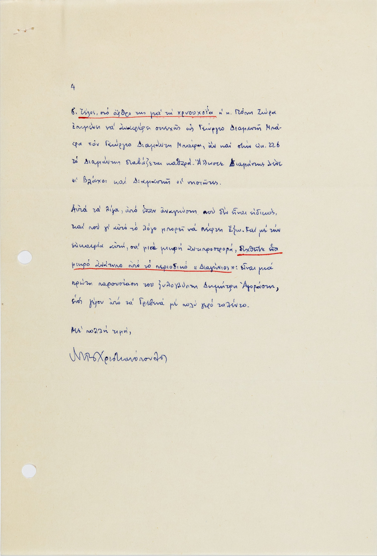 Αὐτόγραφη ἐπιστολή μὲ τὴν ὑπογραφὴ του («Ντῖνος Χριστιανόπουλος») πρὸς τόν Ἐμμανουὴλ Χ. Κάσδαγλη, διευθυντὴ τοῦ ΜΙΕΤ («Ἀξιότιμε κ. Διευθυντά»), μὲ τὴν ὁποία τὸν εὐχαριστεὶ γιὰ τὴν ἀποστολὴ τῆς ἔκδοσης «Νεοελληνικὴ χειροτεχνία» καὶ τοῦ ἐκθέτει τὶς παρατηρήσεις του σχετικὰ μὲ τὴν ἔκδοση.