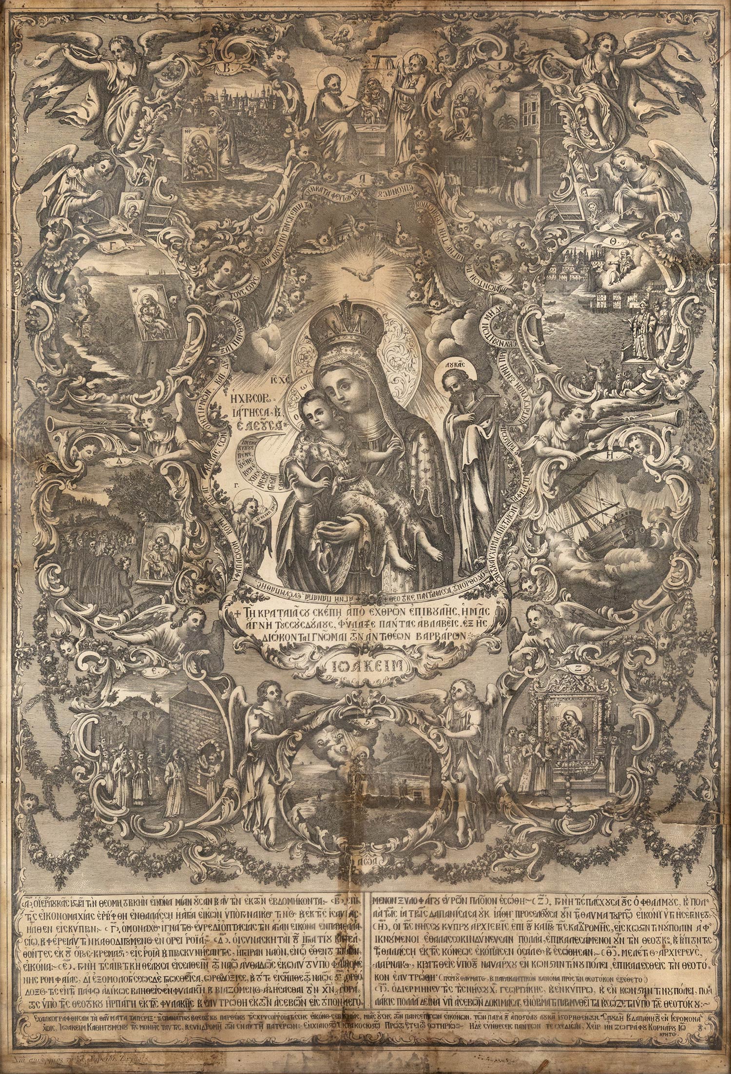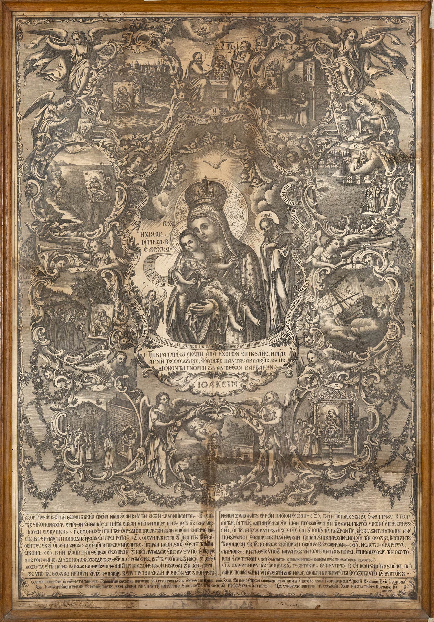 Τιμή εκτίμησης: € 1.000 - 1.500Χαλκογραφία, 705 x 480 mm. (οξείδωση στα περιθώρια, σχίσιμο κάτω δεξιά και κάτω στο μέσο, μικρή τρύπα στη συμβολή τους, ίχνη από κόλλα). Σχεδιασμένη από τον Ιωάννη Κορνάρο, τον Κρήτα. Παπαστράτου 553 («Ἡ χαλκογραφία ἀποτελεῖ πολύτιμη πηγή πληροφοριῶν γιά τίς παραδόσεις πού συνδέονται μέ τήν εἰκόνα τῆς Χρυσορροϊάτισσας. Οἱ μικρές σκηνές θαυμάτων καί τά ἐπεξηγηματικά τους κείμενα ἐξιστοροῦν τήν εὕρεσή της, τήν ἵδρυση τοῦ πρώτου προσκυνήματος, πού ἀποτέλεσε τόν πυρήνα τοῦ μοναστηριοῦ, καί τά κυριότερα θαύματα πού ἀποδίδονται στήν είκόνα, άπό τά ὁπόια ὁρισμένα ἀναφέρονται σέ γνωστά πρόσωπα τοῦ 18ου αἰωνα, πού ἔπαιξαν ρόλο στήν ἱστορία τοῦ νησιοῦ [Κύπρος]».