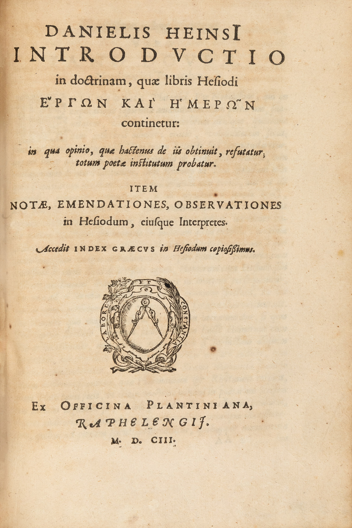Ἡσιόδου Ἀσκραίου τα εὑρισκόμενα. Hesiodi Ascraei quae extant [—Danielis Heinsi introductio in doctrinam, quae libris Hesiodi Ἔργων καί ἡμερῶν].