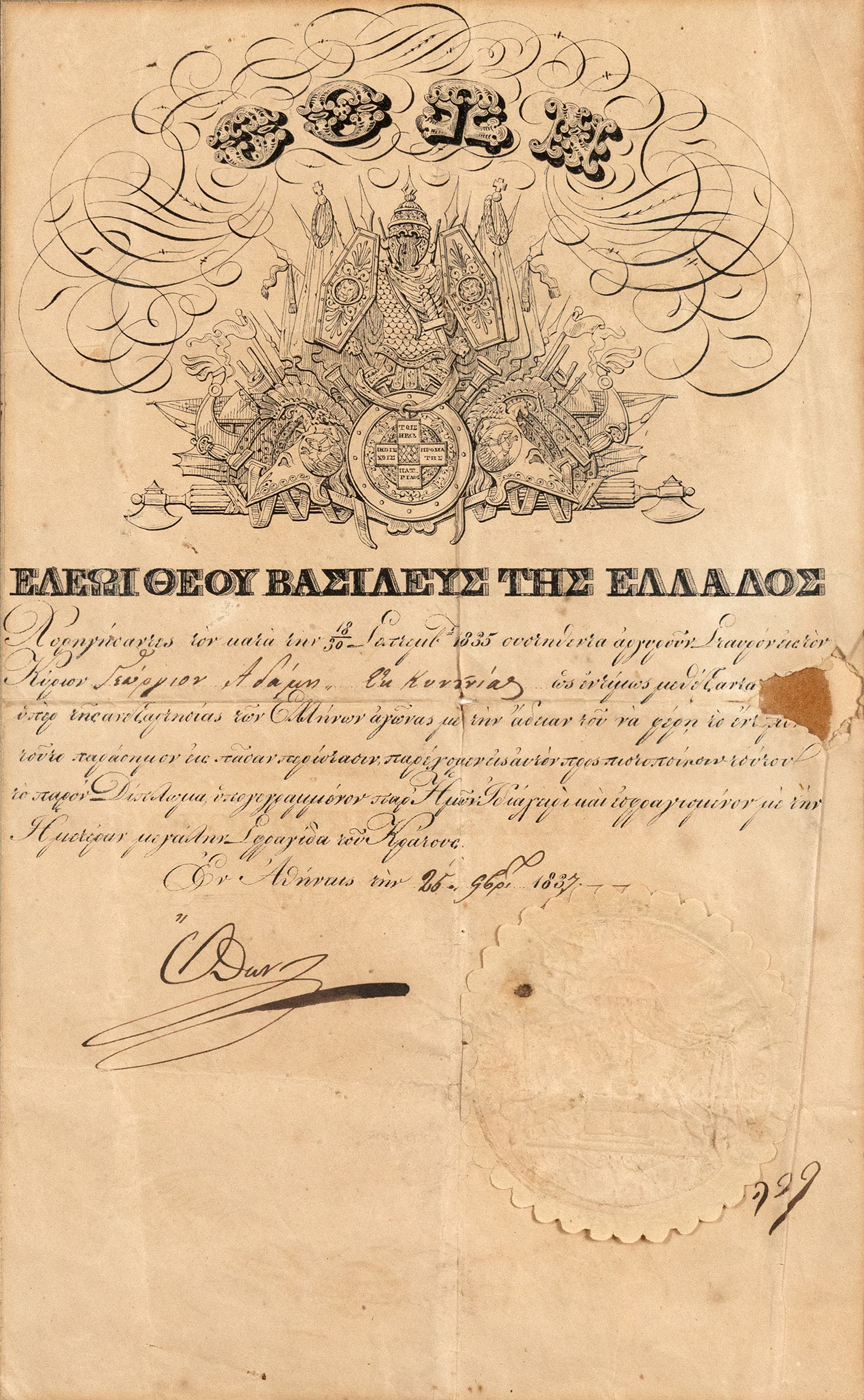 Ἀπονομή διπλώματος μέ τὴν ὑπογραφή του («Ὄθων»), μέ τό ὁποίο πιστοποιεῖται ἡ ἀπονομή τοῦ Ἀργυροῦ Σταυροῦ στόν Γεώργιο Ἀδάμη «ὡς ἐντίμως μεθέξαντα [τοῦ] ὑπέρ τῆς ἀνεξαρτησίας τῶν Ἑλλήνων ἀγῶνος».