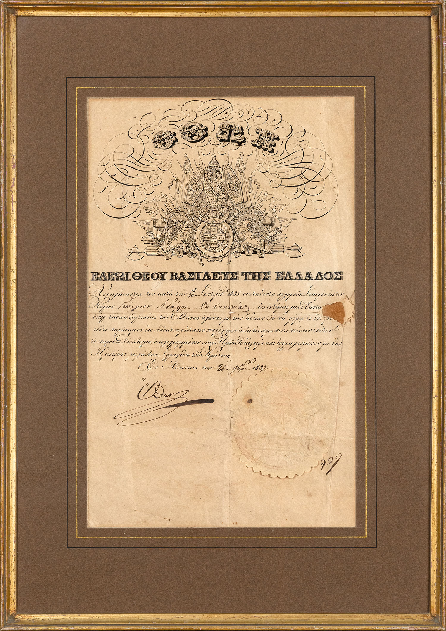 Τιμή εκτίμησης: € 400 - 6001 σελίδα, 330 x 205 mm. (τρύπα δεξιά στο μέσο με απώλεια μίας λέξης). Λιθόγραφο συμπληρωμένο με το χέρι, λιθόγραφη επικεφαλίδα, ανάγλυφη επικολλημένη σφραγίδα. Σε κορνίζα.