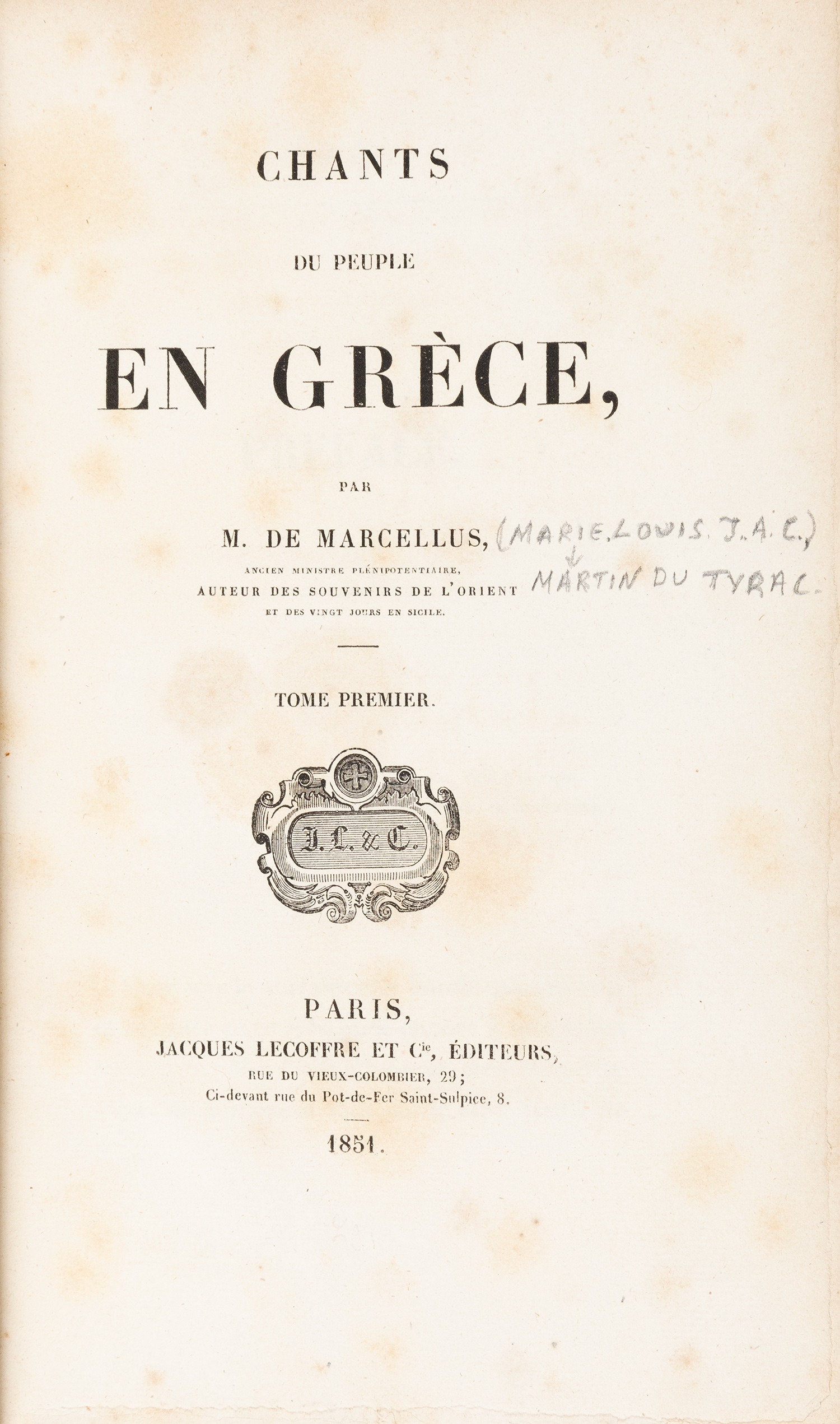 Τιμή εκτίμησης: € 150 - 2002 τόμοι, 8ο, XIX + 428 και 496 σ. (ελαφρά οξειδωμένο αντίτυπο). Ελληνικό κείμενο και γαλλική μετάφραση σε αντικριστές σελίδες. Μεταγενέστερη δερμάτινη ράχη (μικρές φθορές, μαρμαρογραφημένα τα ακρόφυλλα, αξάκριστο, ex dono D. Henrici Cailloué). ΒΕΦΗ 1851.49-50, Λαγανάς 1078. (2)