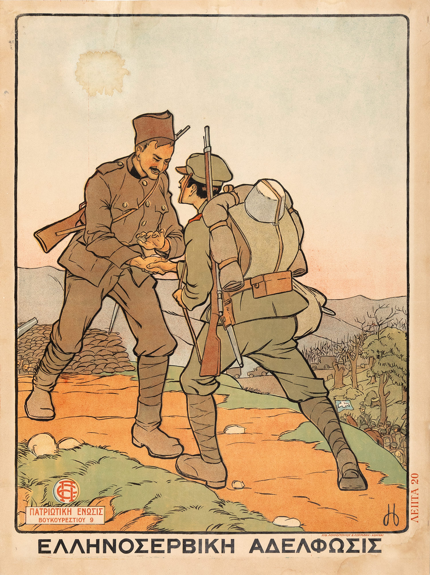 Χρωμολιθογραφία, 607 x 458 mm. (τρία μικρά επιδιορθωμένα σχισίματα στην πάνω πλευρά, λεκές πάνω αριστερά). Έκδοση της Πατριωτικής Ενώσεως.