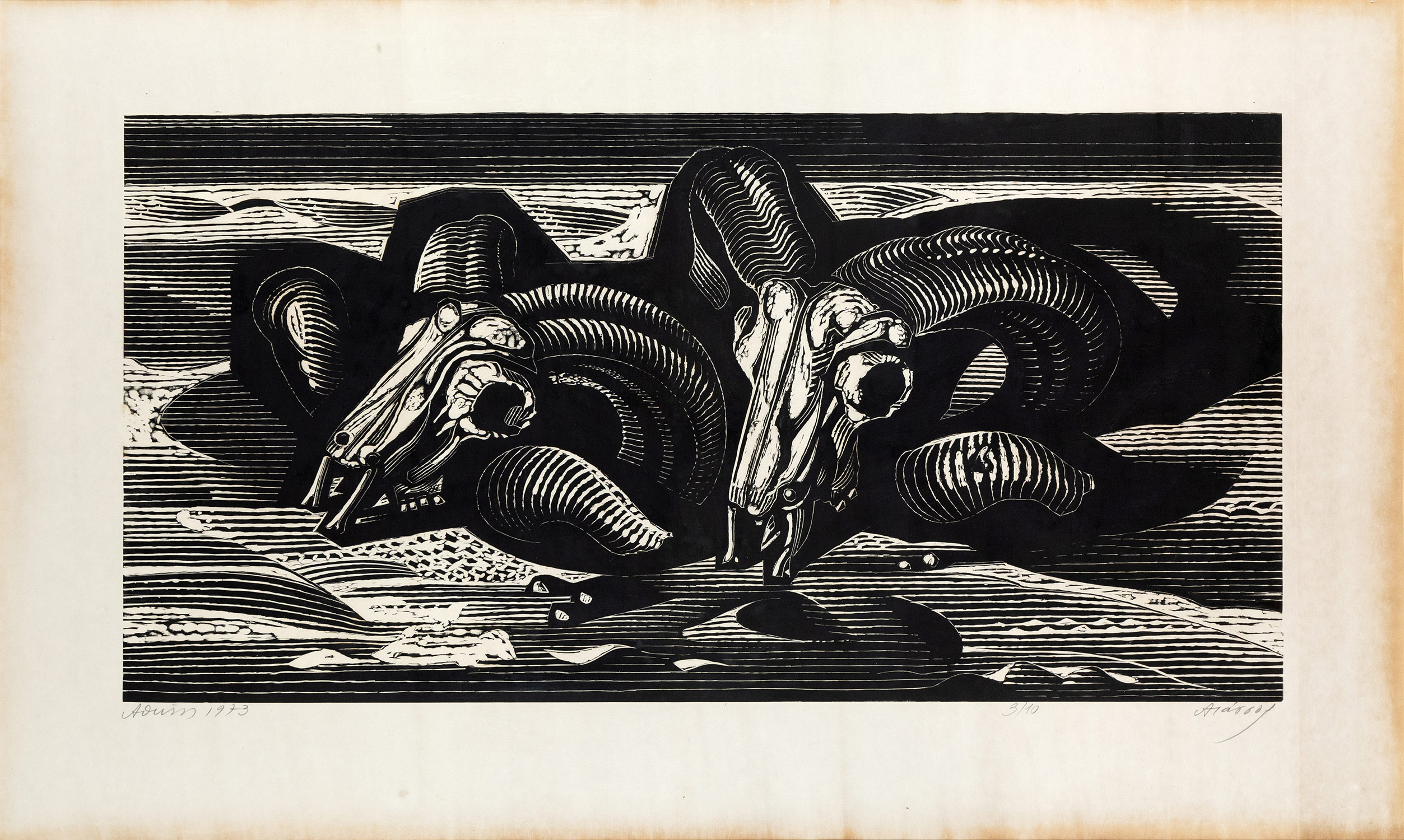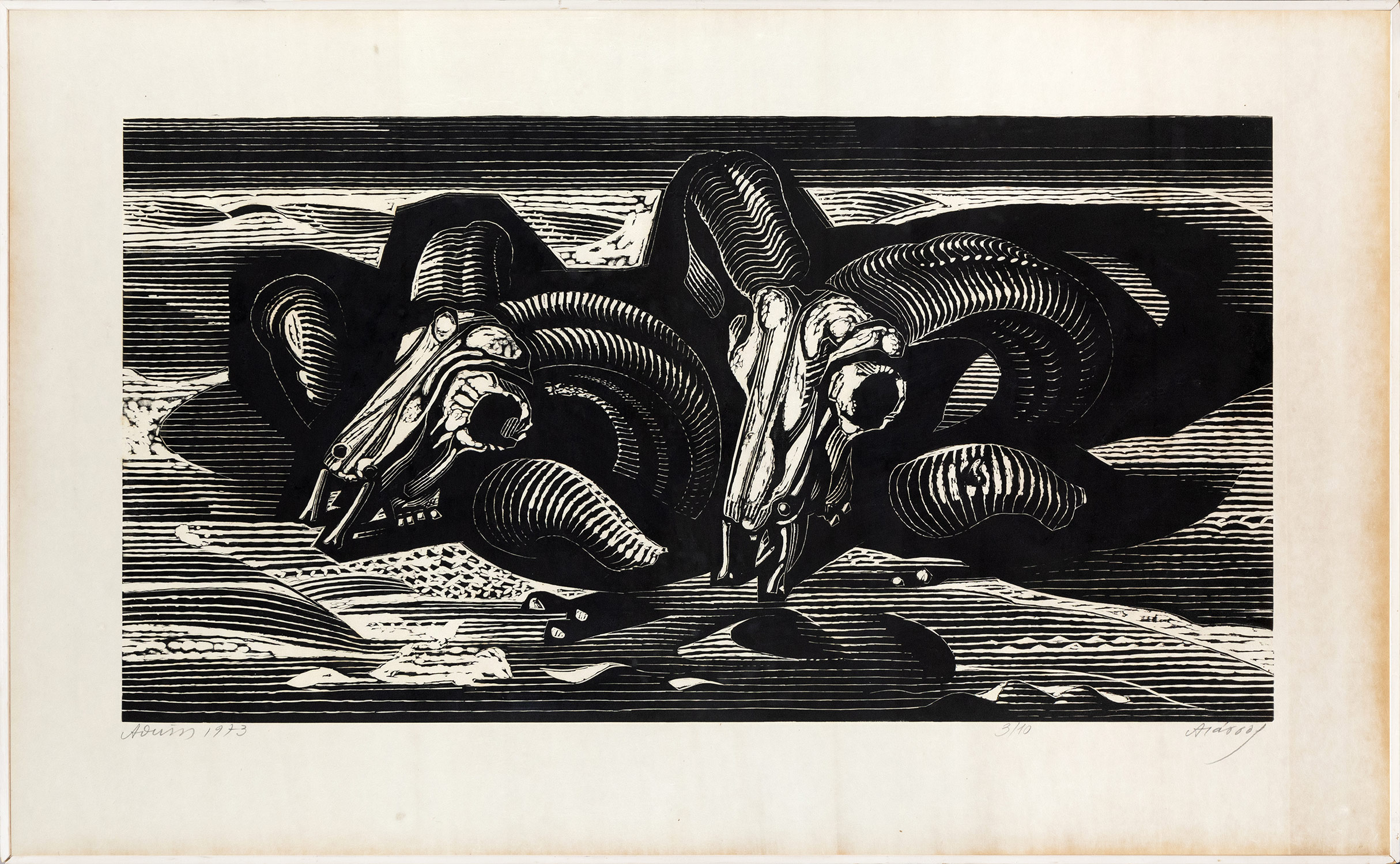 Ξυλογραφία σε πλάγιο ξύλο, 515 x 995 mm. Έκδοση σε 10 αντίτυπα, τόπος, χρονολογία, αρίθμηση και υπογραφή στο κάτω περιθώριο με μολύβι. Σε κορνίζα.