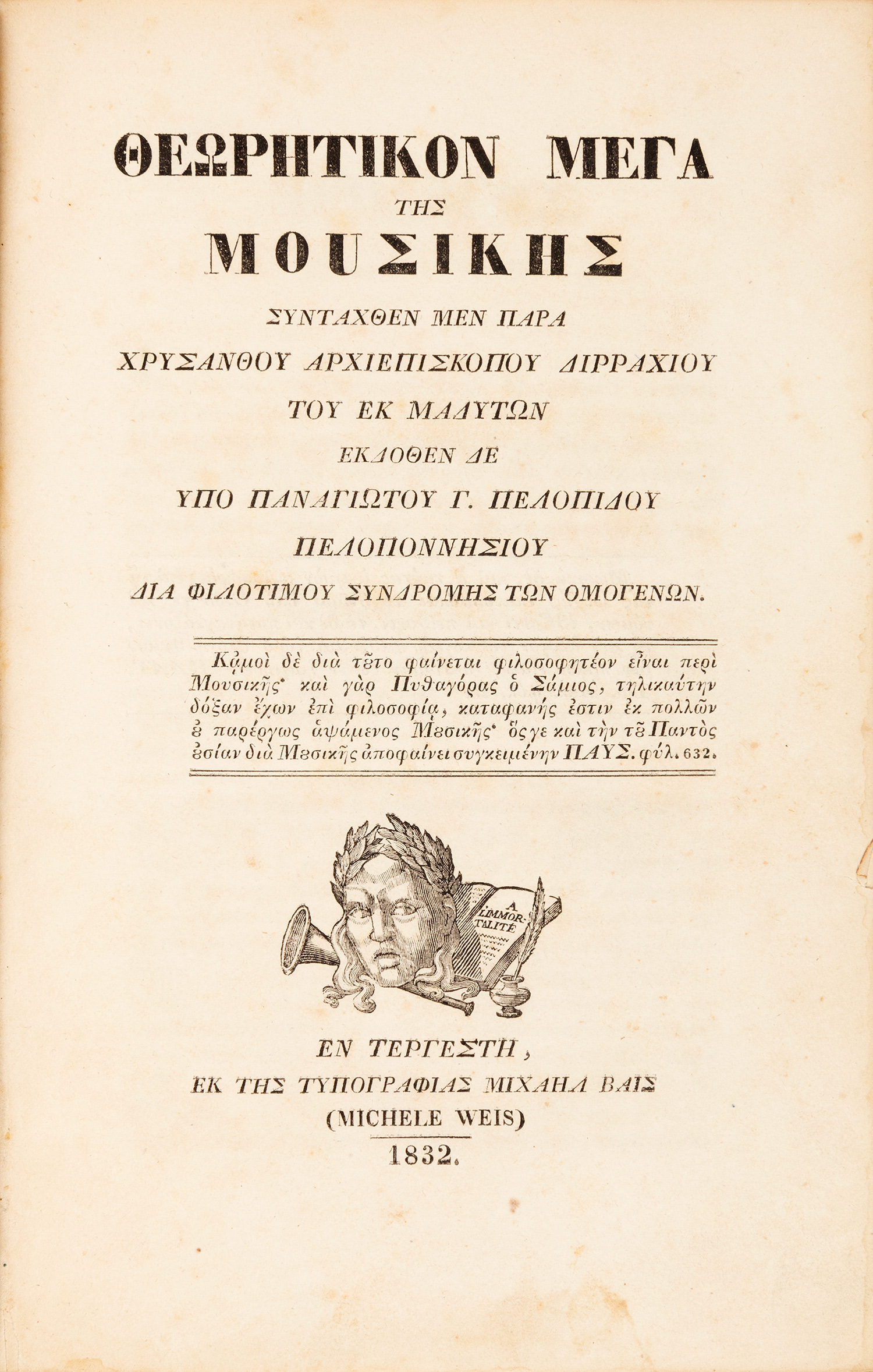 Τιμή εκτίμησης: € 500 - 7008ο, ιγ´ + 222 + LXIV σ. (λείπει το τελευταίο φύλλο: σ. LXV-LXVI (τελευταίο φύλλο του καταλόγου συνδρομητών), λίγο οξειδωμένο αντίτυπο). Ξυλόγραφη βινιέτα στον τίτλο, χαλκόγραφος πίνακας εντός κειμένου στη σ. 128 («Τό Δισδιαπασῶν Σύστημα»), κατάλογος συνδρομητών. Νεότερο δέρμα (λίγοι μικροί λεκέδες, έχουν διατηρηθεί τα ελεύθερα ακρόφυλλα από παλαιότερη βιβλιοδεσία, κτητορική σημείωση στο πάνω: «Antoian Athenogenes / 1858»). Ηλιού 1832.69, Χατζηθεοδώρου 228 («Πρόκειται γιά τό περισπούδαστο καί μοναδικό ἔργο τοῦ Χρυσάνθου, μέ τό ὁποῖο τεκμηριώνεται θεωρητικά καί ἀποκρυσταλλώνεται τό νέο σύστημα γραφῆς τῆς βυζαντινῆς μουσικῆς. Τό ἔργο ἀποτέλεσε καί ἀποτελεῖ μέχρι σήμερα τή βάση ὅλων τῶν μεταγενέστερων θεωρητικῶν...») • Η ΣΠΑΝΙΑ ΠΡΩΤΗ ΕΚΔΟΣΗ.
