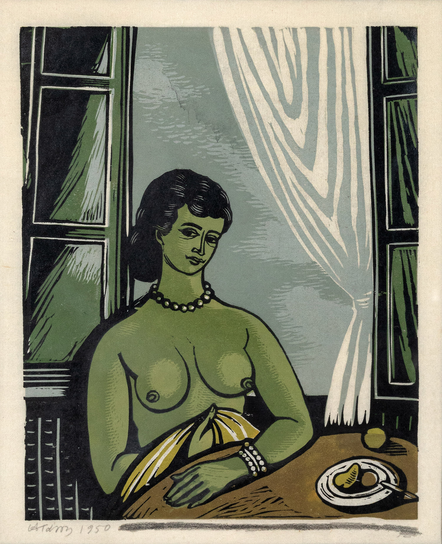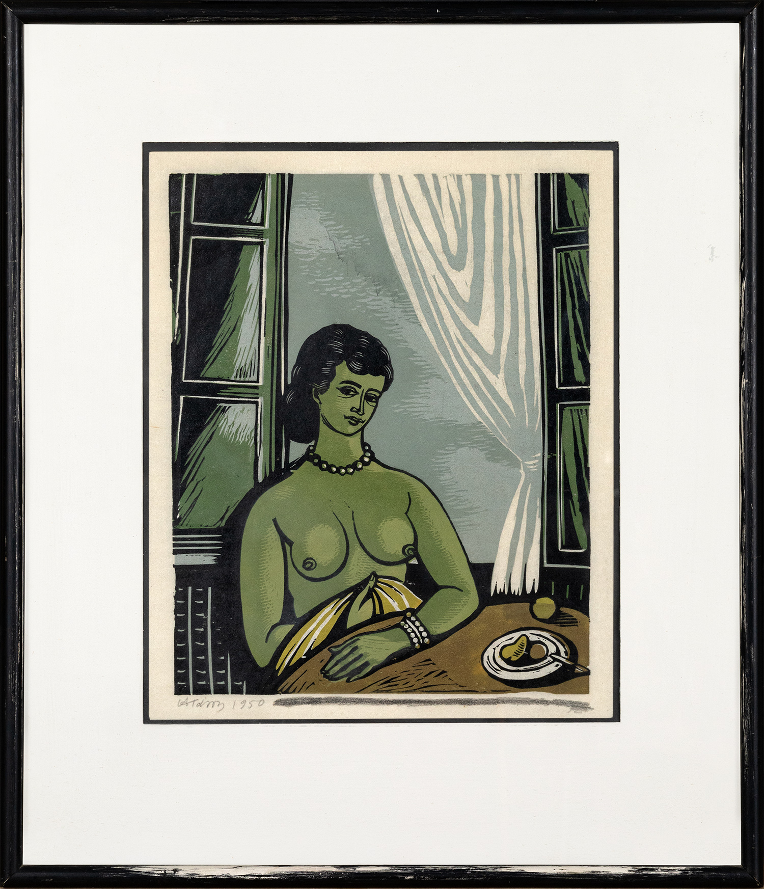 Έγχρωμη ξυλογραφία σε πλάγιο ξύλο, 253 x 200 mm. (αποχρωματισμένη, αφιέρωση [;] στο κάτω περιθώριο σβησμένη με μολύβι). Υπογραφή και χρονολογία στο κάτω περιθώριο με μολύβι. Σε κορνίζα.