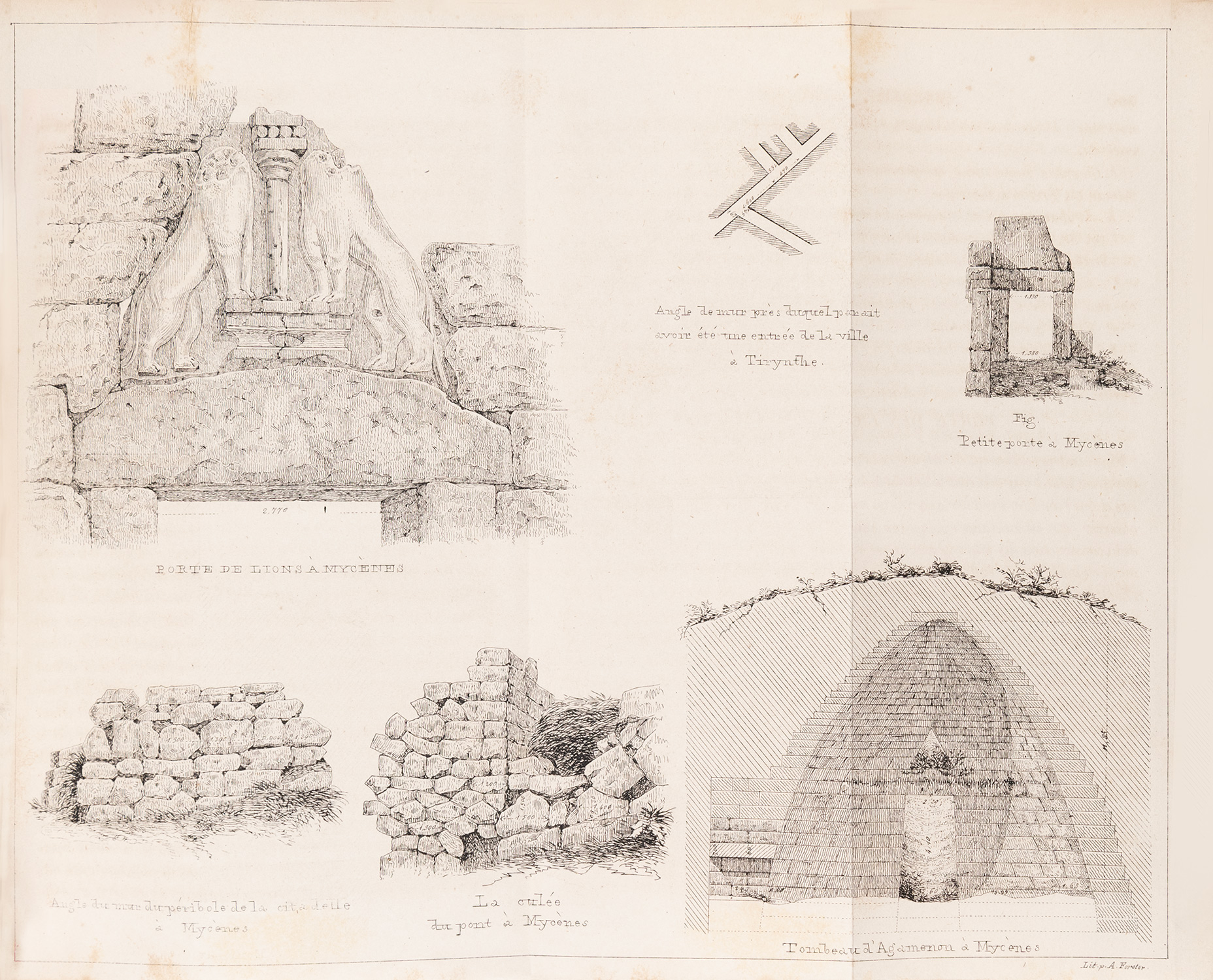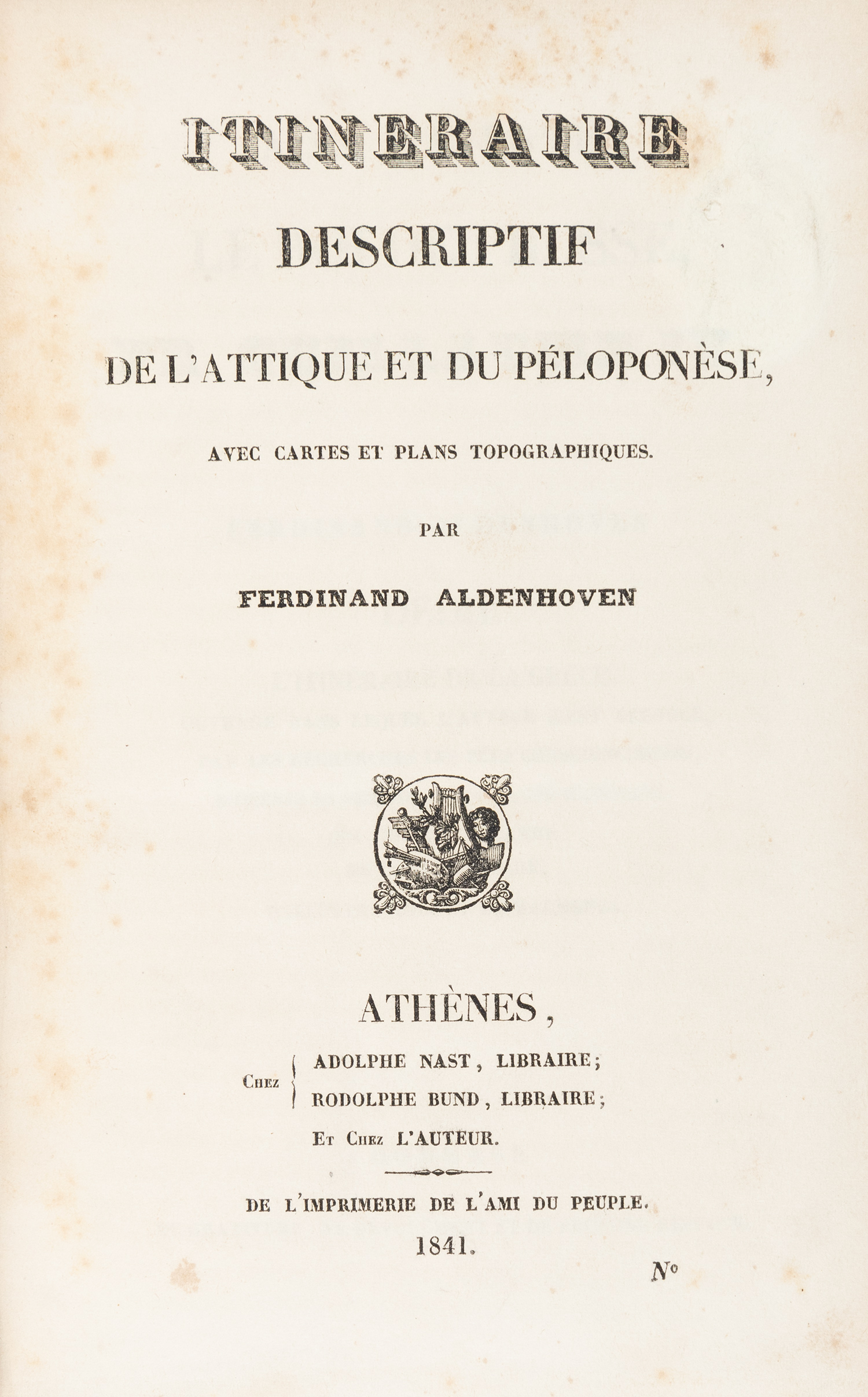 Τιμή εκτίμησης: € 300 - 400ΠΡΩΤΗ ΕΚΔΟΣΗ. 8ο (213 x 135 mm.), XXVIII + 436 σ. Mε 20 λιθόγραφους χάρτες και τοπογραφικά (4 αναδιπλούμενα) και έναν αναδιπλούμενο πίνακα με σχέδια μνημείων. Μεταγενέστερο πανί (σχισίματα στις ενώσεις, μικρές επιδιορθώσεις στην κορυφή και τη βάση της ράχης, ξεθωριασμένο, χρυσή διακόσμηση στη ράχη, εμπίεστη στα καλύμματα, χρυσωμένες οι ακμές, σε νεότερη θήκη). Blackmer 15, Contominas 7.
