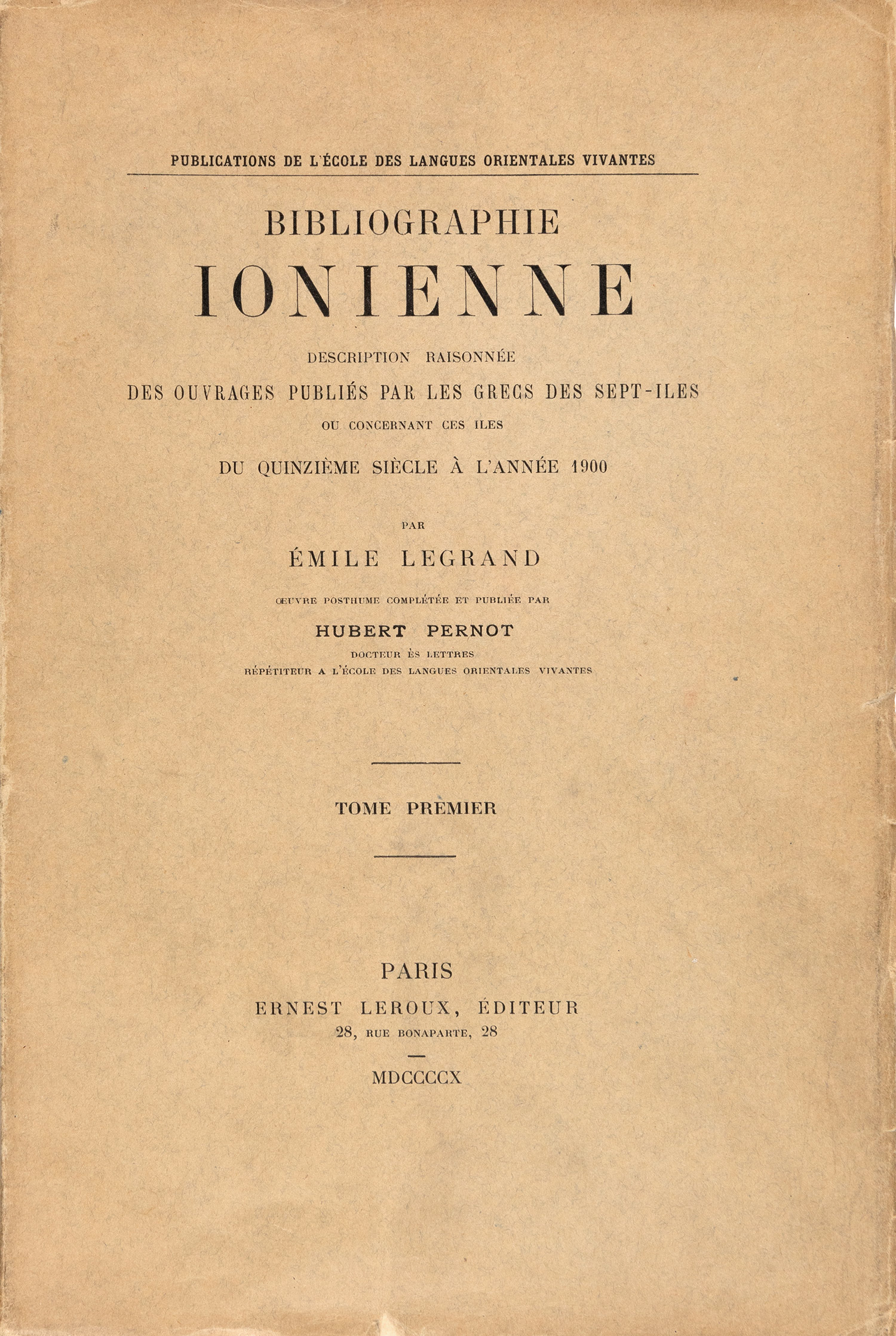 Bibliographie Ionienne. Description raisonnée des ouvrages publiés par les Grecs des Sept-Iles, ou concernant ces iles, du quinzième siècle à l’année 1900.