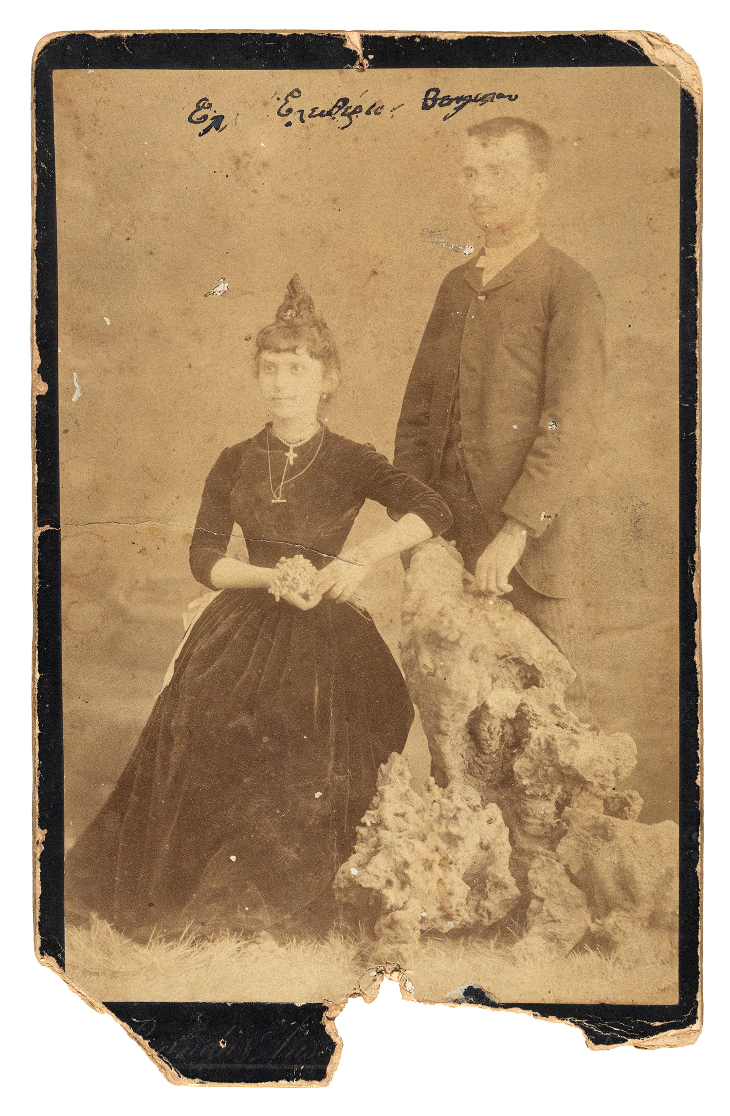 Τιμή εκτίμησης: € 150 - 200Σημείωση στην πίσω όψη («Τό ζεῦγος Βενιζέλου / νεόνυμφον»), τύπωμα αλμπουμίνας επικολλημένο σε πασπαρτού, 189 x 123 mm. (λερωμένο, φθορές στην κάτω πλευρά).