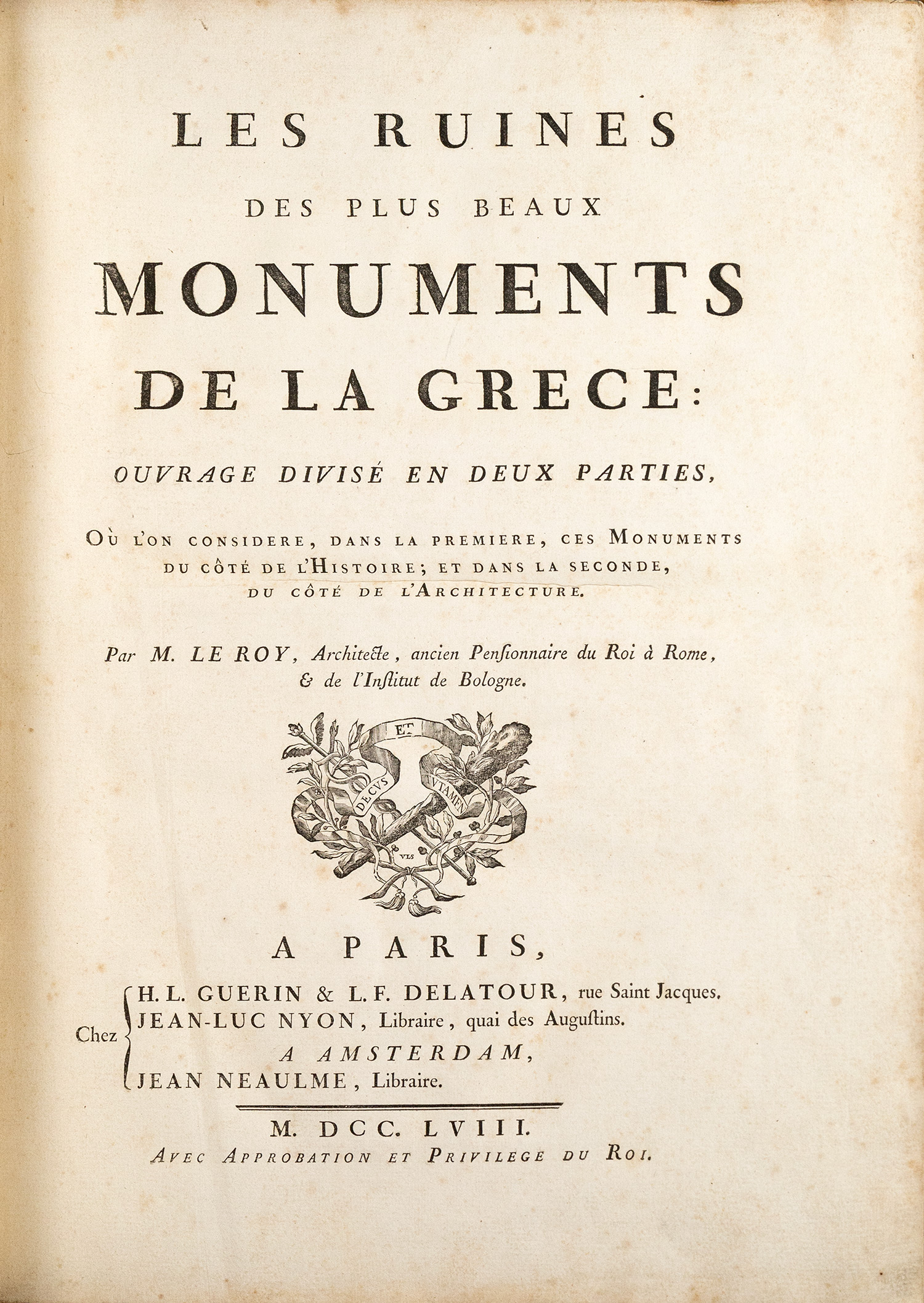 Les ruines des plus beaux monuments de la Grèce, ouvrage divisé en deux parties, où l’on considère, dans la première, ces monuments du côté de l’histoire, et dans la seconde, du côté de l’architecture.