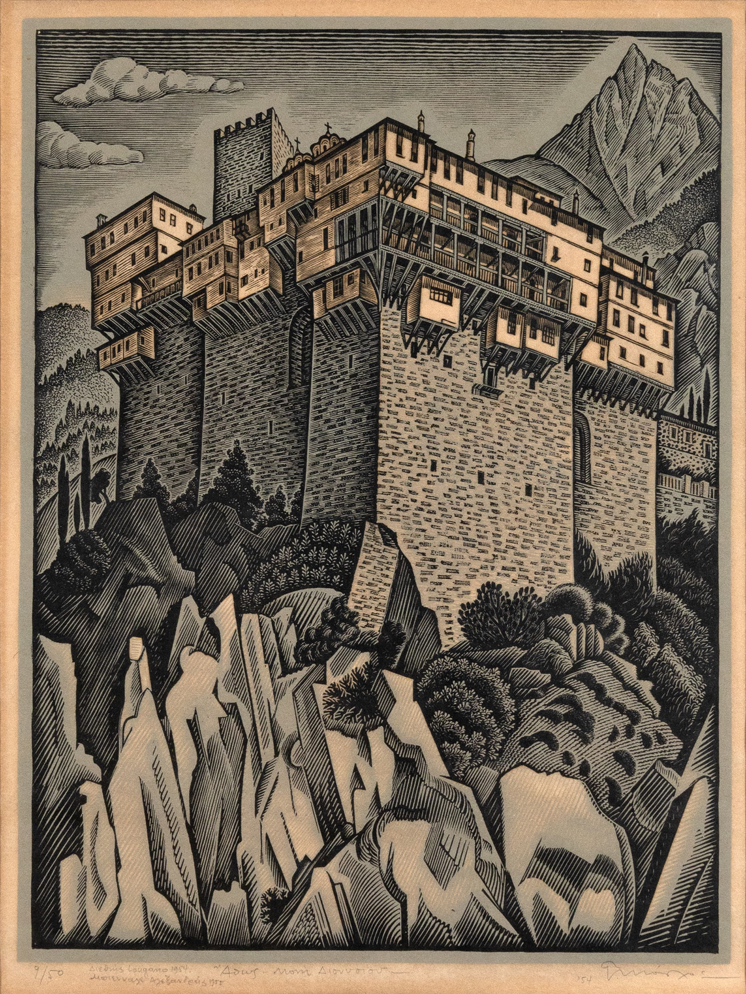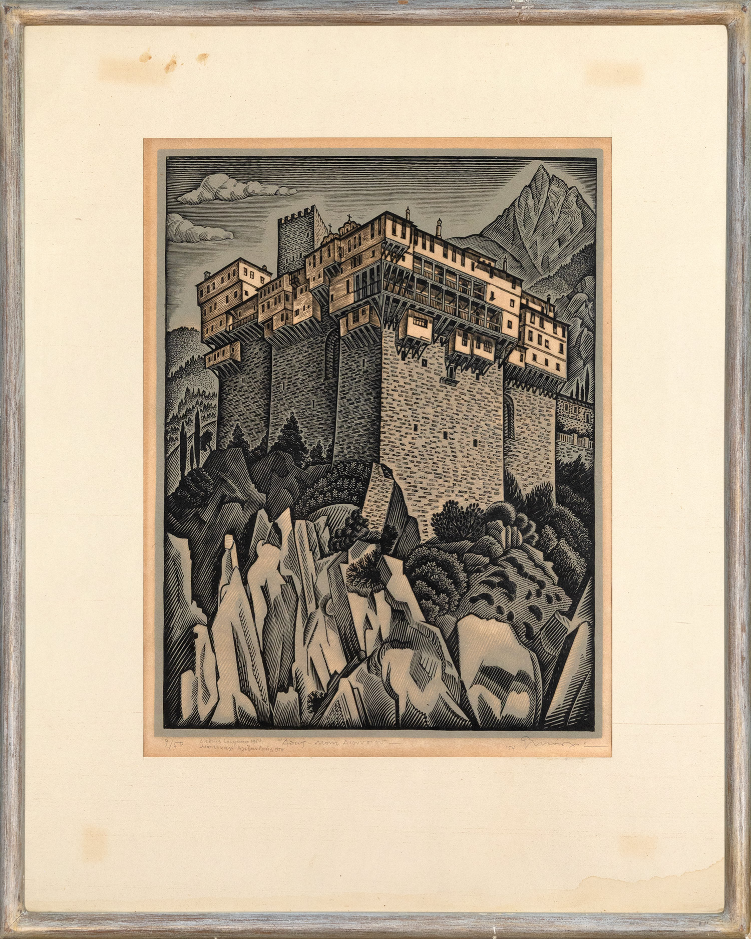 Τιμή εκτίμησης: € 600 - 800Δίχρωμη ξυλογραφία σε όρθιο ξύλο, 390 x 295 mm. Έκδοση σε 50 αντίτυπα, αρίθμηση, σημείωση («Διεθνής Lougano 1954 / Μπιεννάλε Ἀλεξανδρείας 1955»), τίτλος, χρονολογία και υπογραφή στο κάτω περιθώριο με μολύβι, ετικέτα με ιδιόχειρη σημείωση του χαράκτη σχετική με τα στοιχεία του έργου στην πίσω όψη. Σε κορνίζα.
