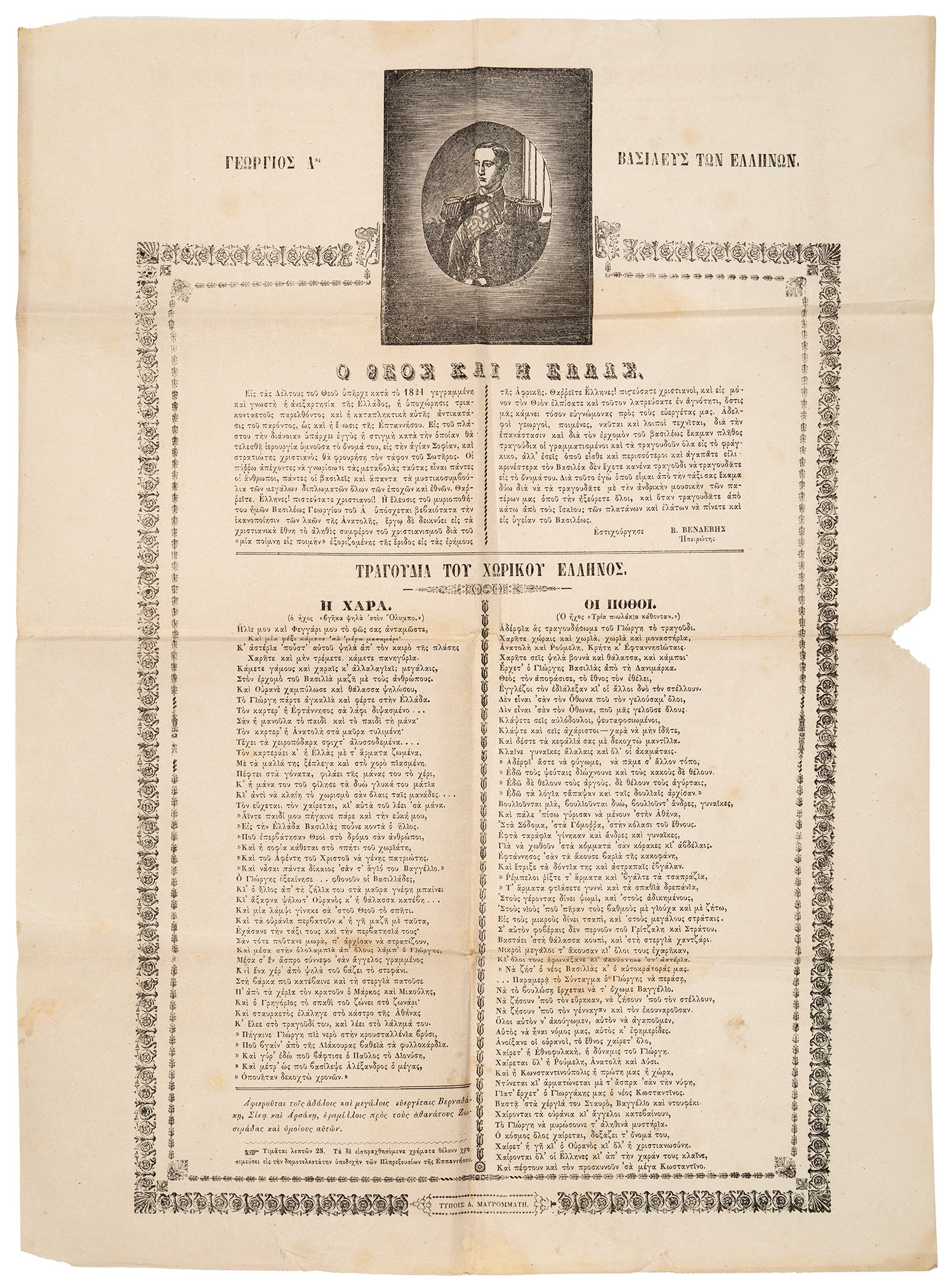 Τιμή εκτίμησης: € 150 - 200Μονόφυλλο, 490 x 360 mm. (ελαφρά οξειδωμένο, κομμένο μικρό τμήμα από το δεξιό περιθώριο). Το κείμενο σε 2 στήλες και σε τυπογραφικό πλαίσιο, ξυλόγραφο πορτραίτο του Γεωργίου πάνω στο μέσο. Πρόλογος και δύο τραγούδια του Β. Βενδεβή. Αθήνα, Δ. Μαυρομμάτης, χ.χ. [1863 ή 1864]. ΒΕΦΗ (Μονόφυλλα), 10454 (1 μόνο αντίτυπο). • ΣΠΑΝΙΟ.