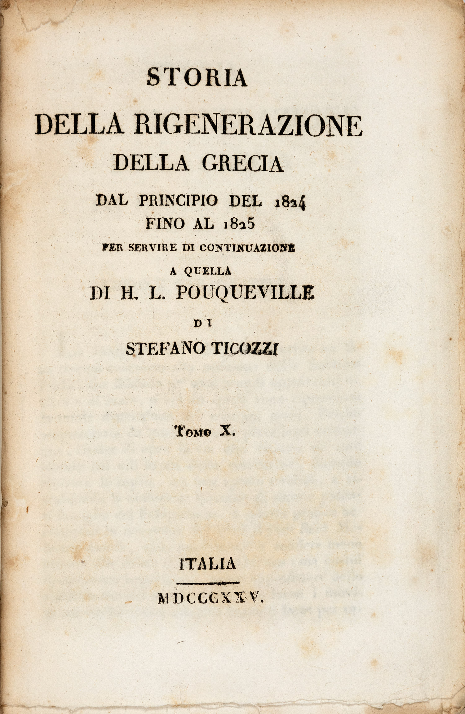 Storia della rigenerazione della Grecia, dal 1740 al 1824, tradotta ed illustrata da Stefano Ticozzi (τ. I-IX), [—dal principio del 1824 fino al 1825 per servire di continuazione a quella di H. L. Pouqueville (τ. X), —dal principio del 1825 fino all’aprile del 1826 (τ. XI-XII), —dal principio del gennajo 1826 fino al maggio dello stesso anno (τ. XIII), —dal principio del giugno 1826 fino all’agosto dello stesso anno (τ. XIV),—dal principio di settembre 1826 fino alla fine dello stesso anno (τ. XV), —dal gennajo 1827 a tutto marzo del 1827 (τ. XVI), —dall’aprile all’agosto del 1827 (τ. XVII).