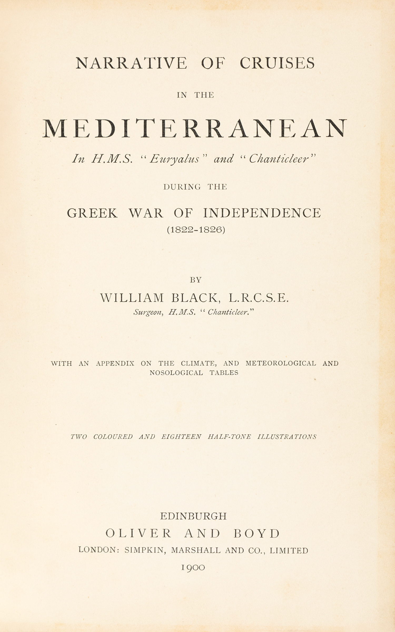 Narrative of cruises in the Mediterranean in H.M.S. "Euryalus" and "Chanticleer" during the Greek War of Independence (1822-1826). With an appendix on the climate, and meteorological and nosological tables.