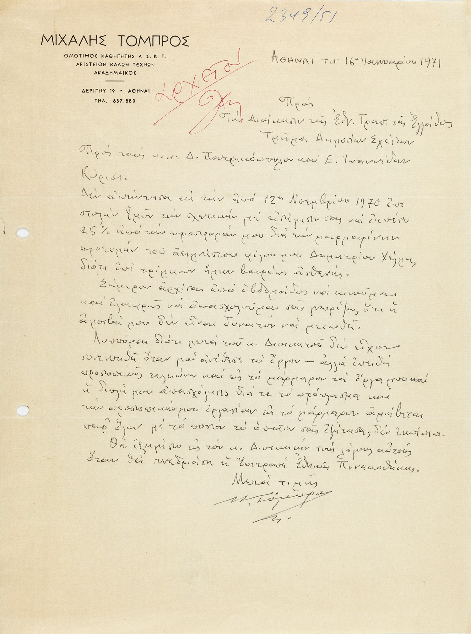 Τιμή εκτίμησης: € 150 - 2001 και 1 σελίδα, 288 x 215 mm. (τρύπες από διατρητική μηχανή στο αριστερό περιθώριο). Έντυπη επικεφαλίδα («ΜΙΧΑΛΗΣ ΤΟΜΠΡΟΣ / ΟΜΟΤΙΜΟΣ ΚΑΘΗΓΗΤΗΣ Α.Σ.Κ.Τ. / ΑΡΙΣΤΕΙΟΝ ΚΑΛΩΝ ΤΕΧΝΩΝ / ΑΚΑΔΗΜΑΪΚΟΣ / […]»). Μαζί δακτυλογραφημένο αντίγραφο της επιστολής της Τράπεζας με την οποία του ζητά την έκπτωση στην αμοιβή του (12 Νοεμβρίου 1970). (3) • «...Λυποῦμαι διότι μετά τοῦ κ. Διοικητοῦ δὲν εἶχον συνενοηθεῖ ὅταν μοῦ ἀνέθεσε τό ἔργον – ἀλλά ἐπειδή προσωπικῶς τελειώνω καί εἰς τό μάρμαρον τά ἔργα μου καί ἡ διπλή μου ἀπασχόλησις διά τε τό πρόπλασμα καί τήν προσωπικήν μου ἐργασίαν εἰς τό μάρμαρον ἀμοίβεται παρ’ ὅλων μέ τό ποσόν τό ὁποίον σᾶς ἐζήτησα, δέν ἐκπίπτω ...» (16 Ιανουαρίου).