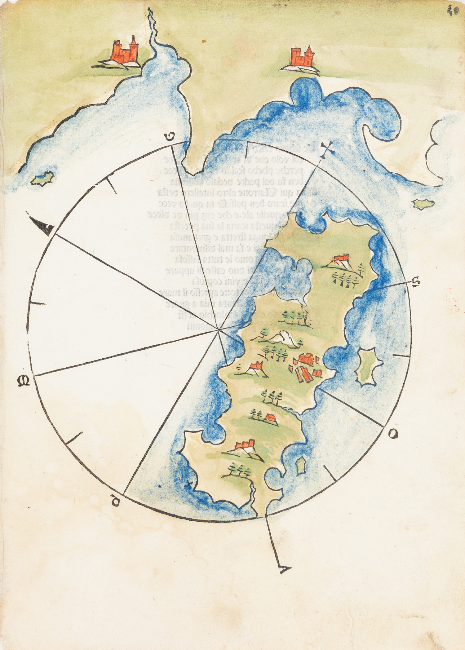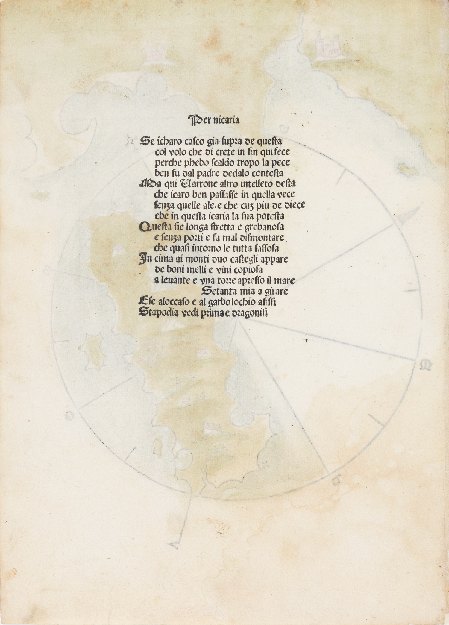 Ξυλόγραφος χάρτης της Σάμου, επιχρωματισμένος με το χέρι, 228 x 163 mm. Στην πάνω δεξιά γωνία χειρόγραφη σημείωση: «40», στην πίσω όψη το σονέτο που αναφέρεται στην Ικαρία. Zacharakis 3399.