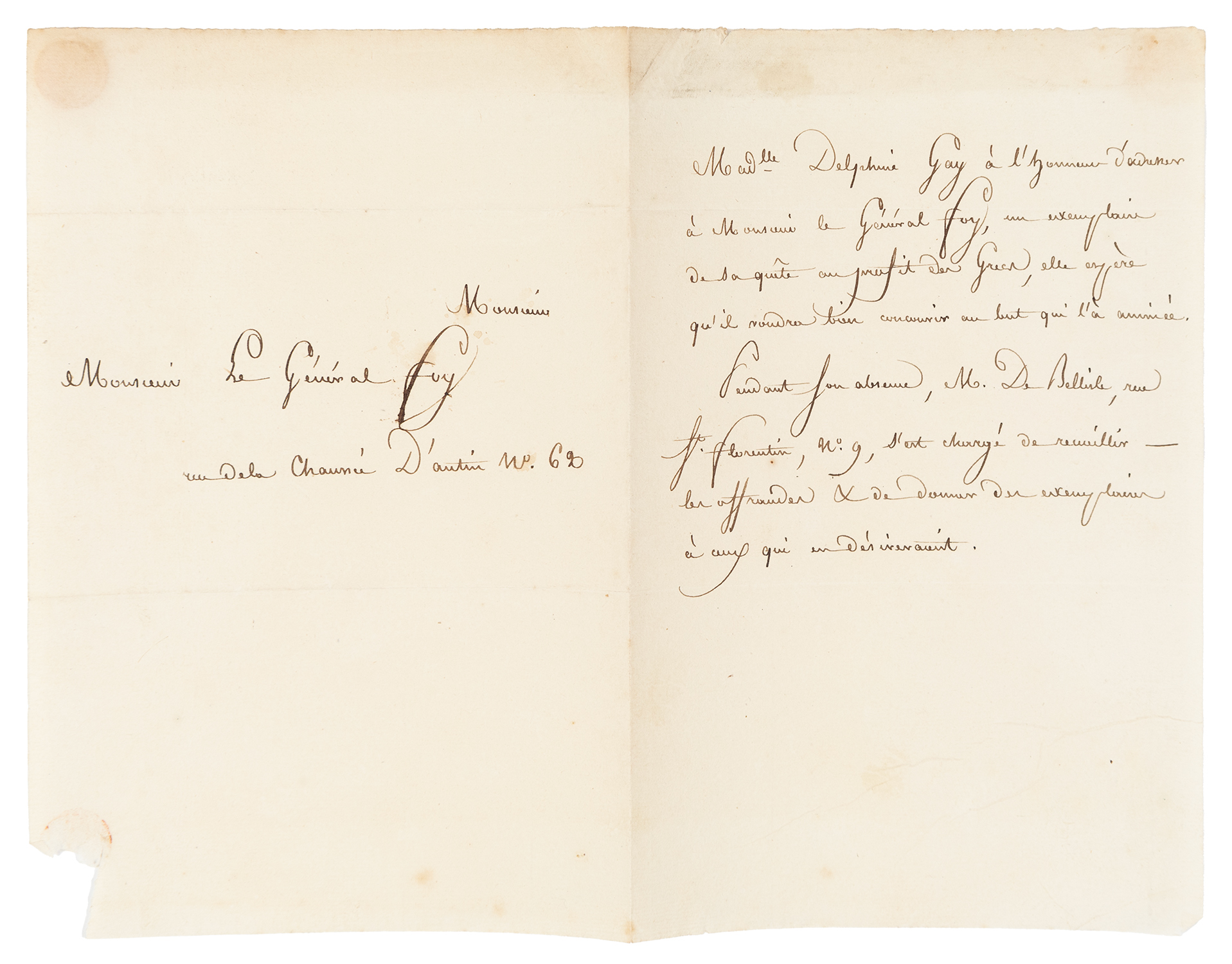 Τιμή εκτίμησης: € 300 - 4001 σελίδα, 185 x 118 mm. • «...Madlle DelphineGay a l’honneur d’adresser à Monsieur leGeneral Foy, un exemplaire de la quête au profit des Grecs, elle espère qu’il voudra bien concourir au but qui l’a animée. Pendant son absence, M. de B[;], rue St. Florentin, no 9, s’est chargé de recueillir les offrandes & de donner des exemplaires à ceux qui en désireraient». («Η δεσποινίδα Delphine Gay έχει την τιμή να στείλει στον Στρατηγό Foy ένα αντίτυπο του La quête au profit des Grecs προς όφελος των Ελλήνων, ελπίζοντας πως θα ήθελε να συνδράμει στον σκοπό που την ενέπνευσε. Κατά την απουσία της ο κ. B[;], οδός St. Florentin 9, έχει αναλάβει να μαζέψει τις προσφορές και να δώσει αντίτυπα σε όσους το επιθυμούν»).