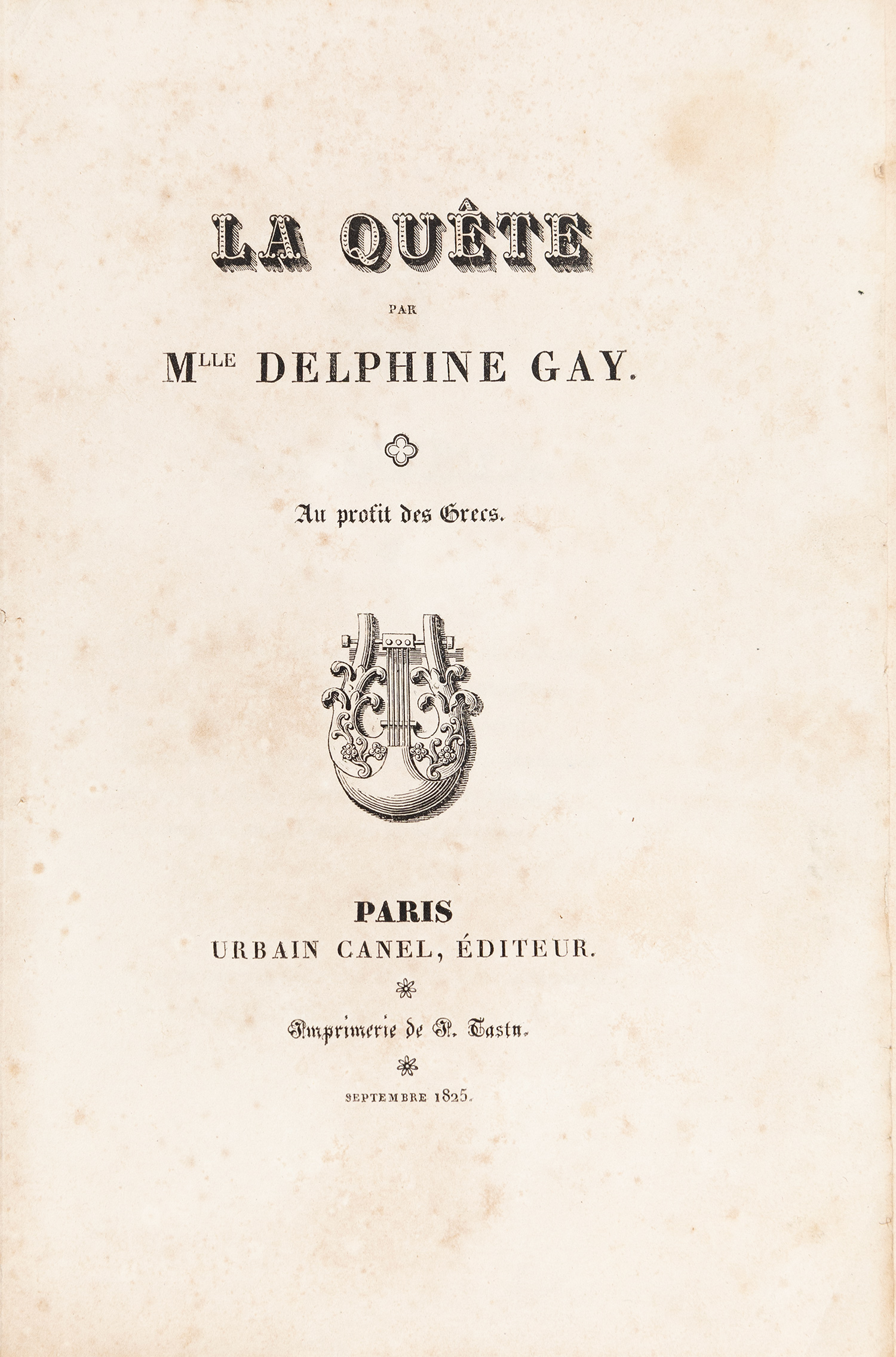 [μαζί αντίτυπο του έργου της:] La quête. Αu profit des Grecs. Παρίσι, Urbain Canel, 1825. • ΠΡΩΤΗ ΕΚΔΟΣΗ. 8ο, 8 σ. Αρχικά εξώφυλλα. Droulia 1200. (2)