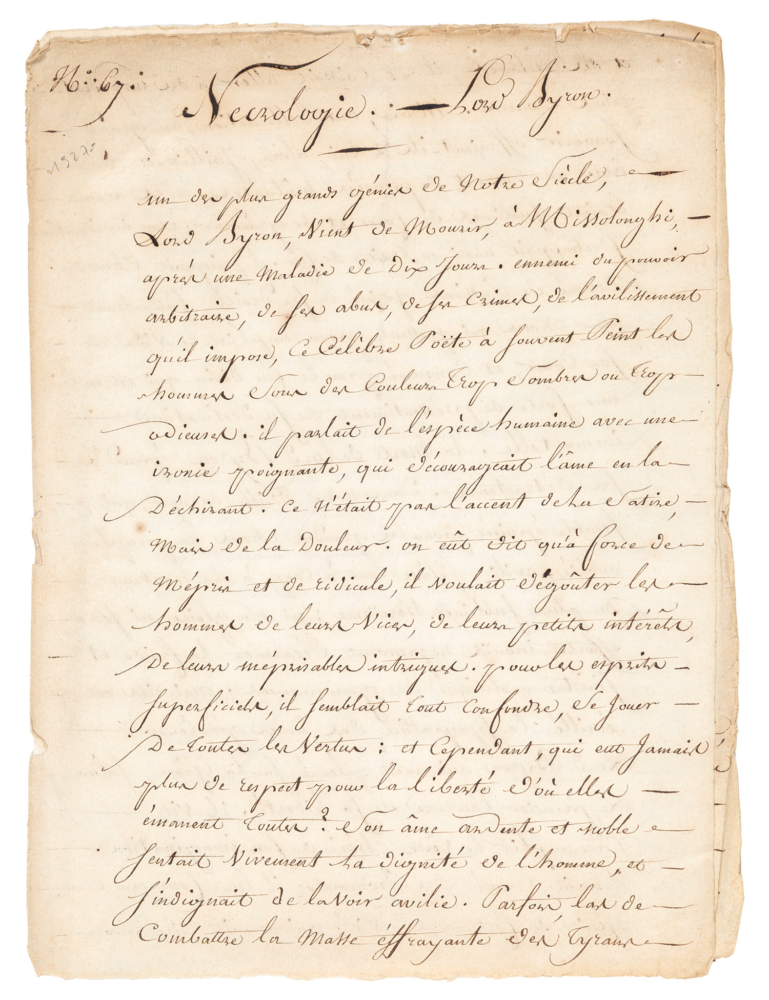 Αὐτόγραφο (πιθανώς) κείμενο - ἄρθρο της μέ τίτλο «Necrologie. — Lord Byron».